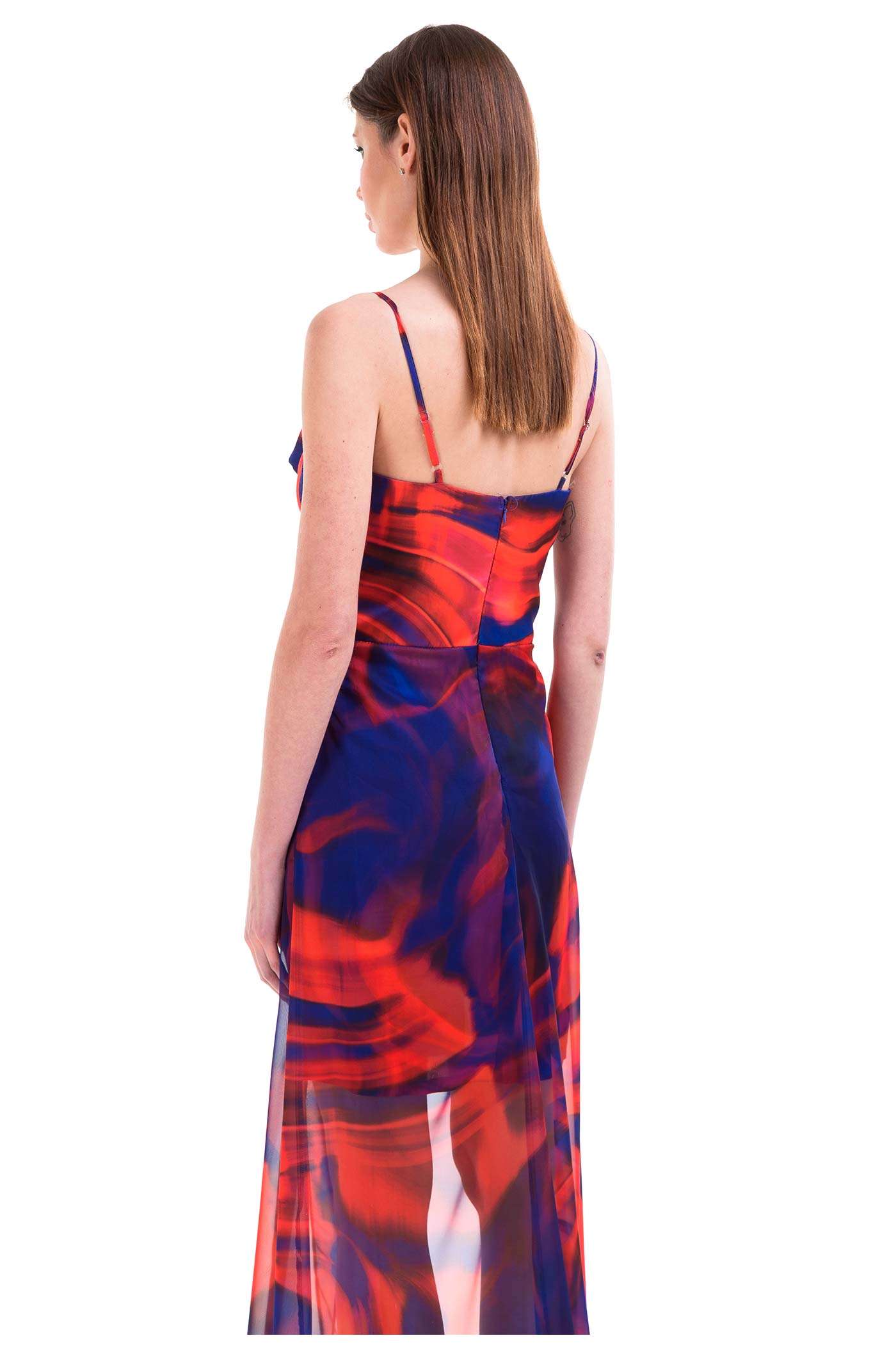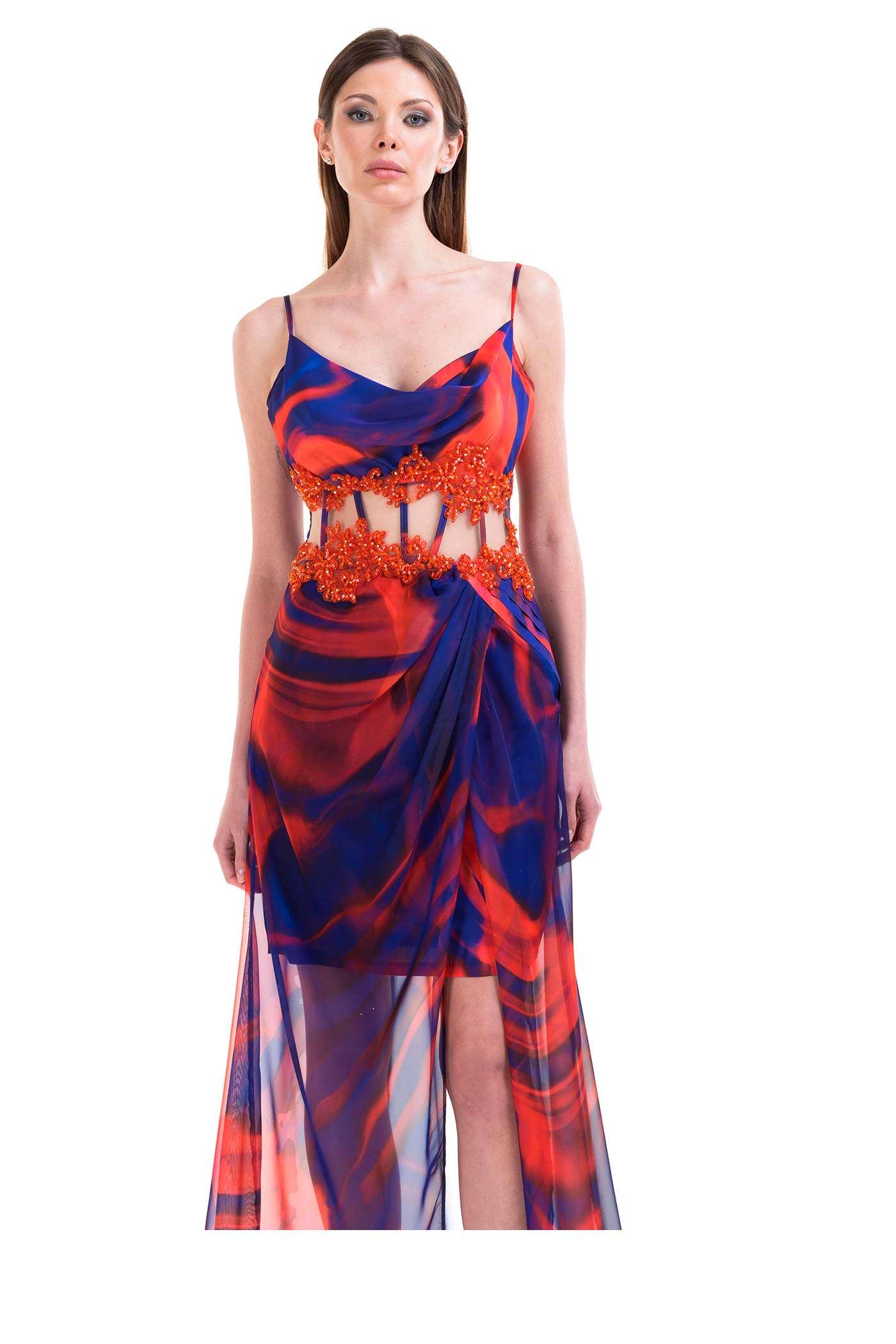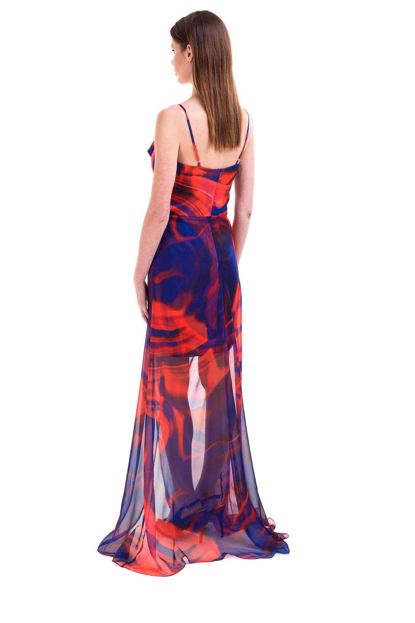 Abito da cerimonia con fantasia. Un abito leggero dal design femminile che gioca con il movimento dello chiffon. In vita, il pizzo ed il dettaglio delle stecche a vista rendono questo abito unico. La lunga e sinuosa gonna si apre lateralmente in uno spacco. - Additional Information