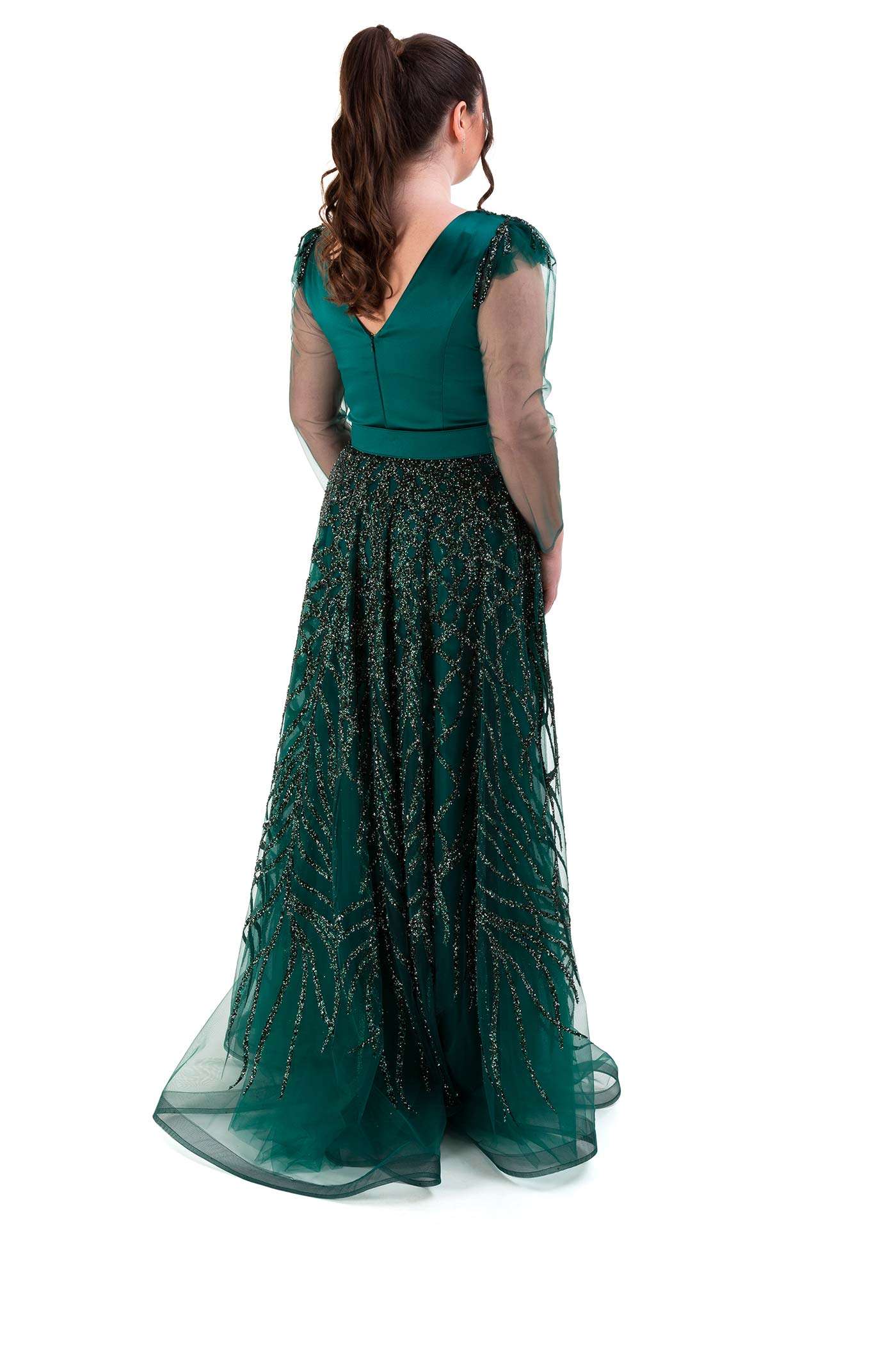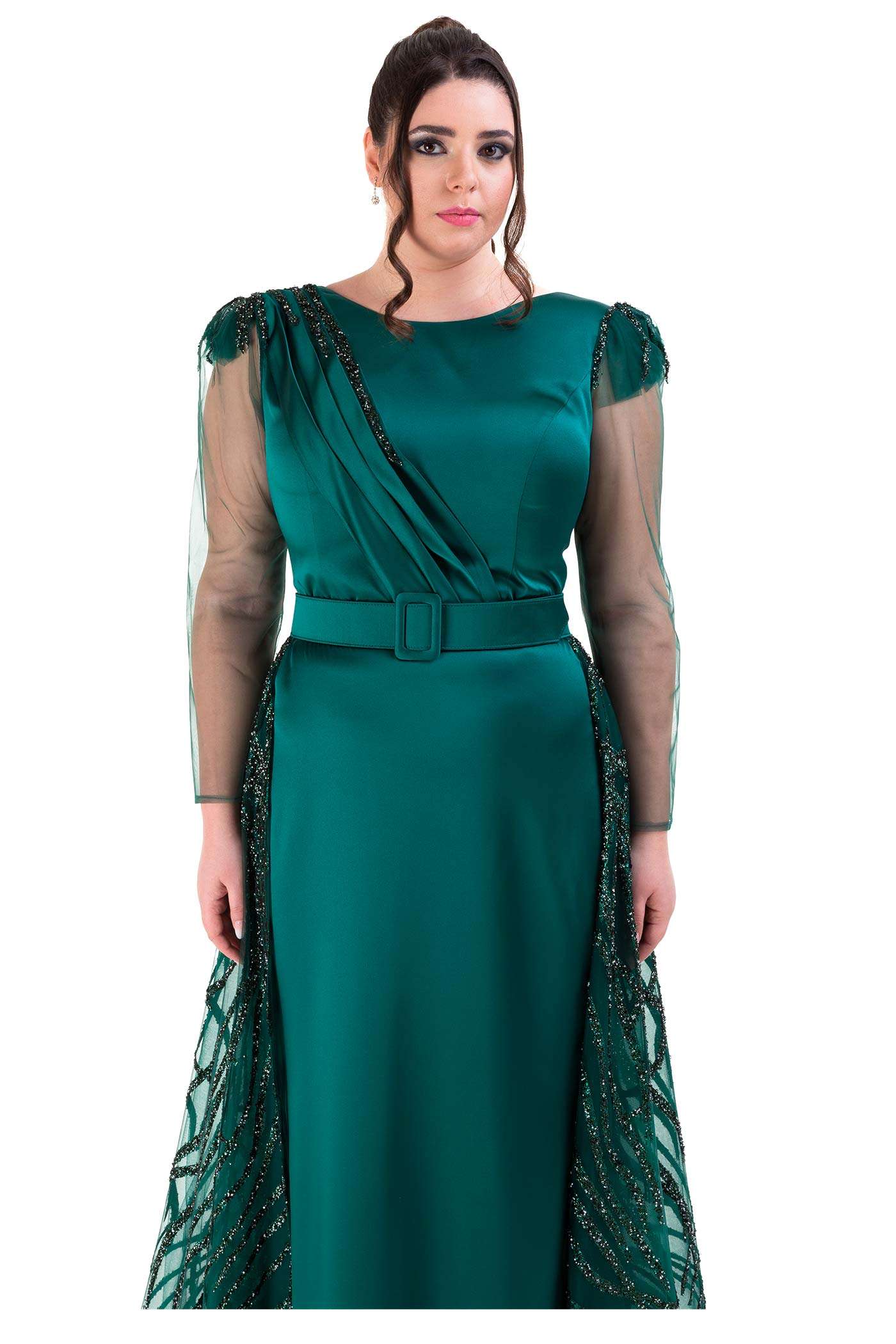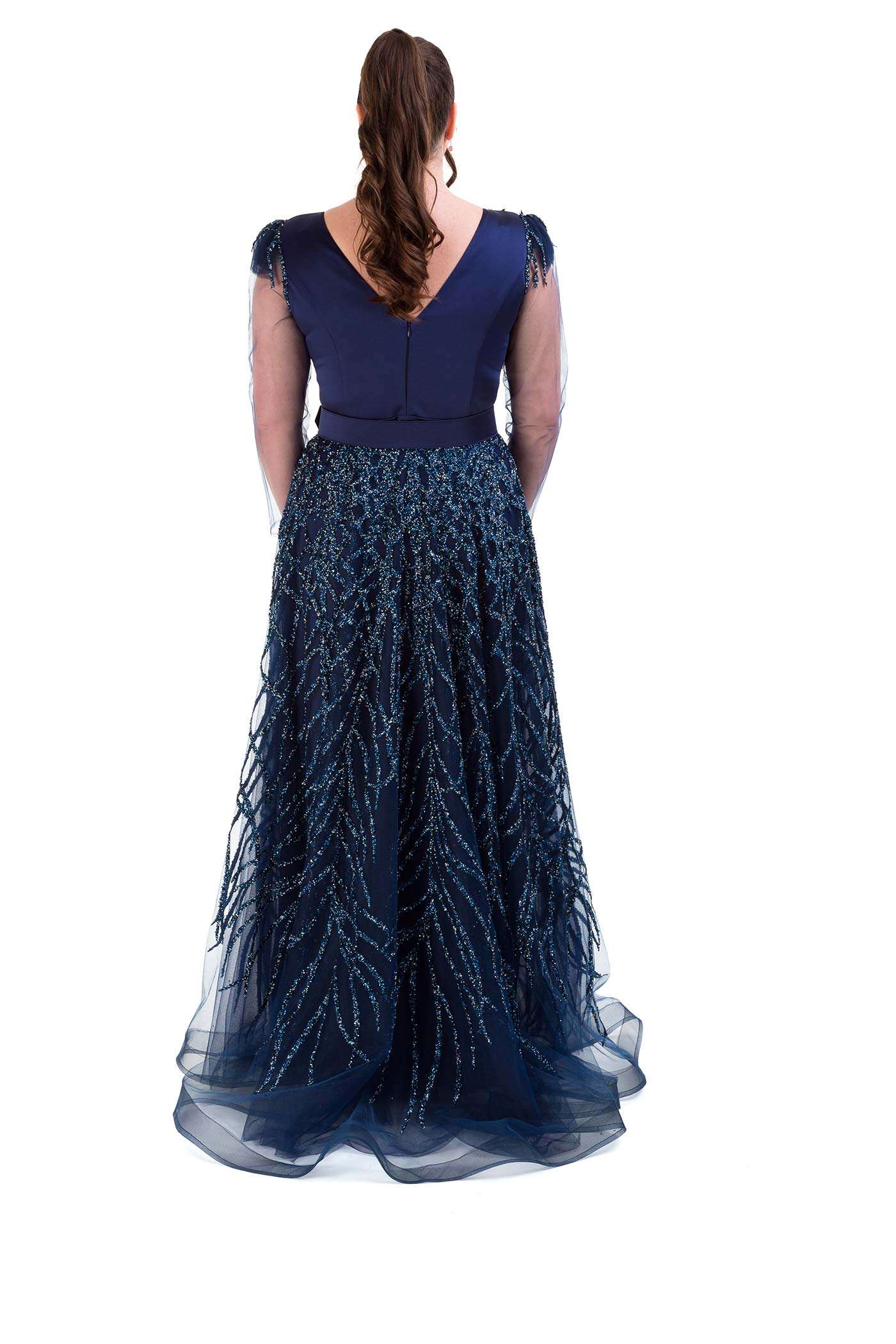 Abito da cerimonia in Raso con scollo a barca dallo stile raffinato. Un modello con le maniche lunghe in tulle ed una cinta che sottolinea il punto vita. La sopragonna è luminosa e voluminosa. - Additional Information