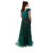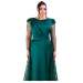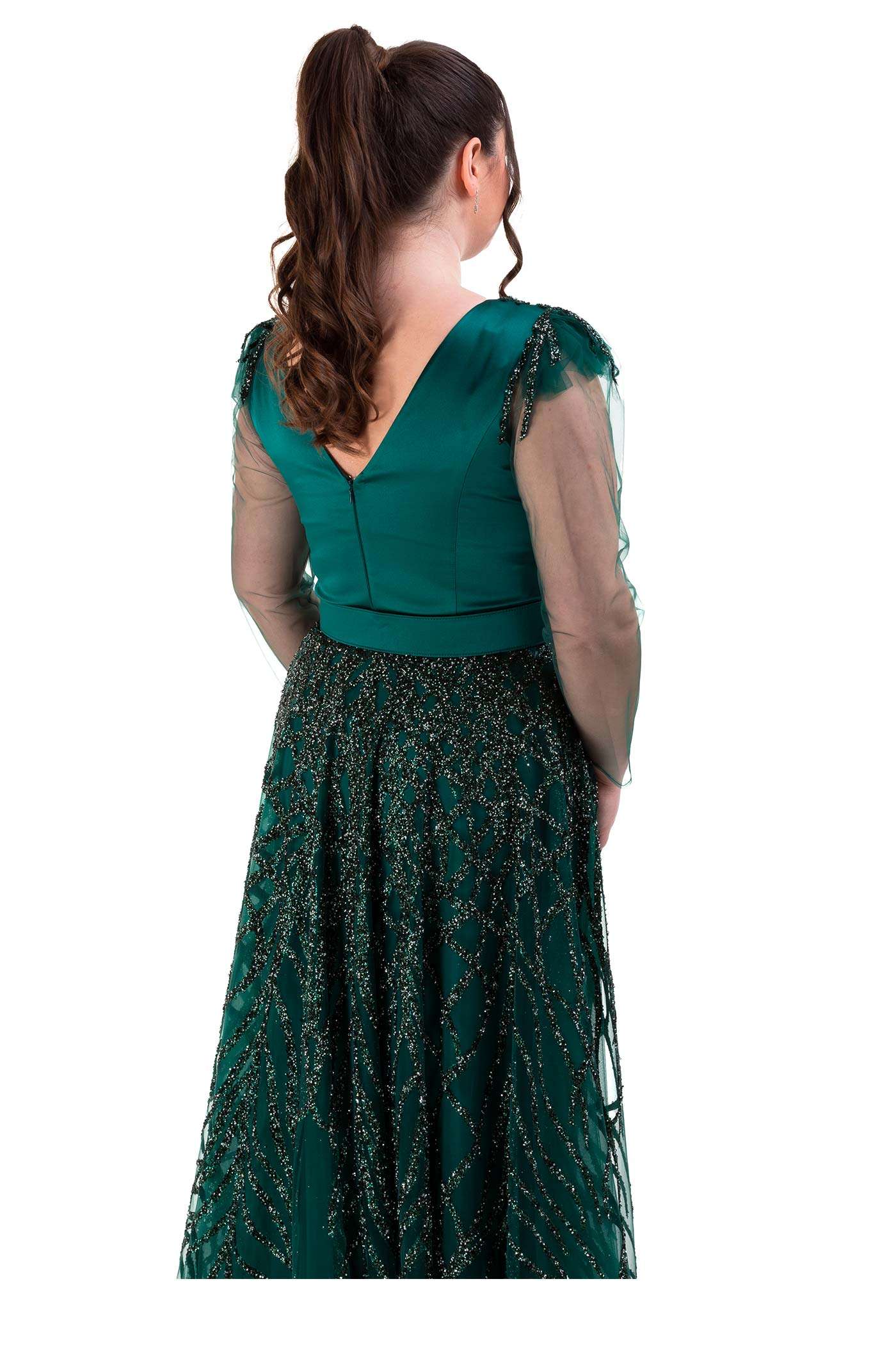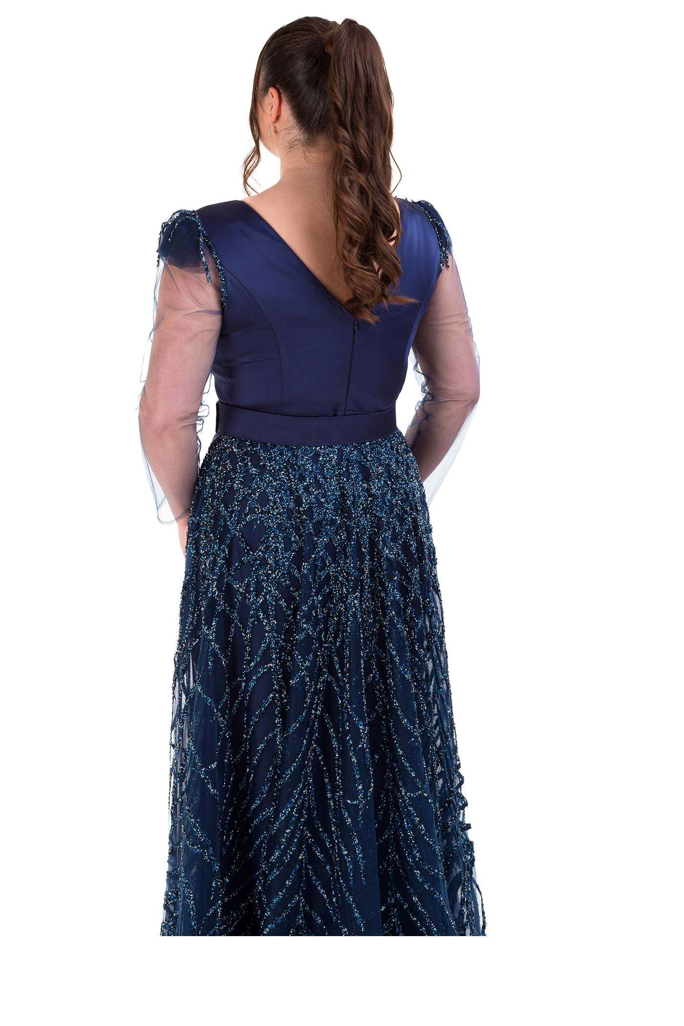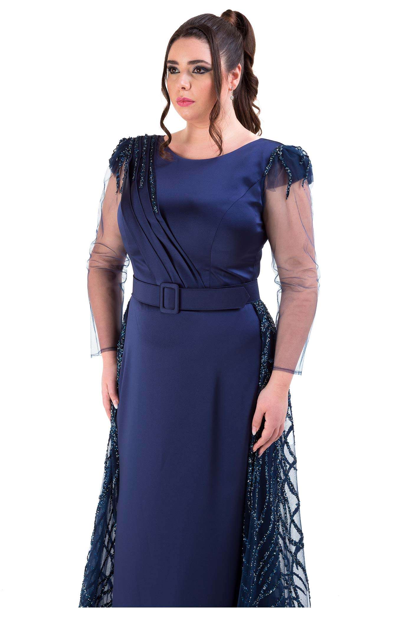 Abito da cerimonia in Raso con scollo a barca dallo stile raffinato. Un modello con le maniche lunghe in tulle ed una cinta che sottolinea il punto vita. La sopragonna è luminosa e voluminosa. - Additional Information