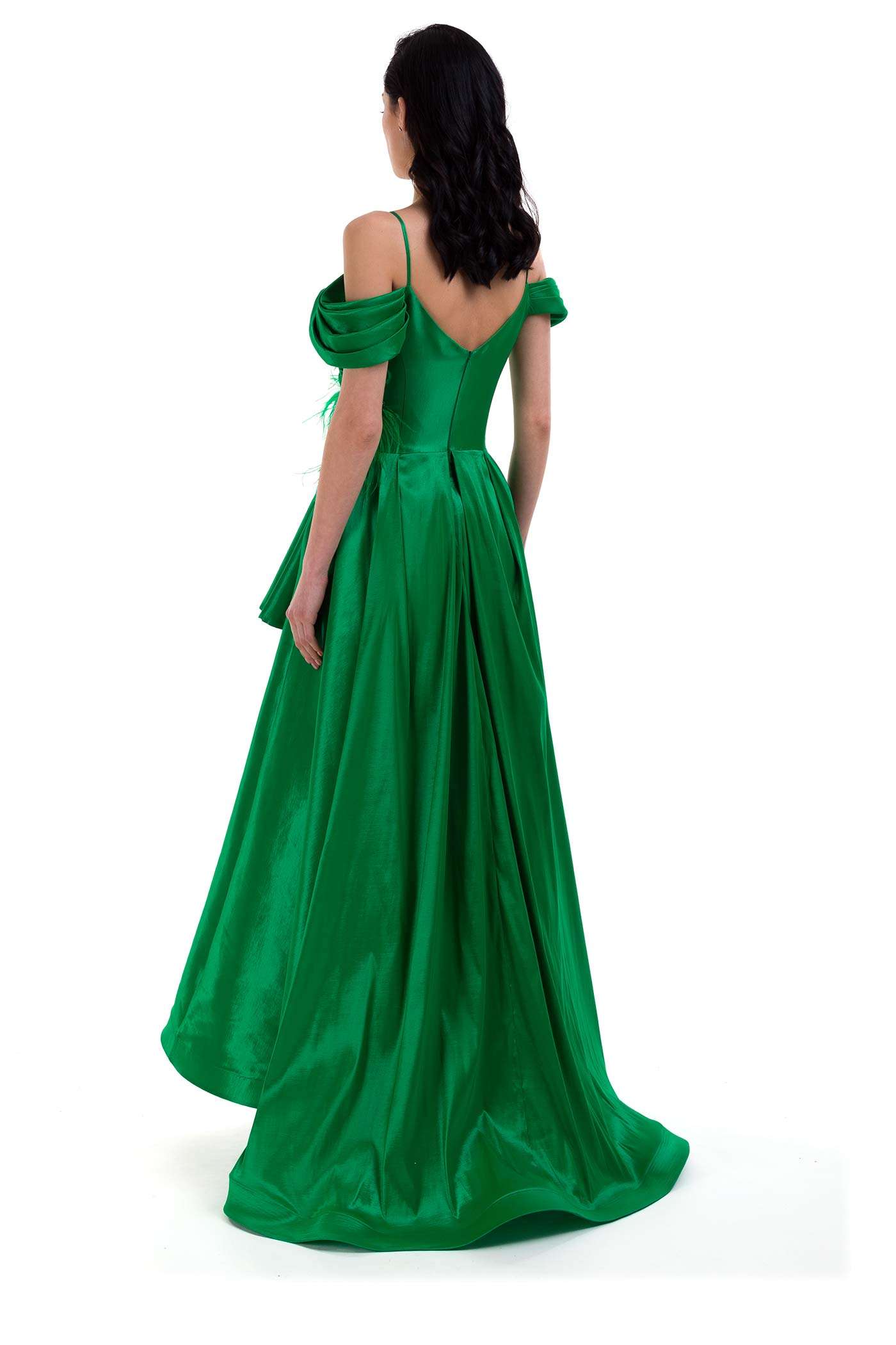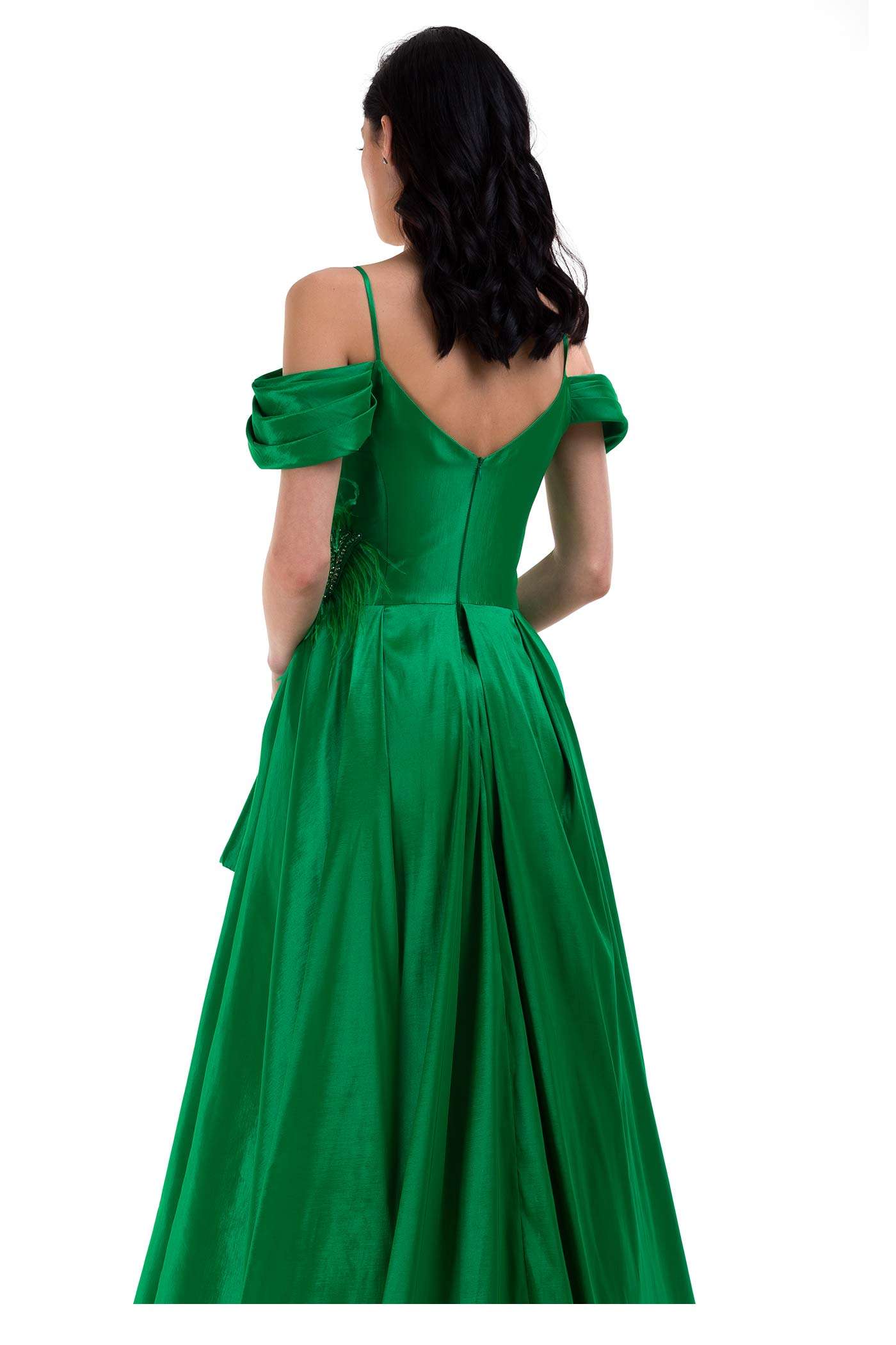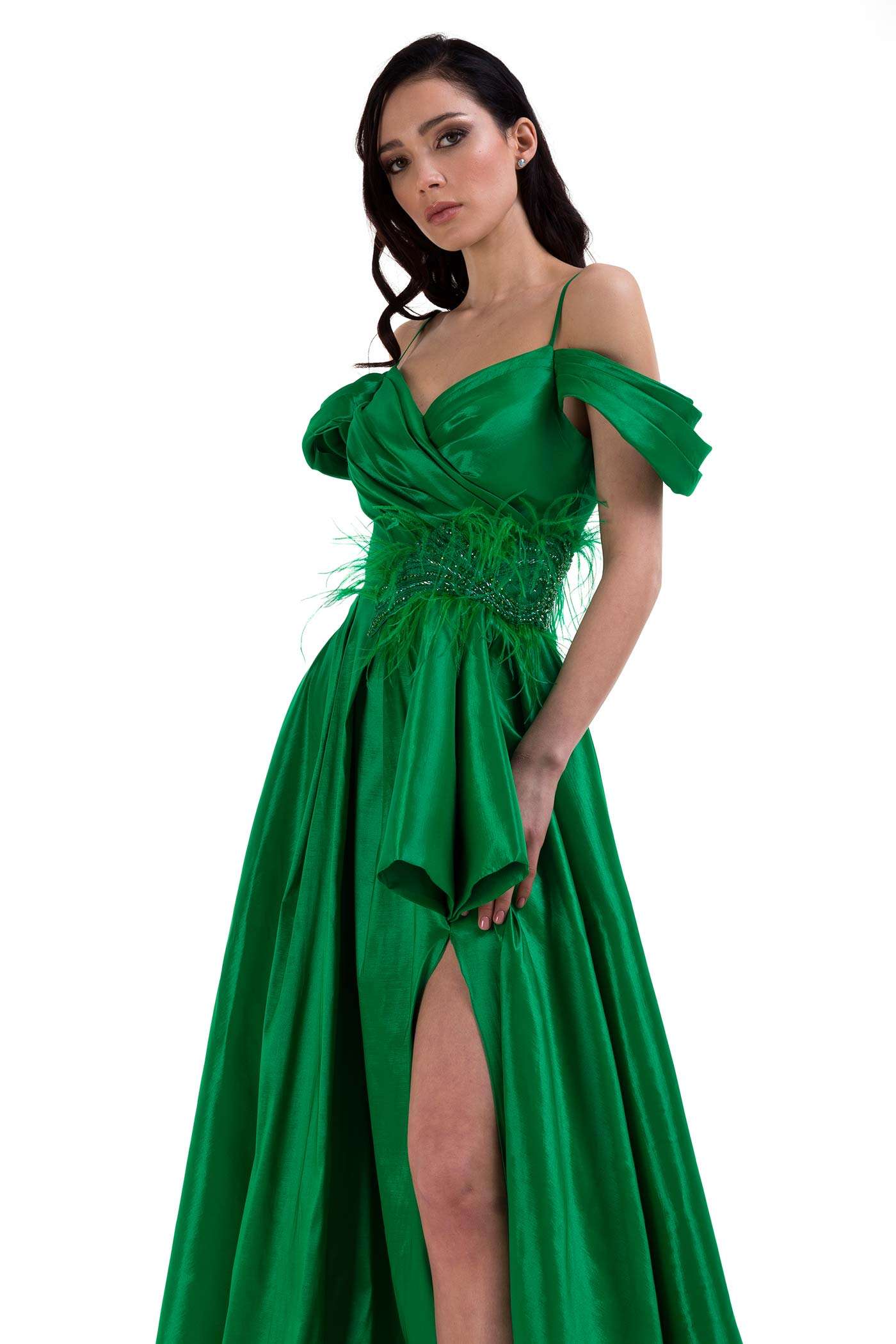 Abito elegante da cerimonia in Taffetà. Il tessuto luminoso e la scollatura a cuore arricchiscono questo modello dalla linea ad A. Il punto vita viene sottolineato da un delicato ricamo con piume tono su tono. - Additional Information