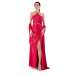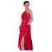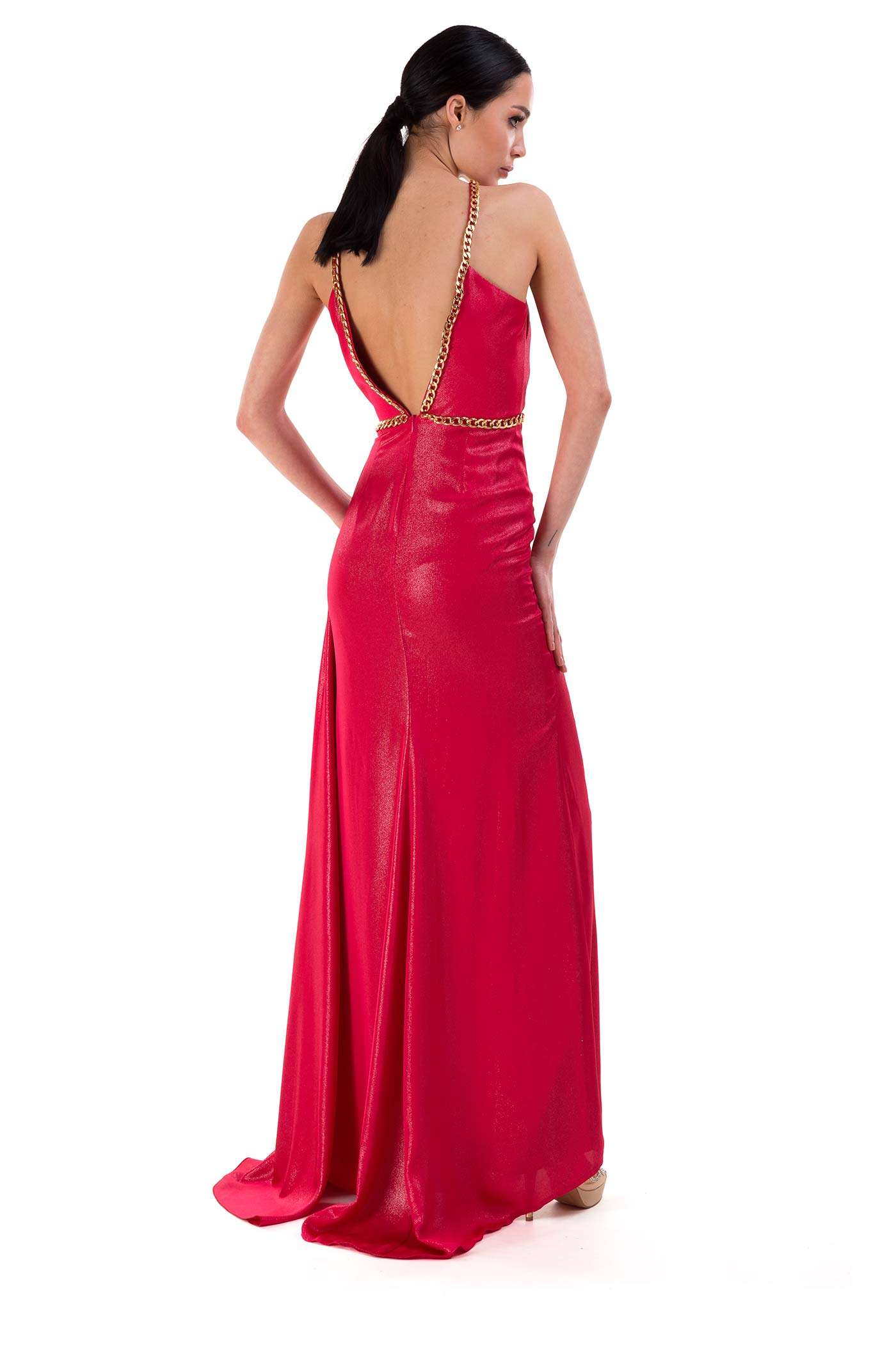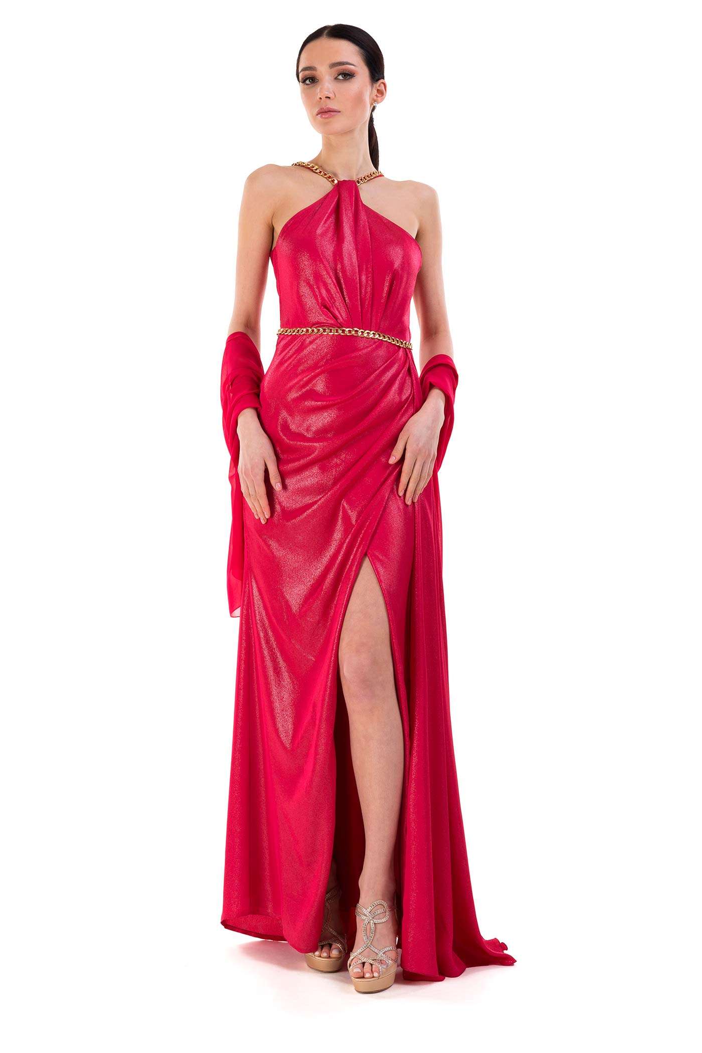 Abito elegante da cerimonia in Raso. Il tessuto luminoso e la scollatura all'americana ornata con catena oro arricchiscono questo modello dalla linea semplice e sinuosa. La lunga gonna si apre in un sensuale spacco laterale. - Additional Information