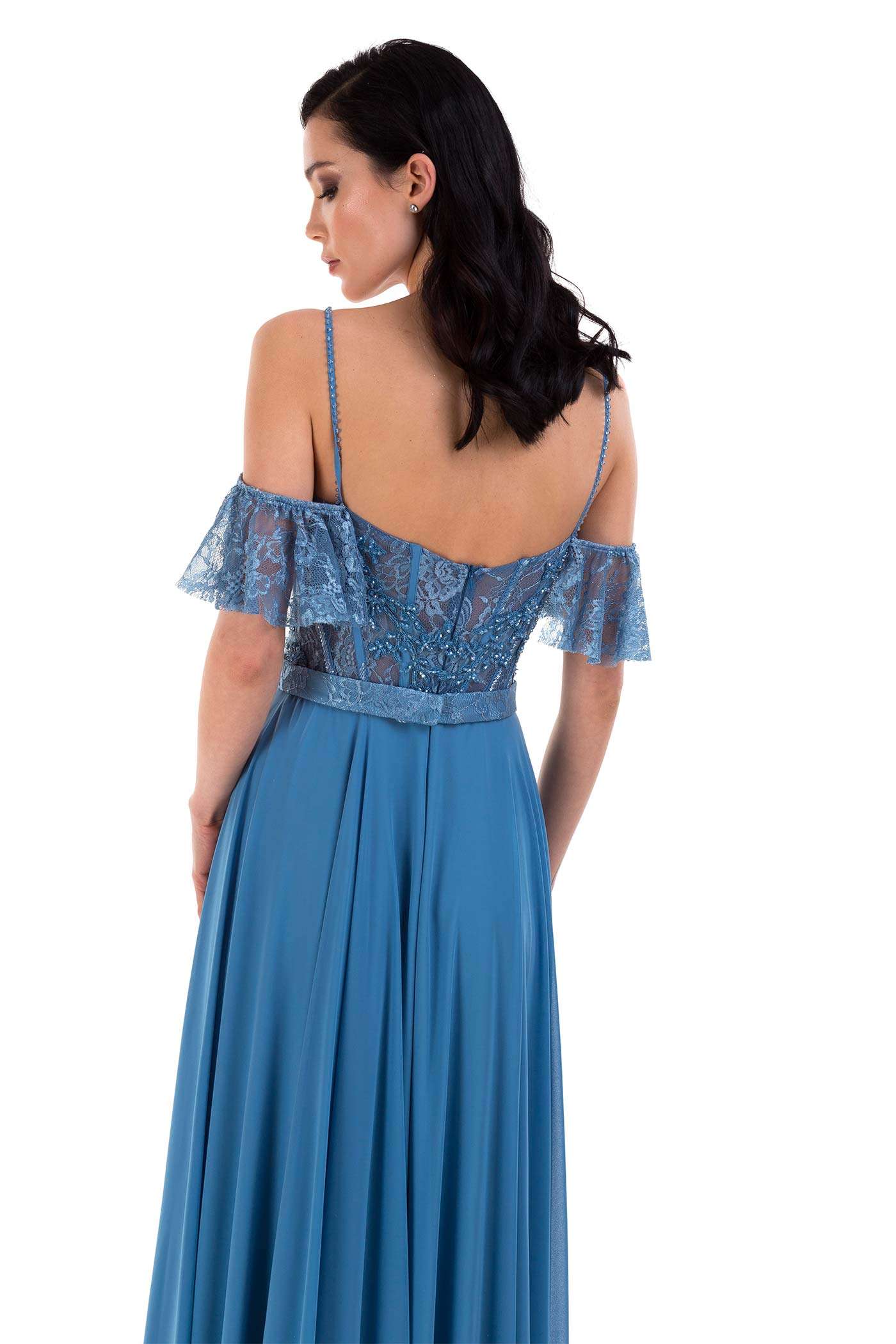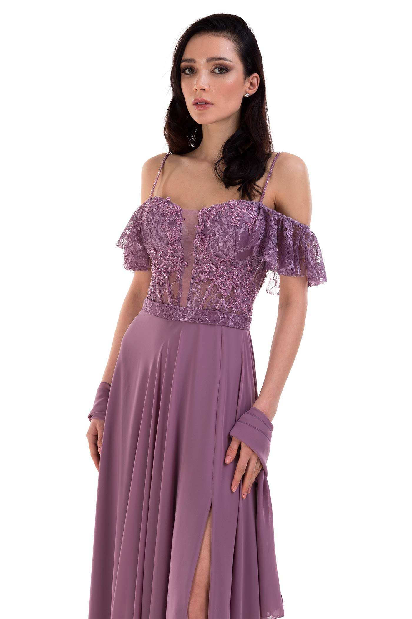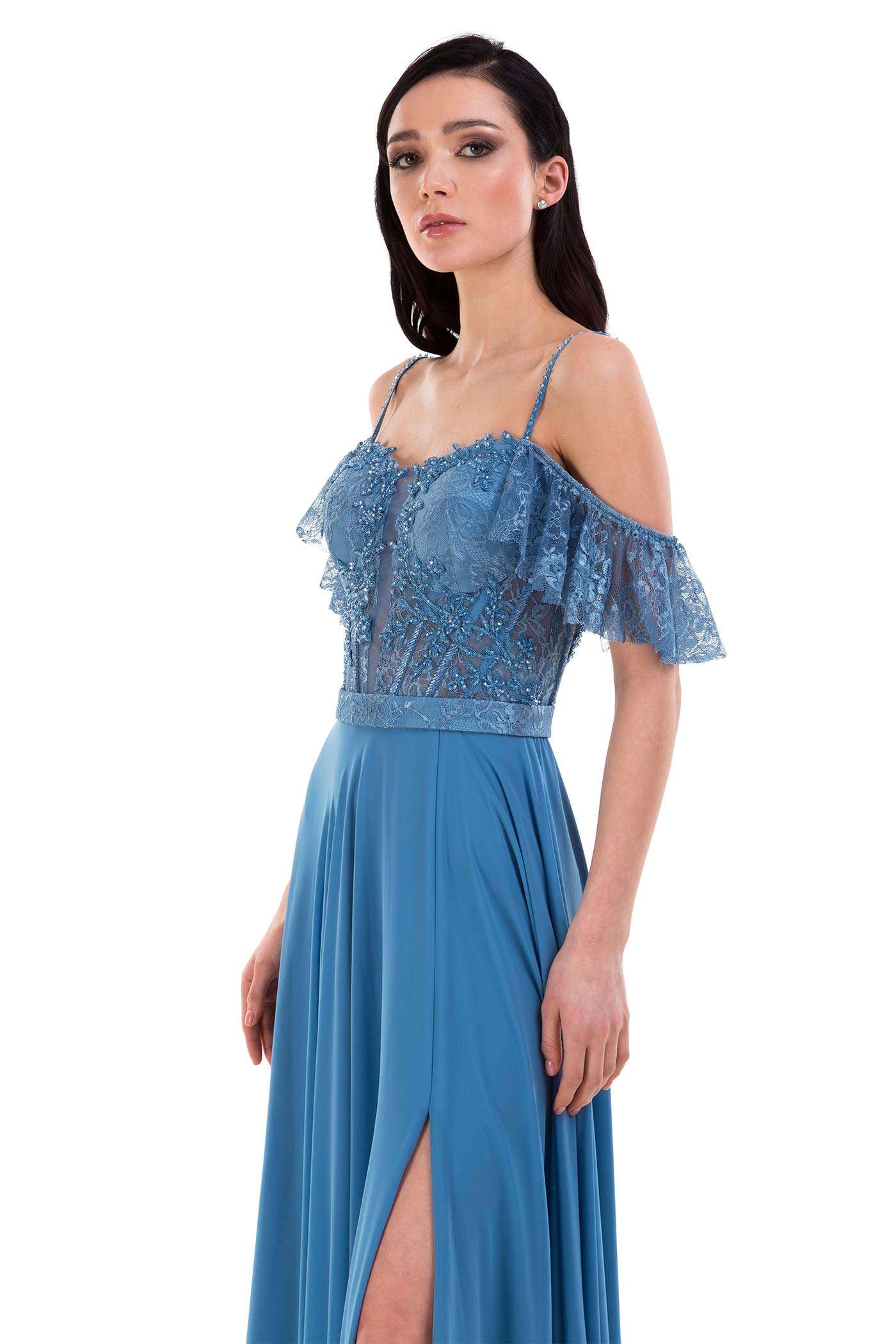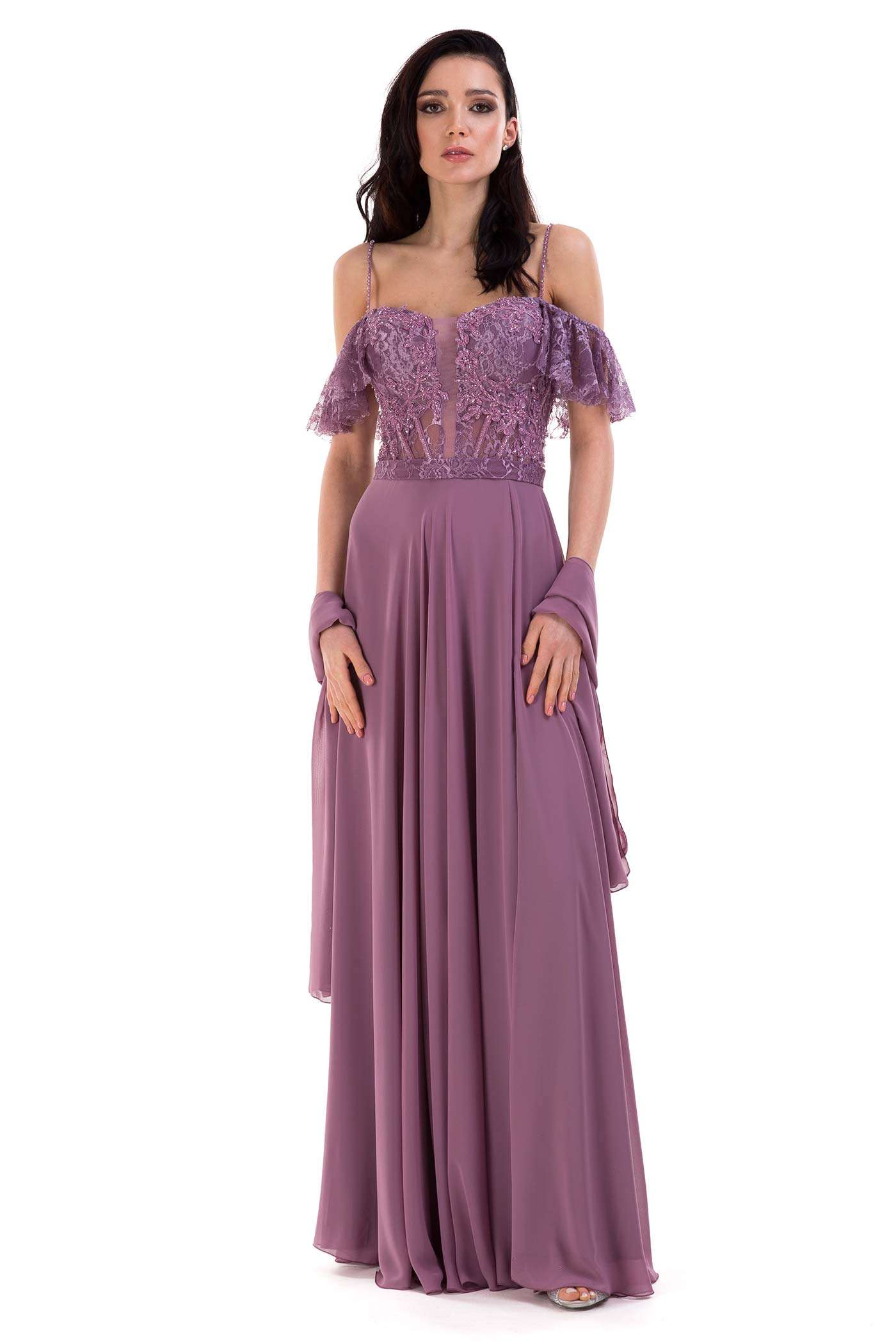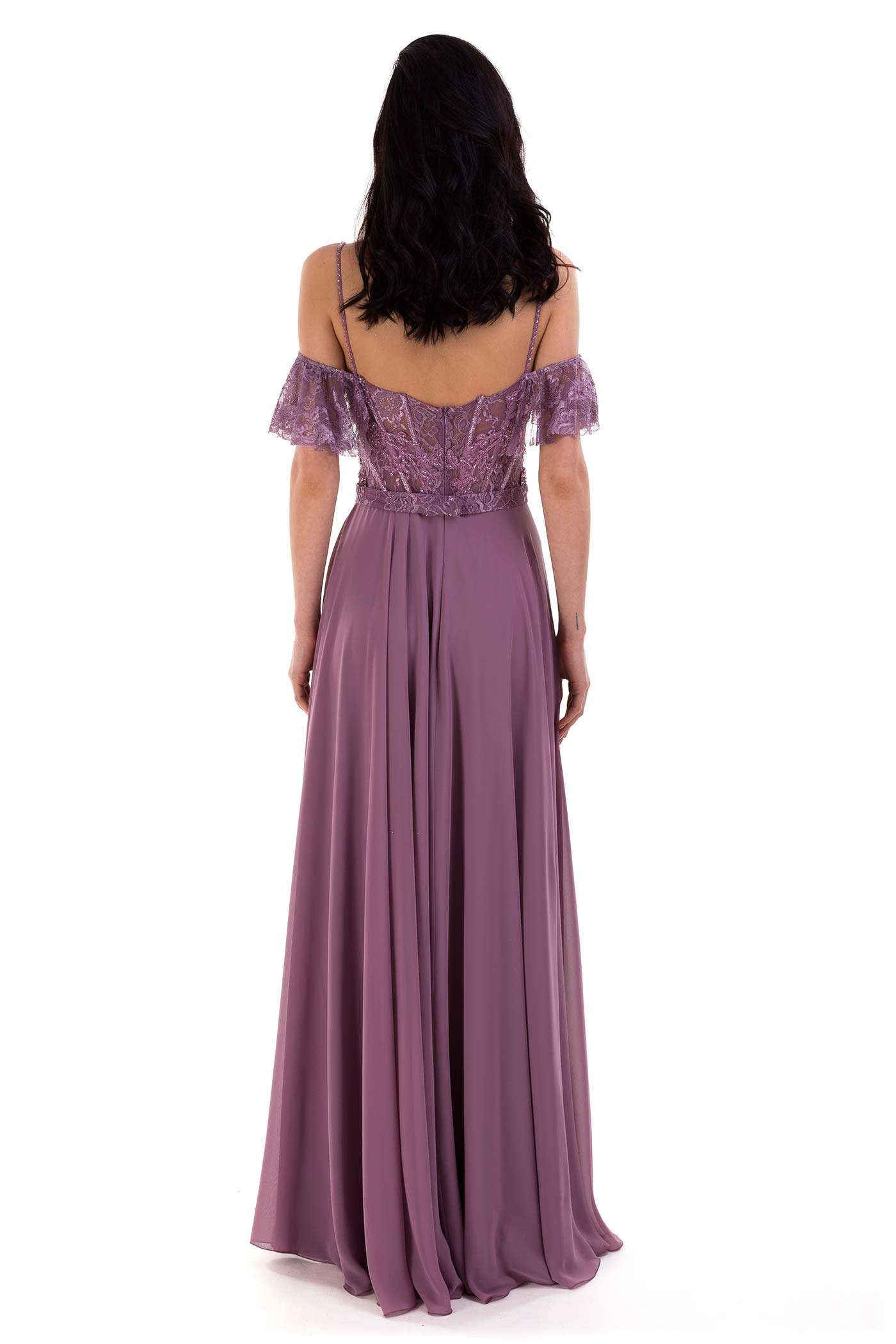 Abito da cerimonia dalla linea scivolata. Il pizzo e dei dettagli luminosi tono su tono ornano il corpetto e le spalline di questo raffinatissimo modello. La gonna in georgette si apre in un delicato spacco laterale. - Additional Information