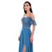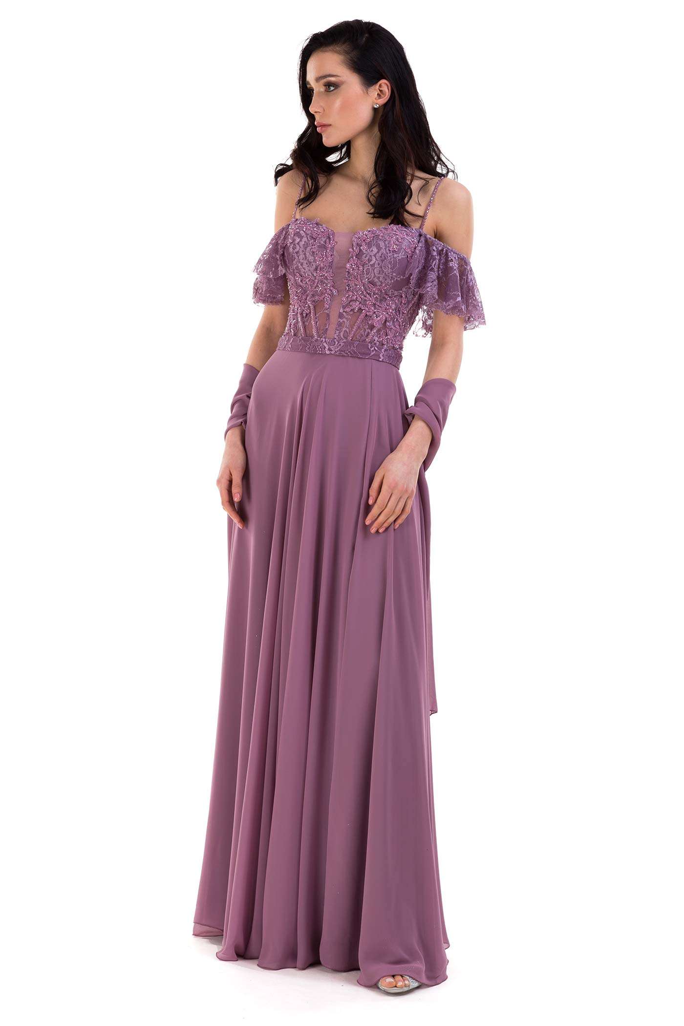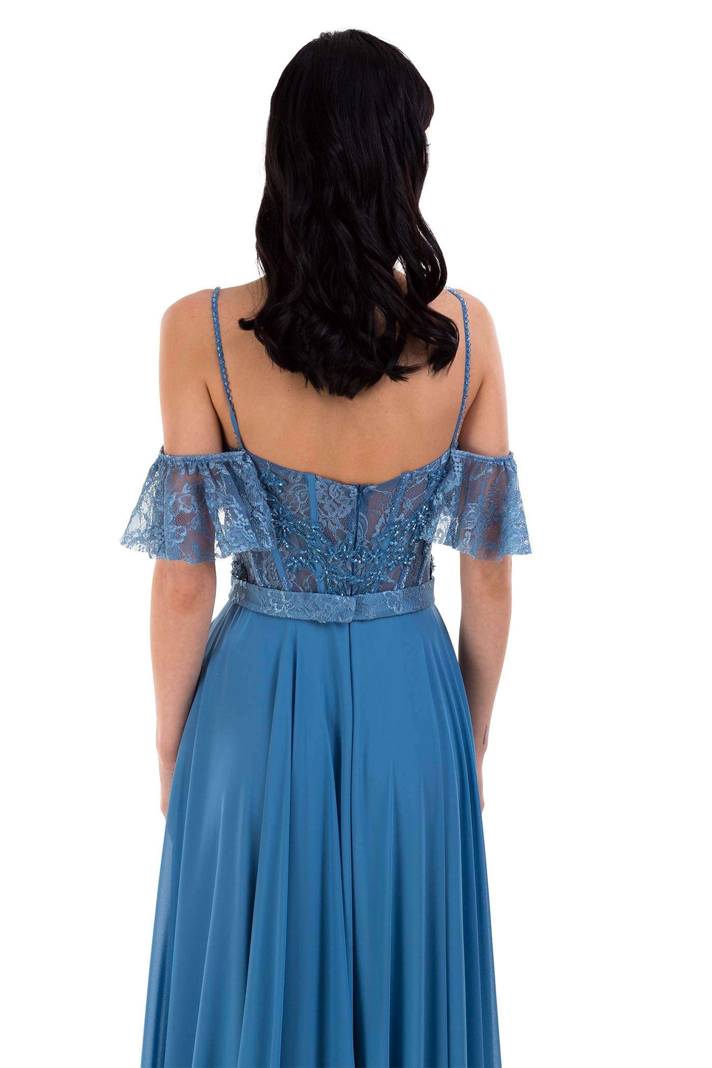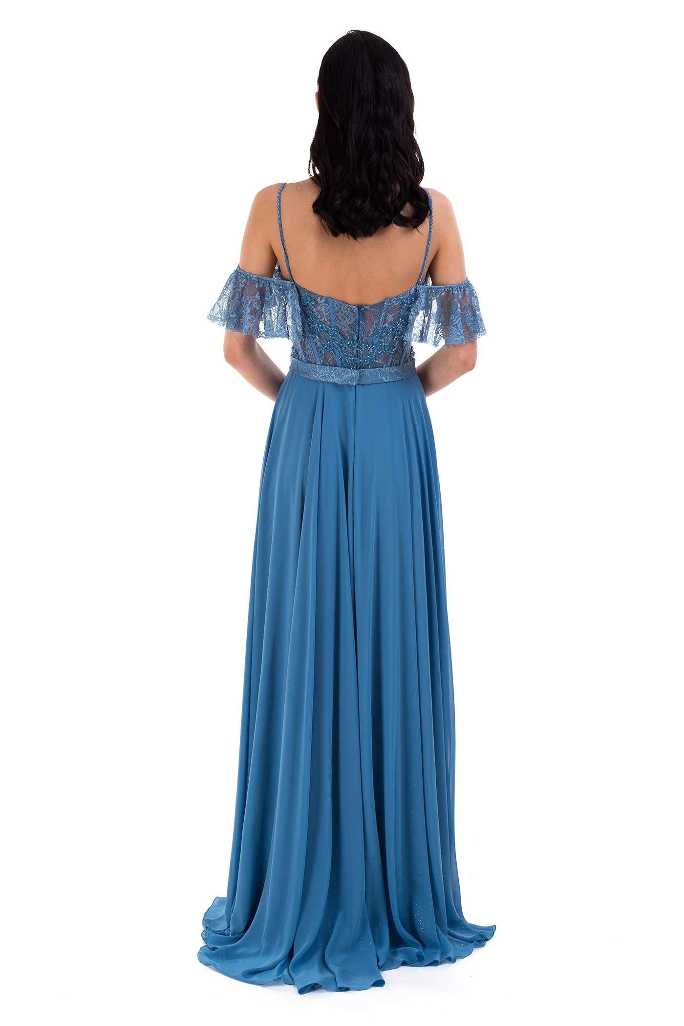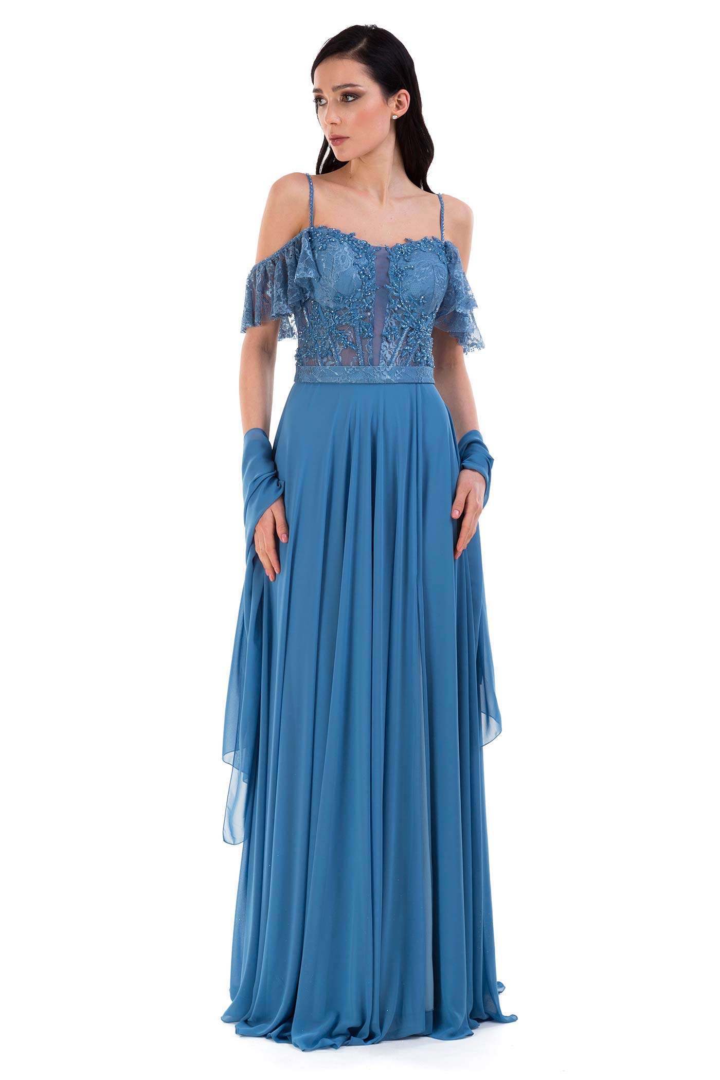 Abito da cerimonia dalla linea scivolata. Il pizzo e dei dettagli luminosi tono su tono ornano il corpetto e le spalline di questo raffinatissimo modello. La gonna in georgette si apre in un delicato spacco laterale. - Additional Information