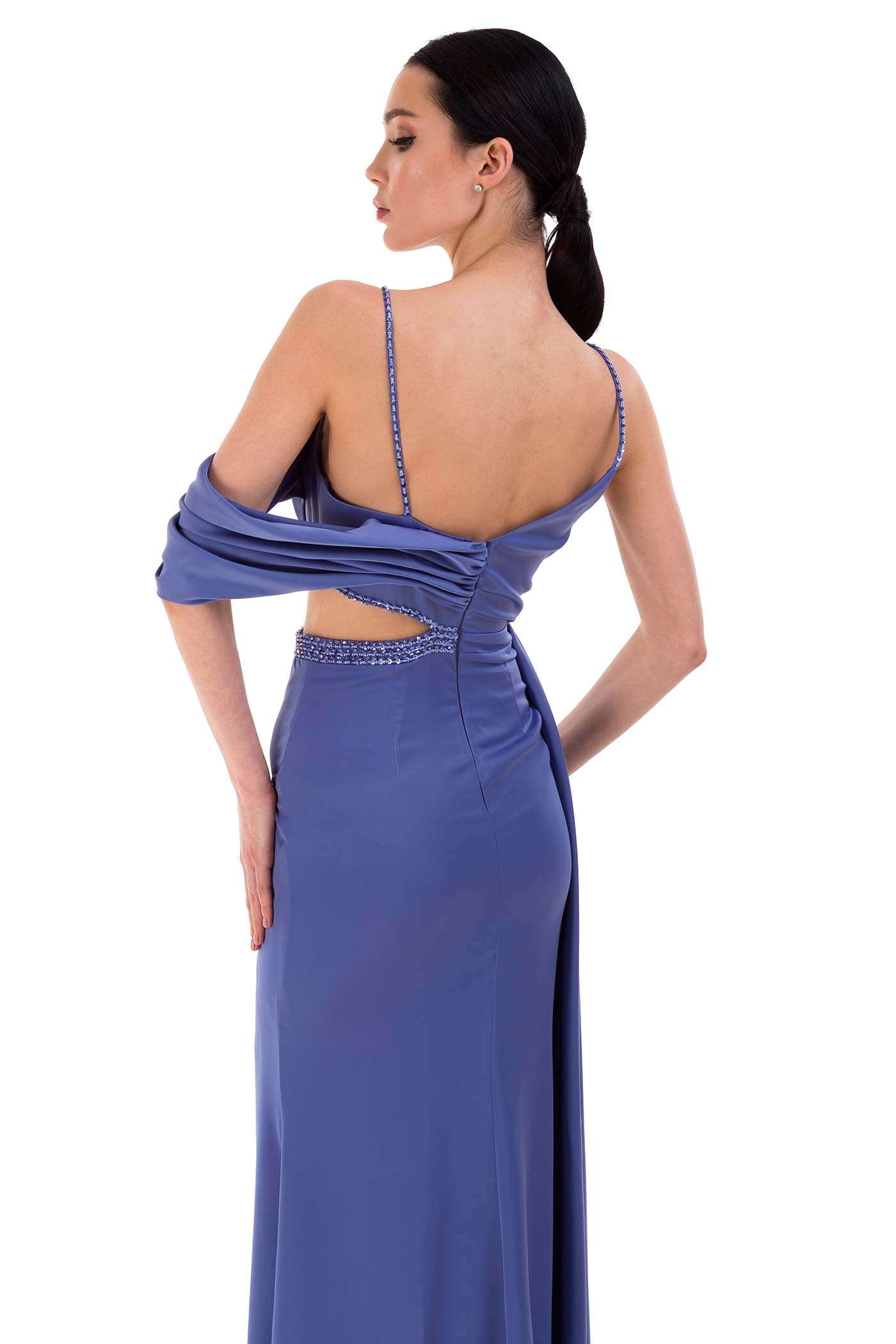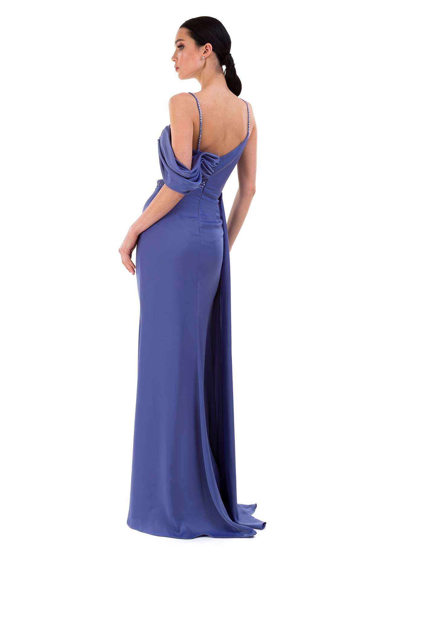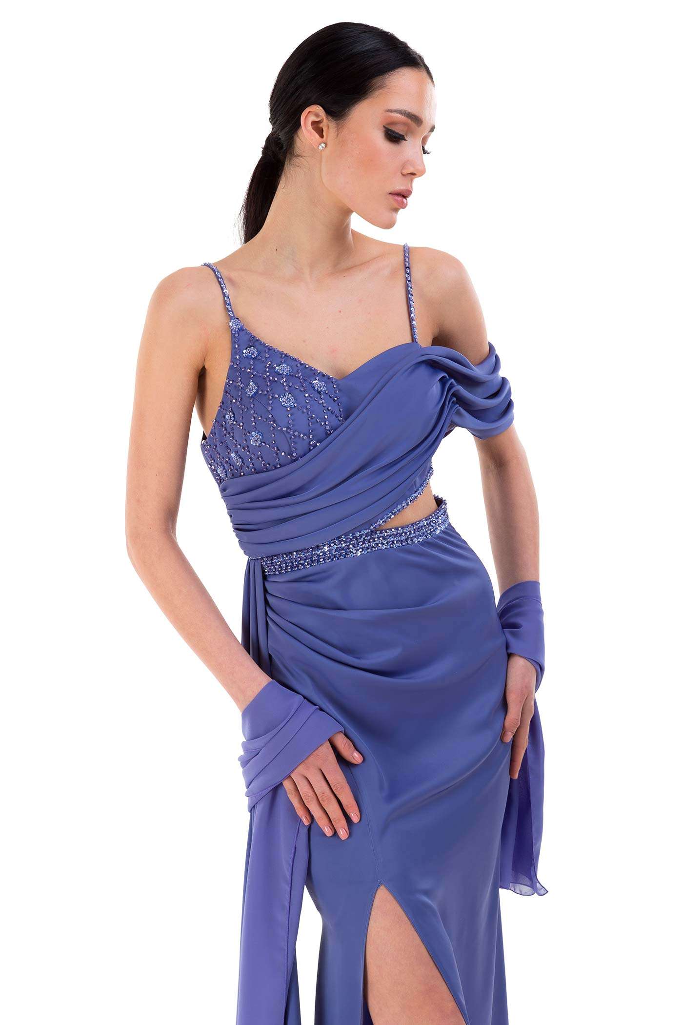 Abito da cerimonia asimmetrico. Questo modello è reso unico dal ricamo a rete che, insieme a dei piccoli fiori, orna una parte del corpetto. Un' importante arricciatura accompagna il tessuto verso un sensuale spacco laterale. - Additional Information