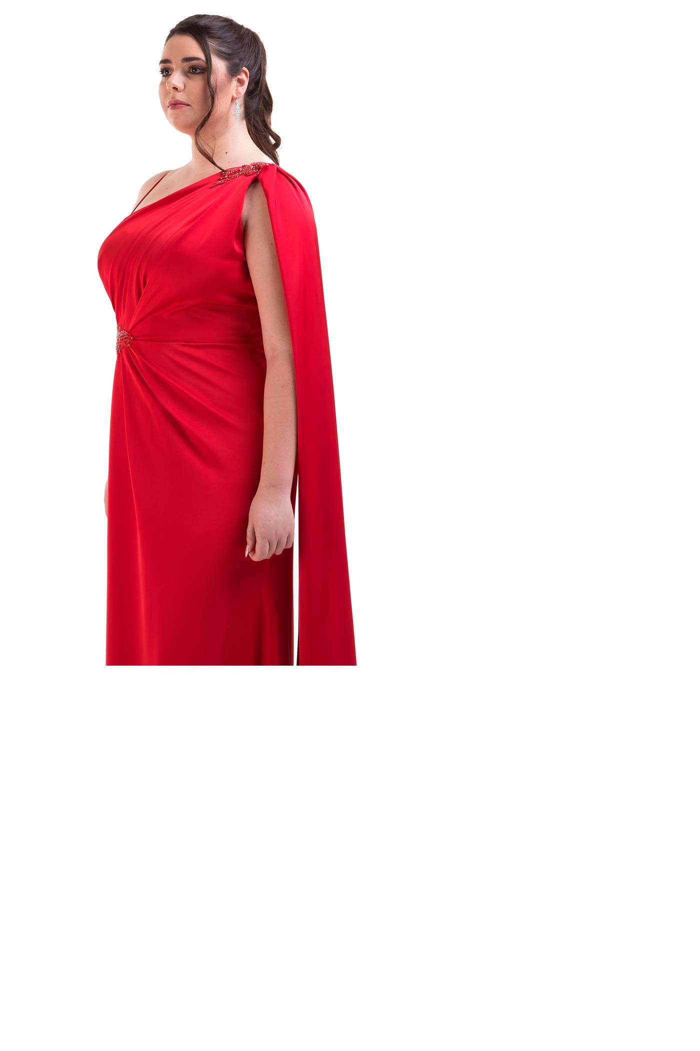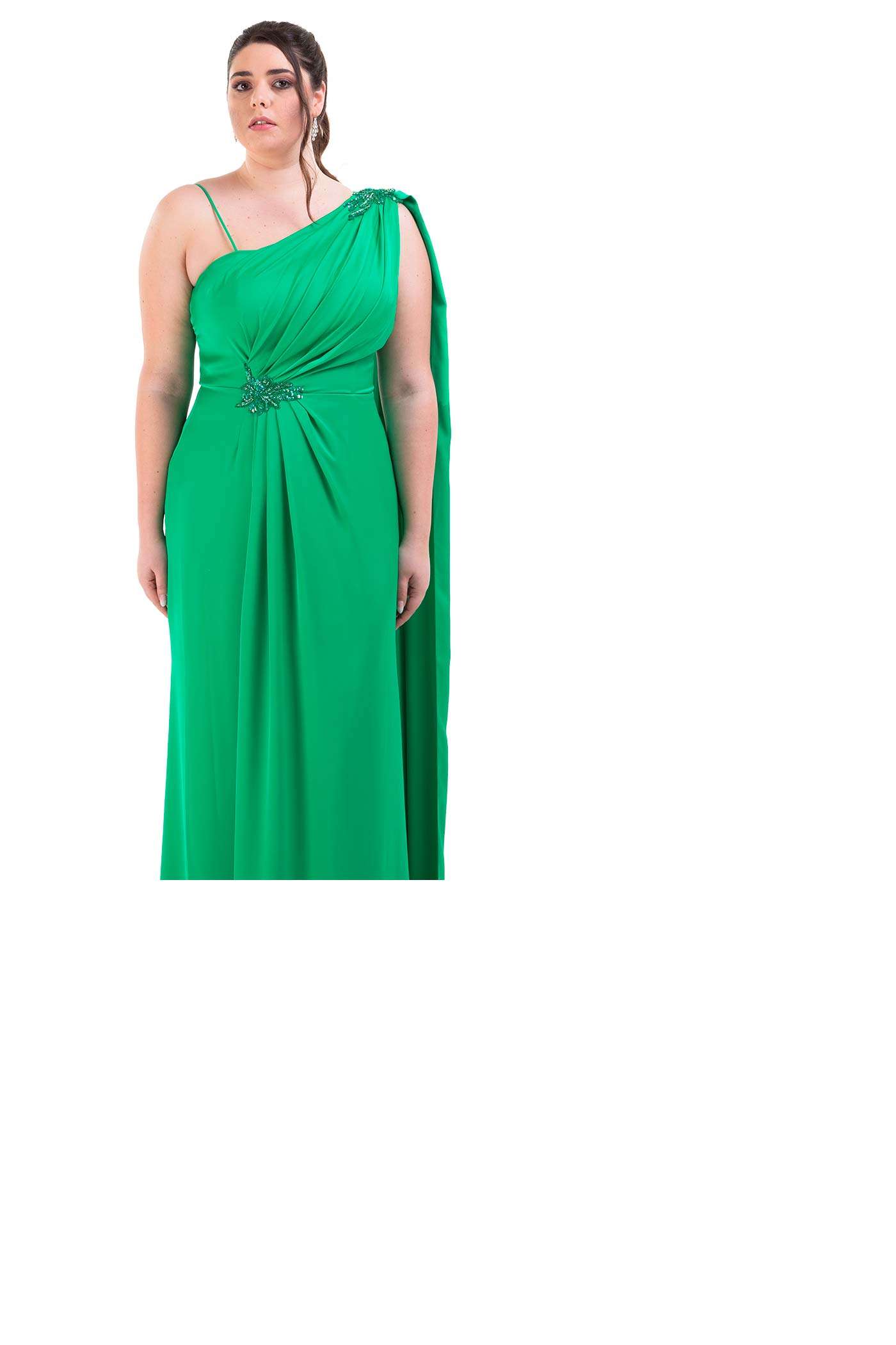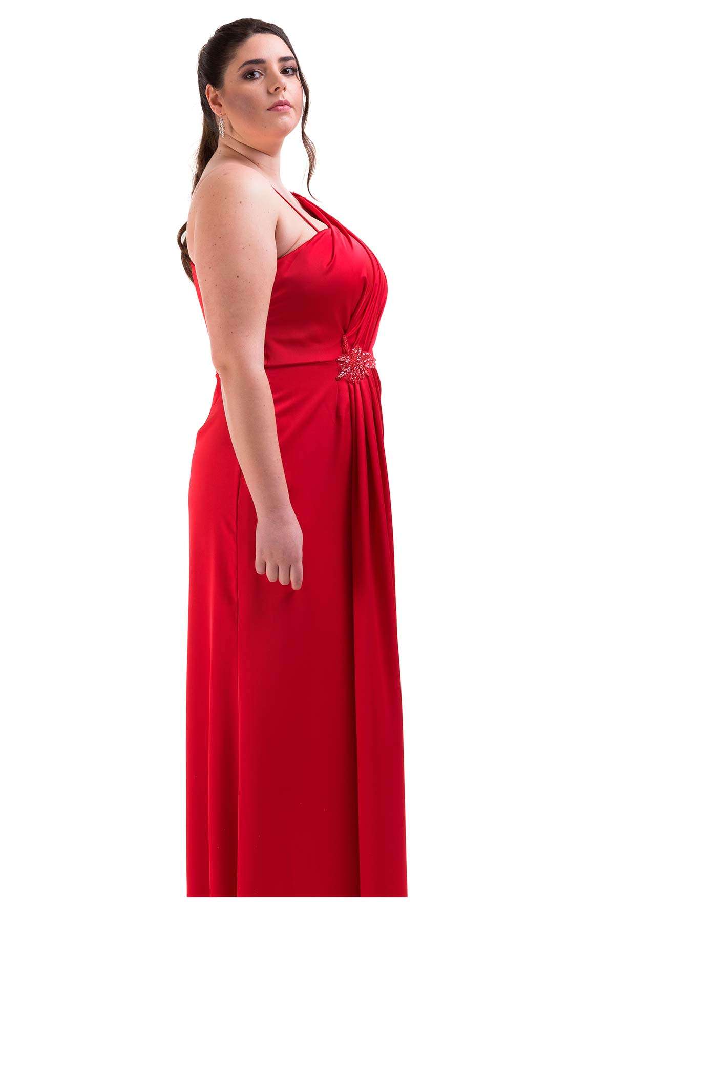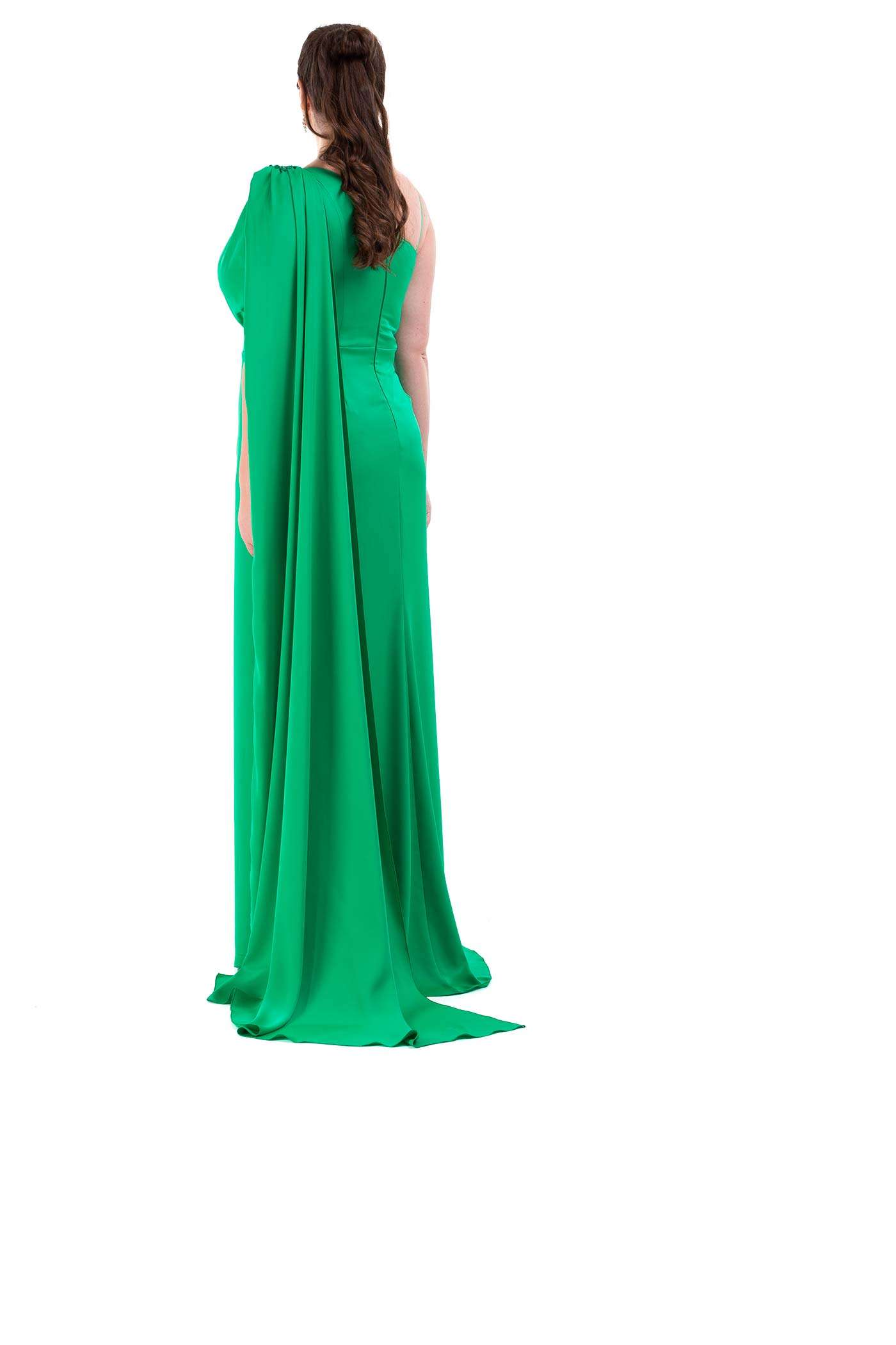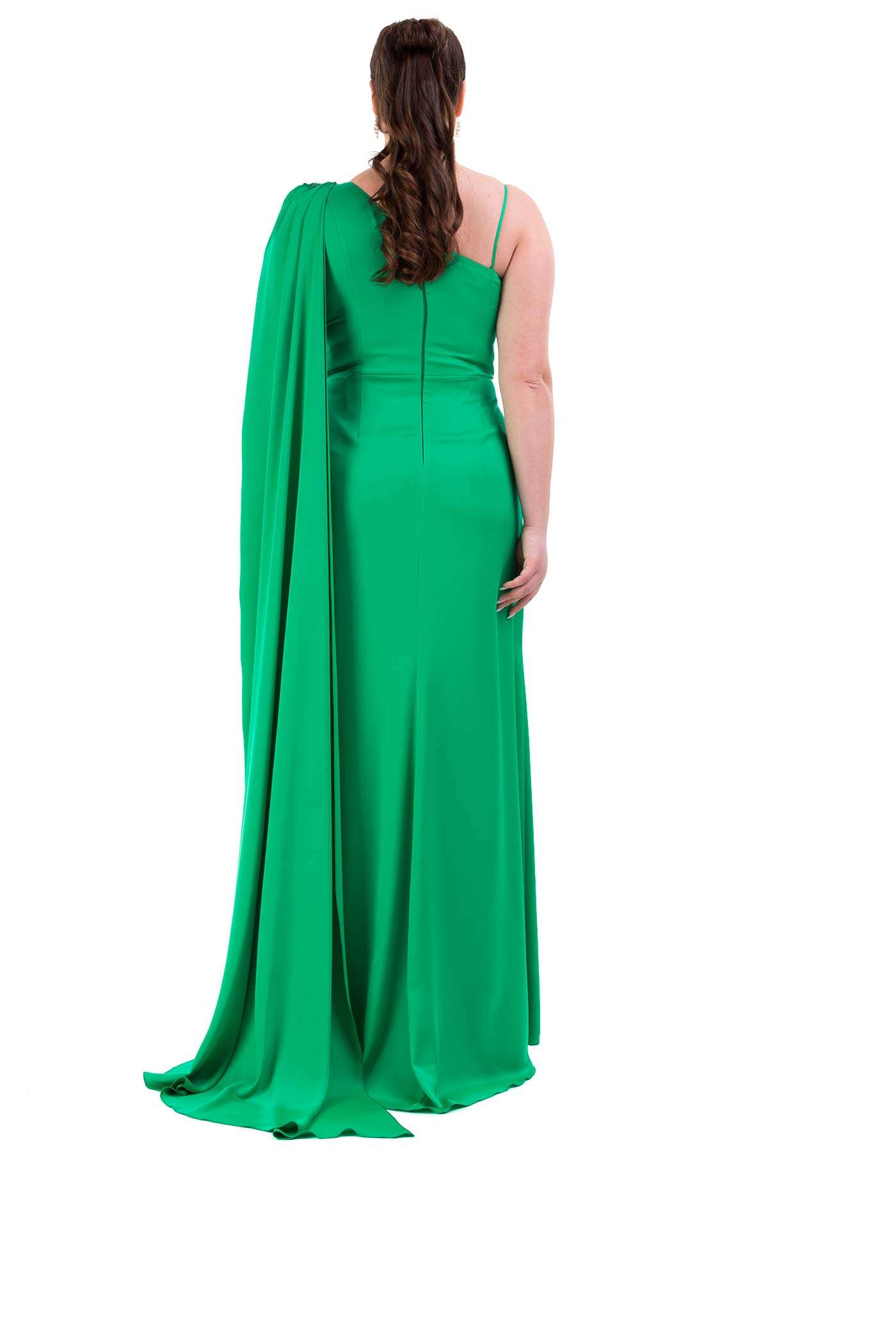 Elegante Abito da cerimonia in raso. Un abito luminoso con scollatura asimmetrica e importanti dettagli che ornano e sottolineano il punto vita e la spalla. La morbida gonna si apre in uno spacco laterale. - Additional Information