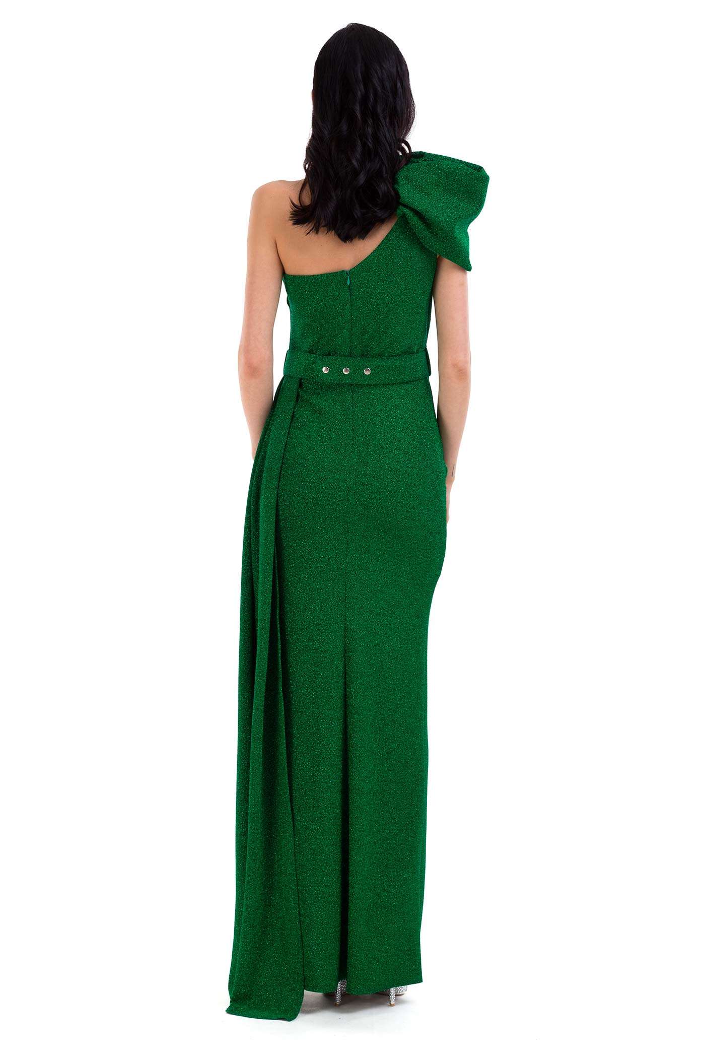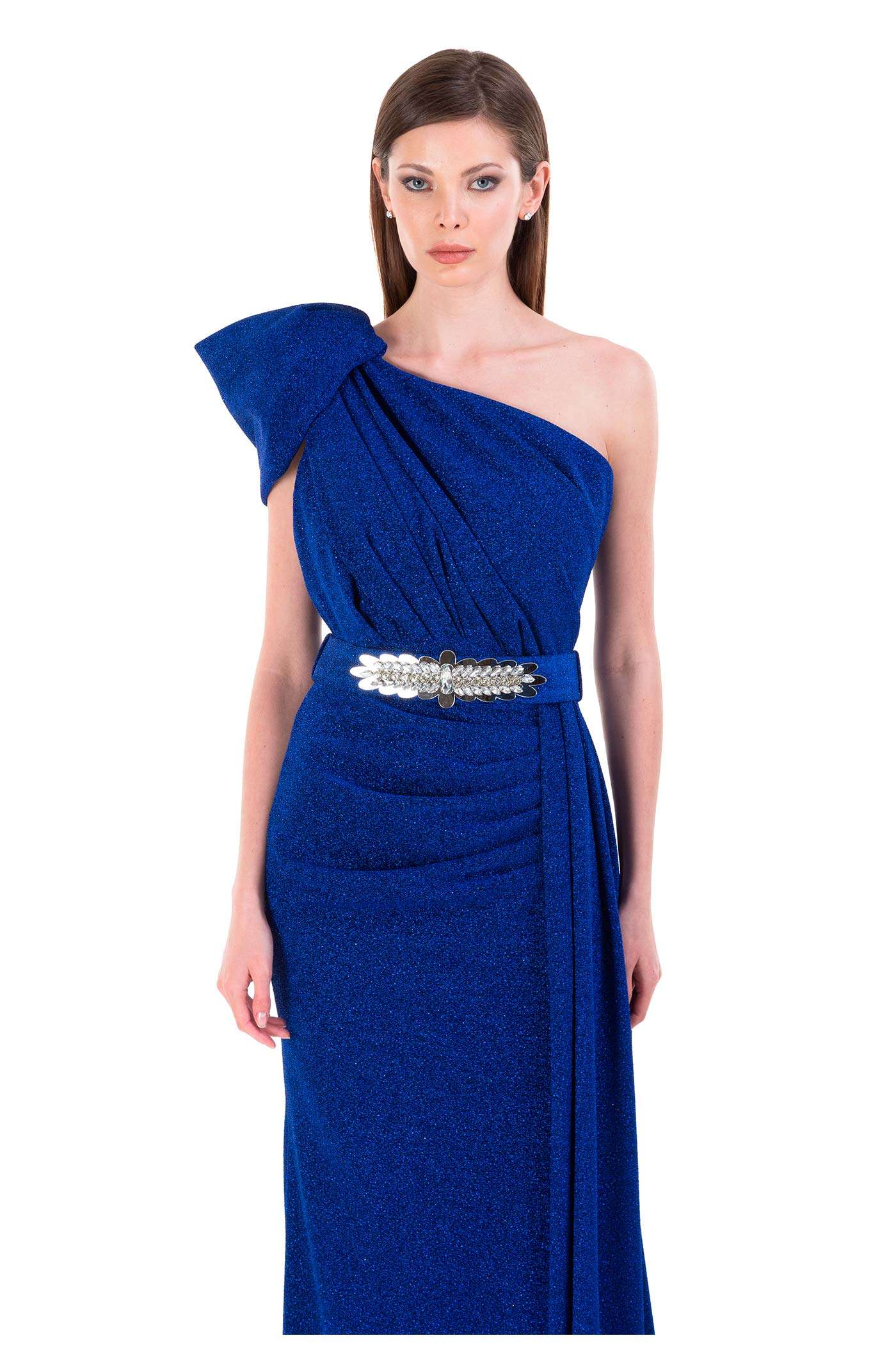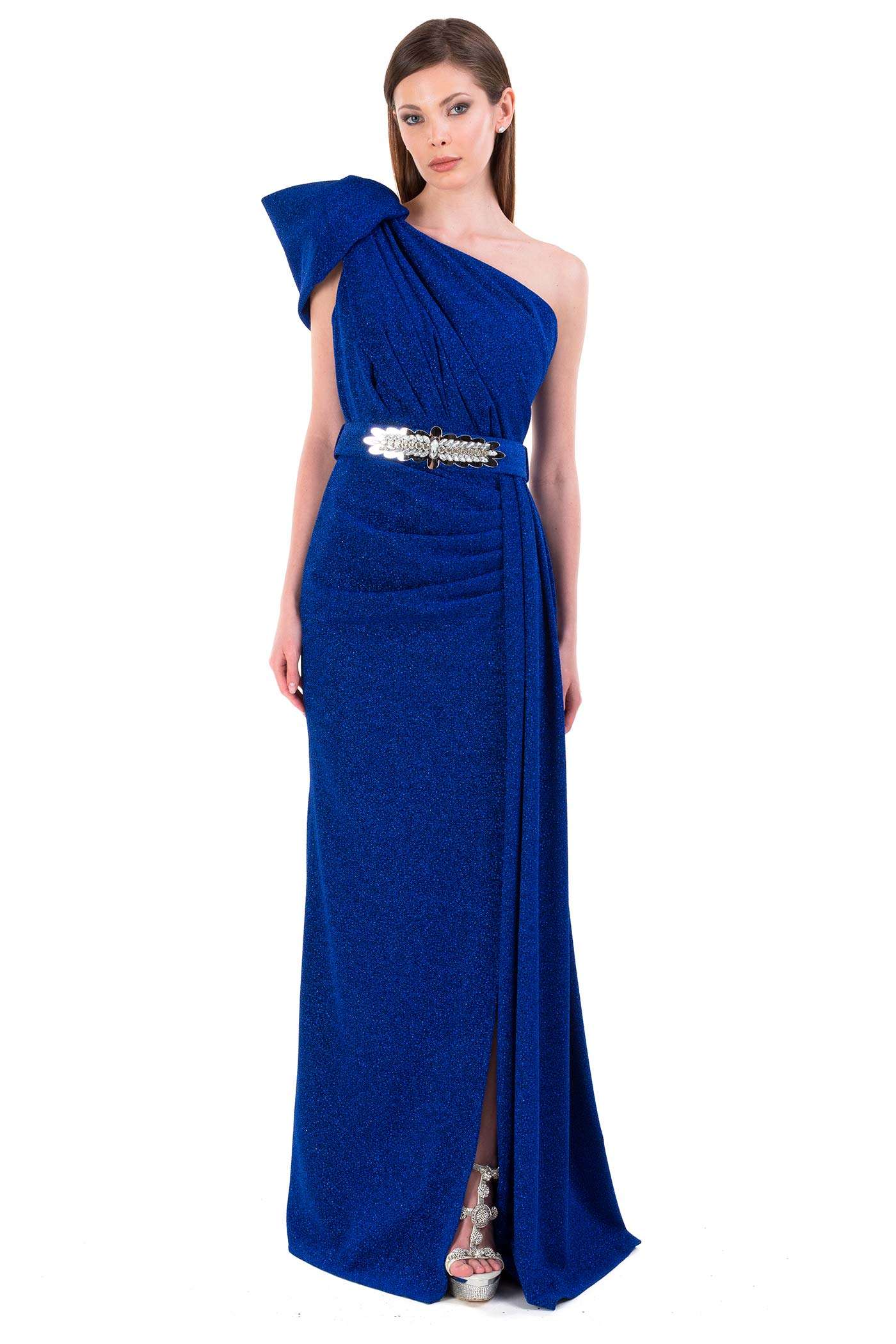 Abito elegante da cerimonia in Lurex. Il tessuto luminoso ed il dettaglio della cinta arricchiscono questo modello dalla linea semplice e sinuosa. La lunga gonna si apre in un sensuale spacco laterale.