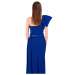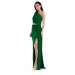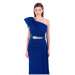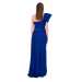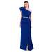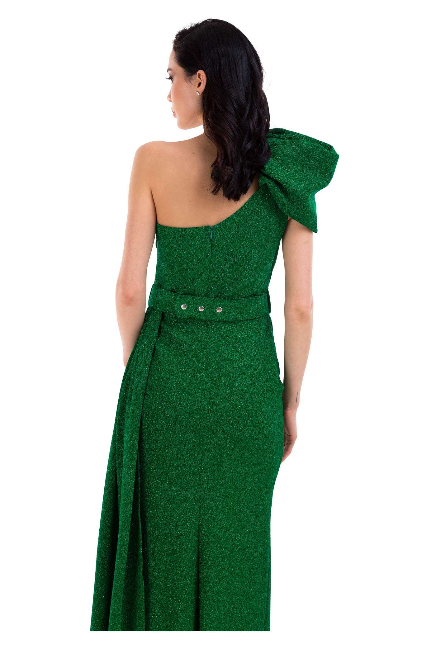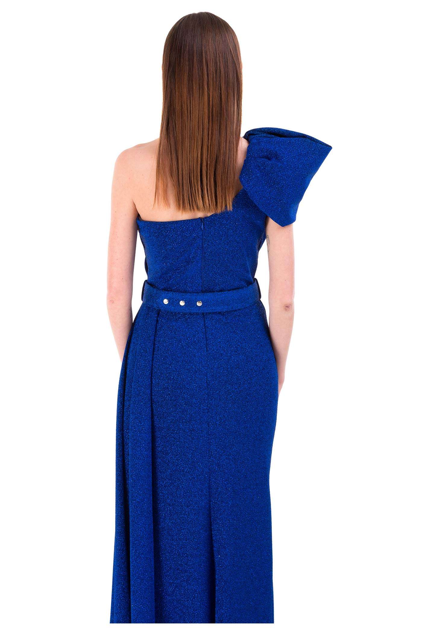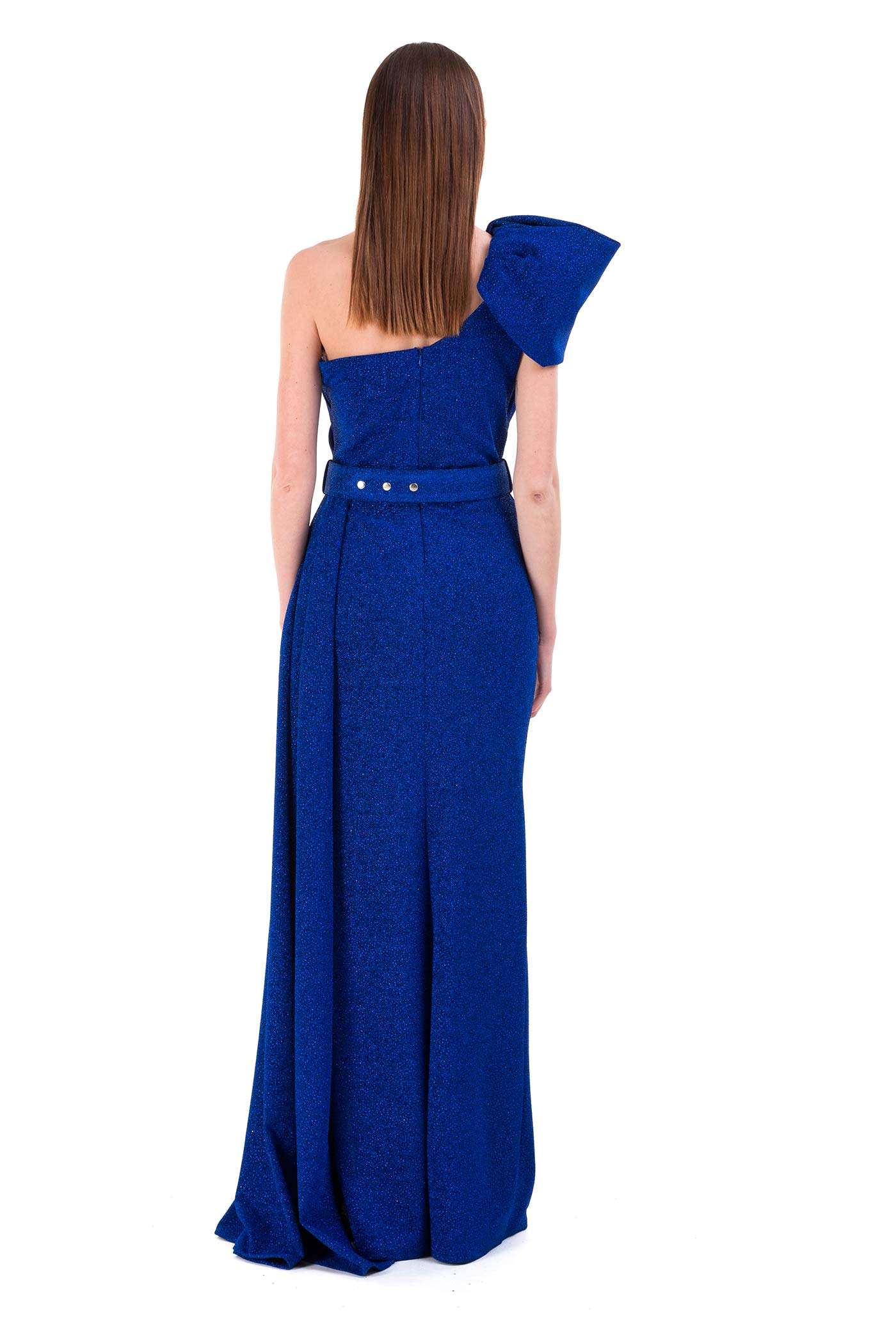 Abito elegante da cerimonia in Lurex. Il tessuto luminoso ed il dettaglio della cinta arricchiscono questo modello dalla linea semplice e sinuosa. La lunga gonna si apre in un sensuale spacco laterale.