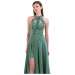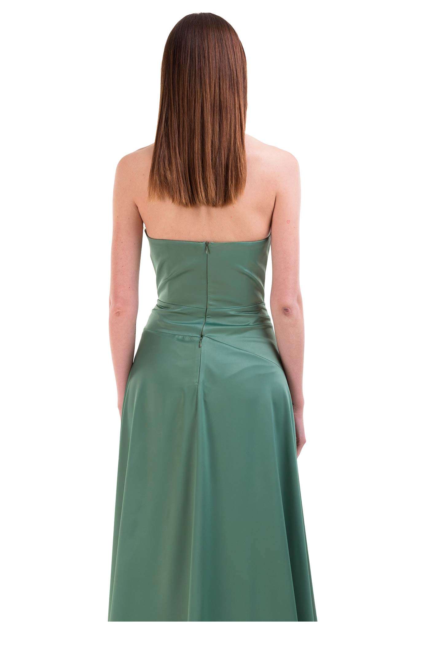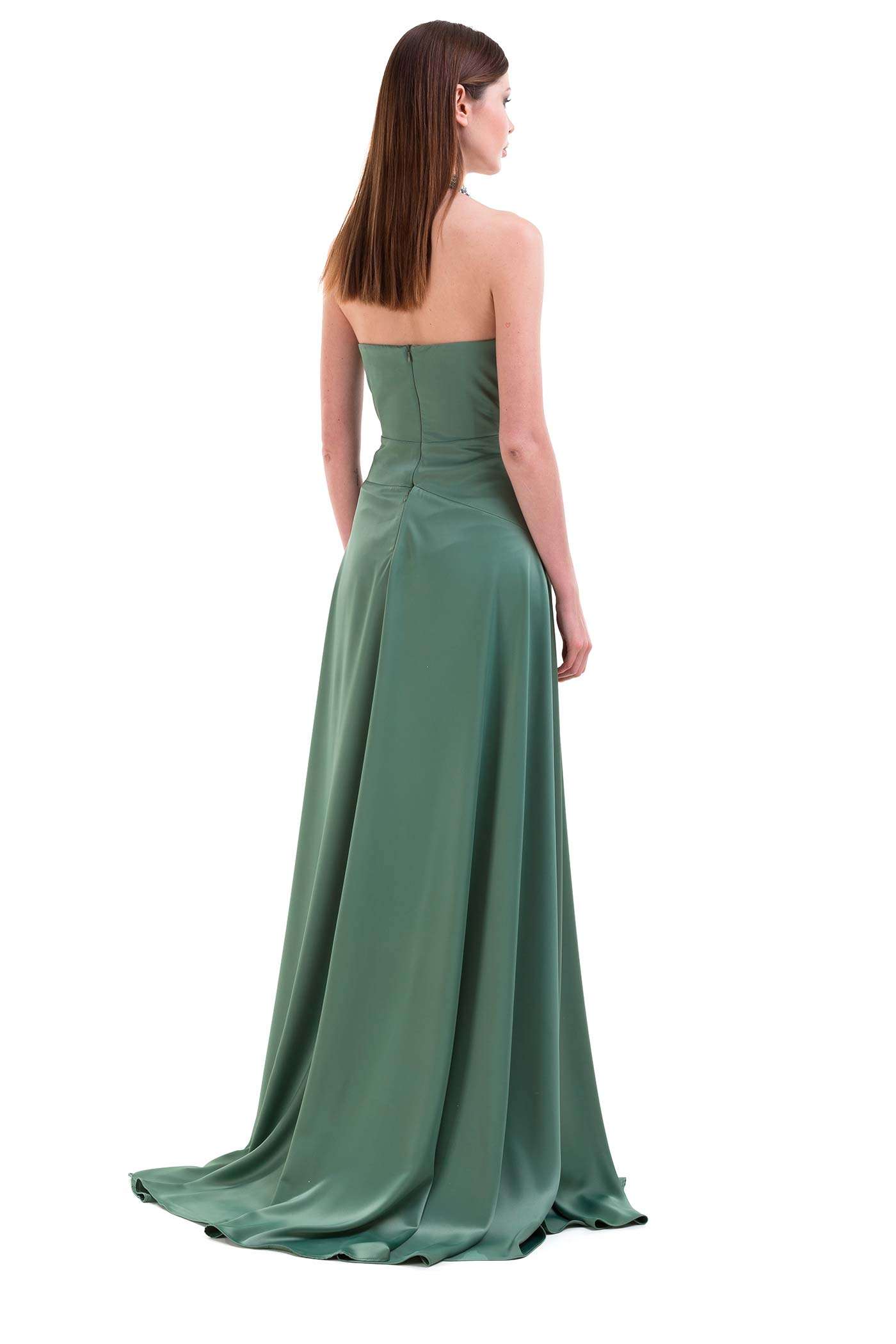 Abito da cerimonia in raso con scollo all'americana. Un ricco ricamo di paillettes di differenti colori orna la scollatura ed illumina la figura. La voluminosa e lunga gonna svasata apporta movimento e si apre in uno spacco laterale. - Additional Information