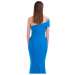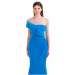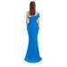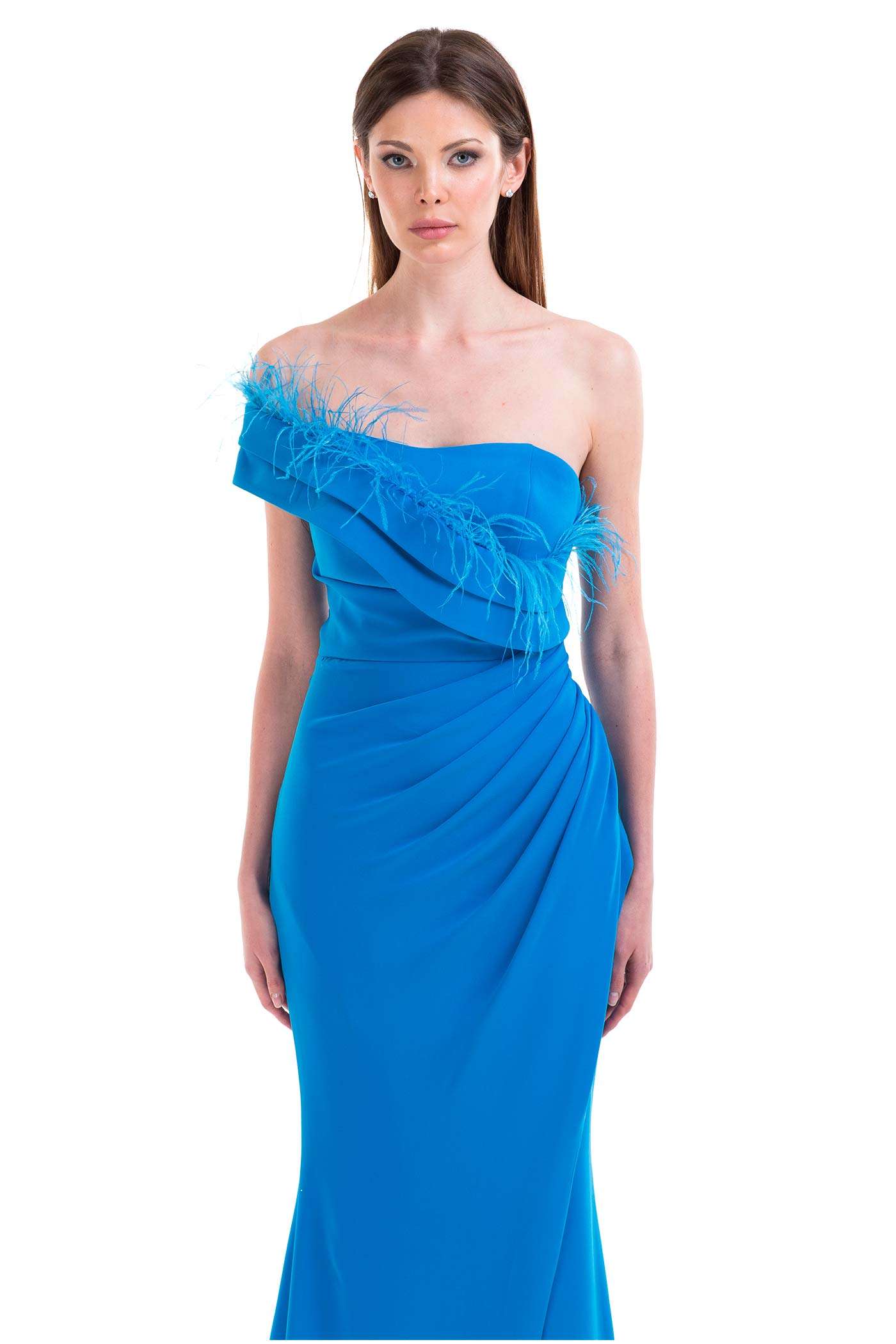 Abito da cerimonia scivolato con scollatura asimmetrica. Questo modello in Crepe è reso unico dalle piume che ornano lo scollo. Nella parte frontale, le arricciature accompagnano il tessuto verso un sensuale spacco laterale.