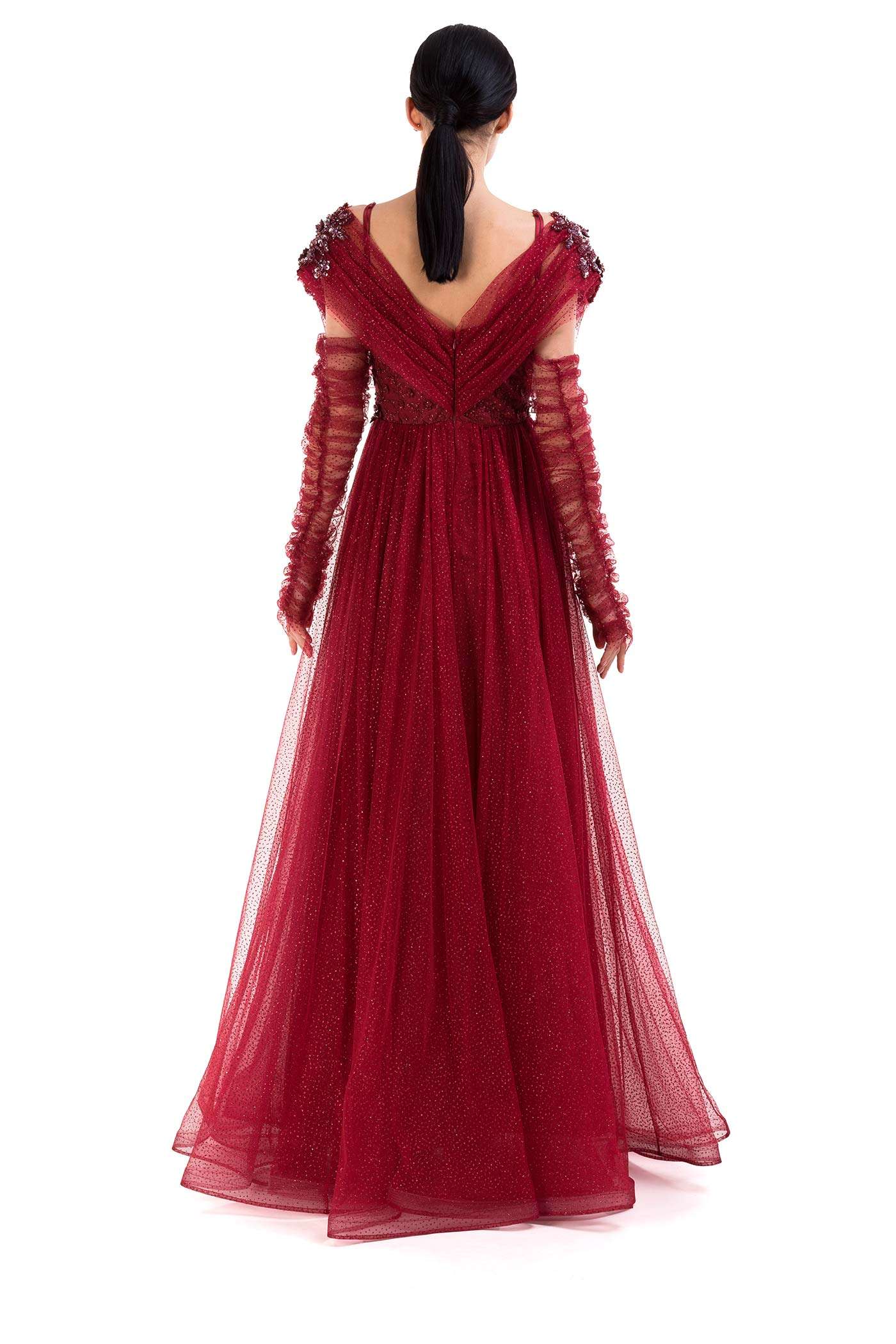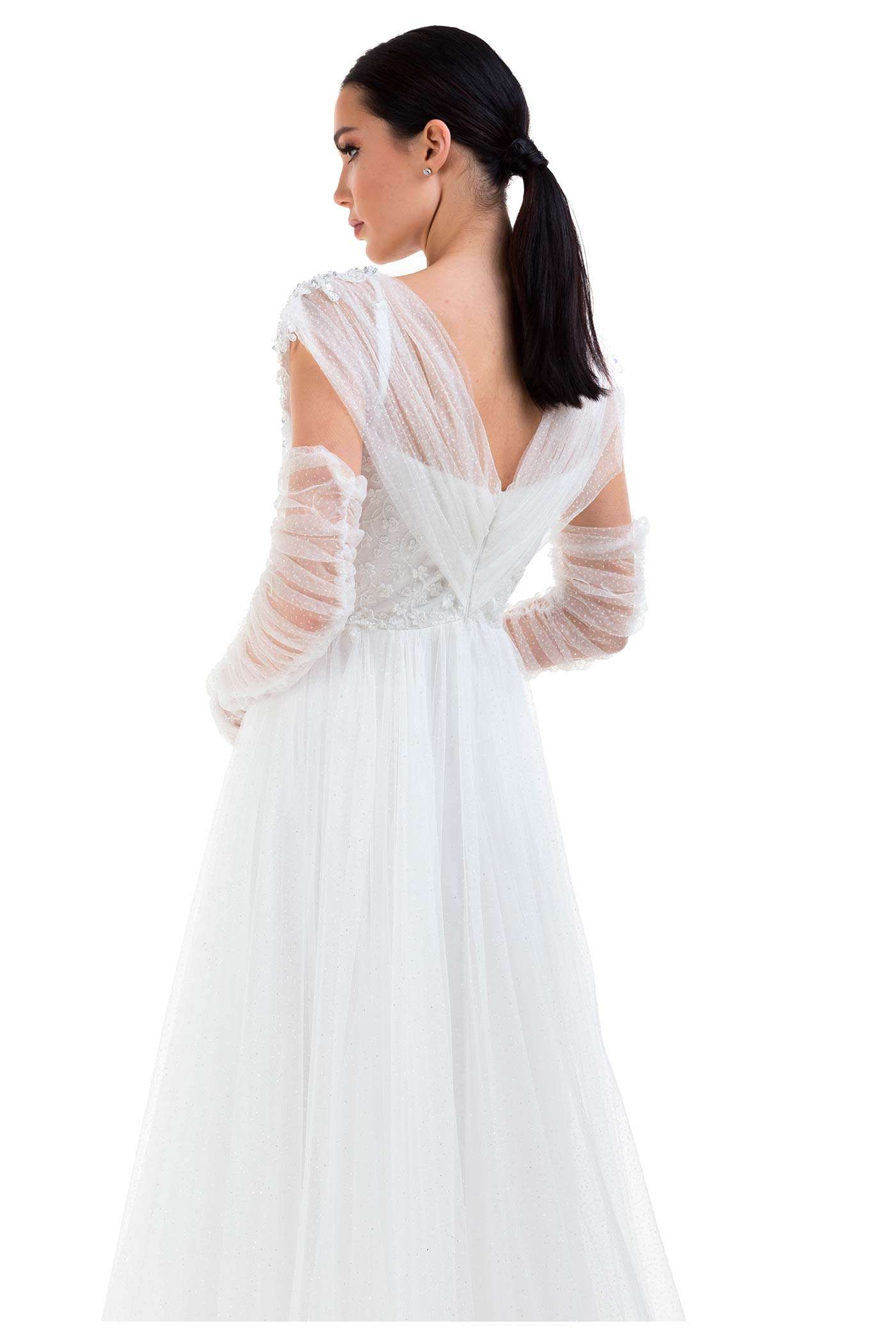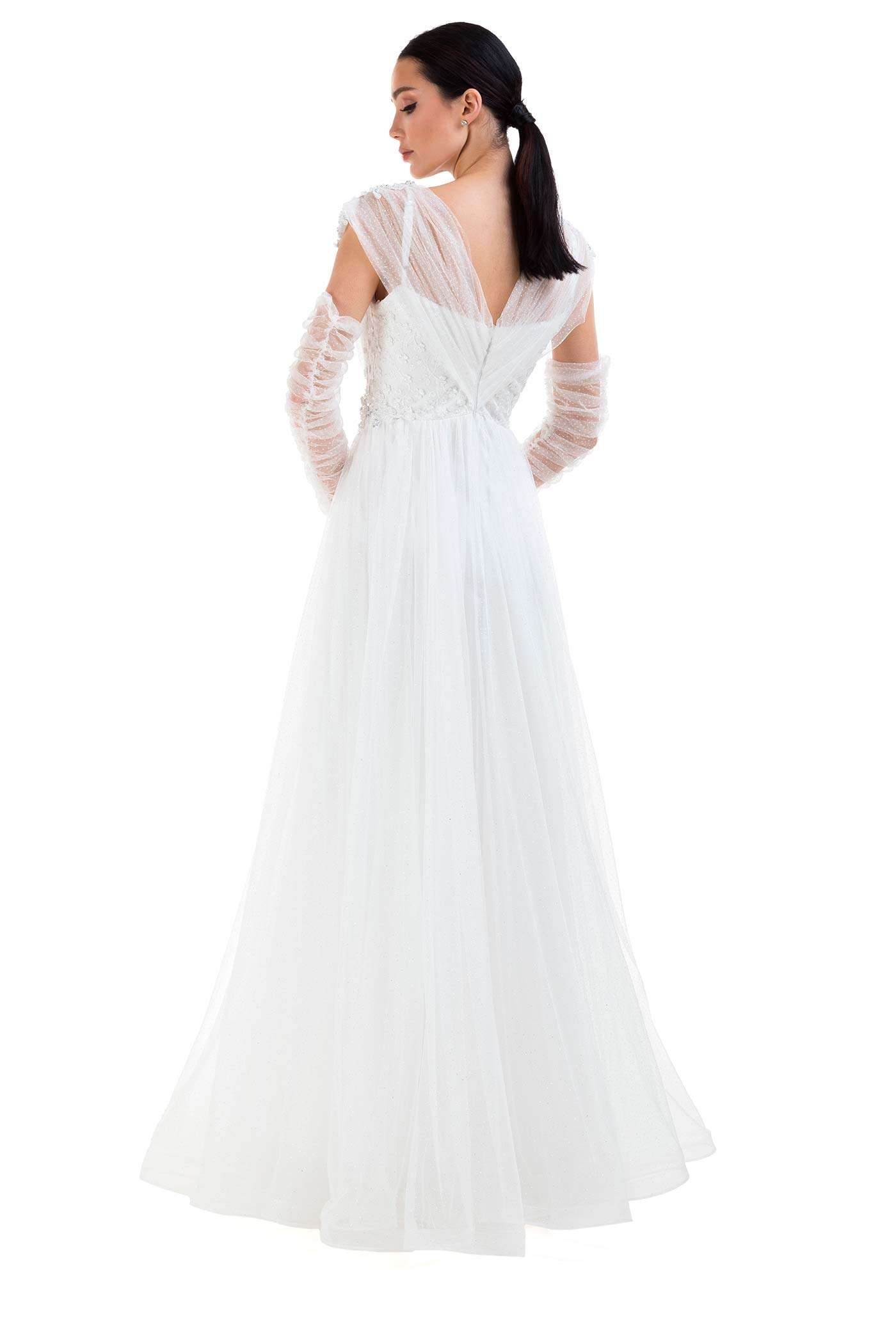 Abito da cerimonia in tulle glitter. Questo modello leggero e molto romantico ha un corpetto con scollo a cuore che fuoriesce da due bande in tulle che terminano nello scollo a V del dietro. Il ricamo floreale ricoperto di paillettes, le maniche in tulle arricciato e la voluminosa gonna completano questo look glamour.