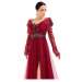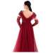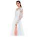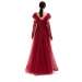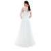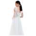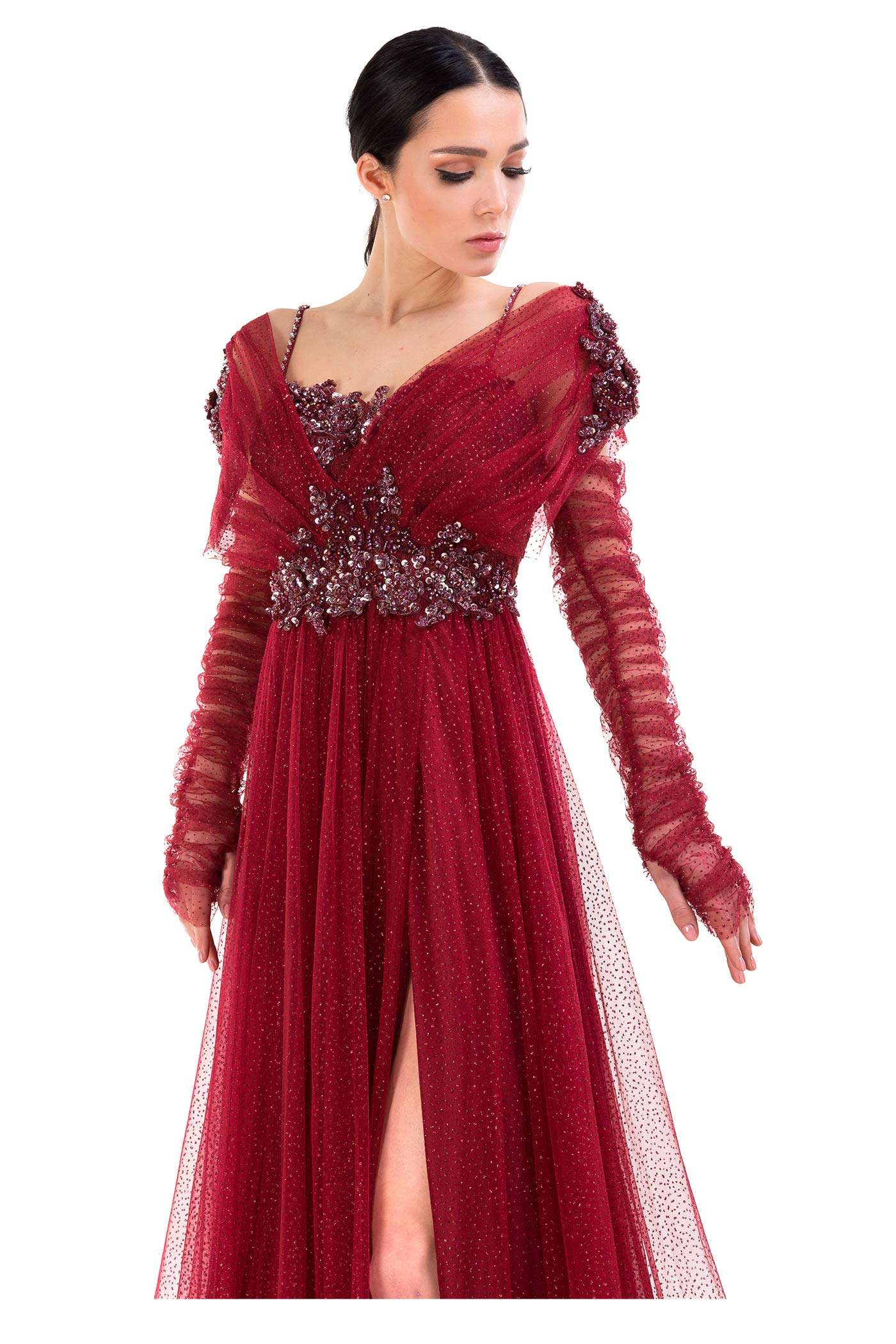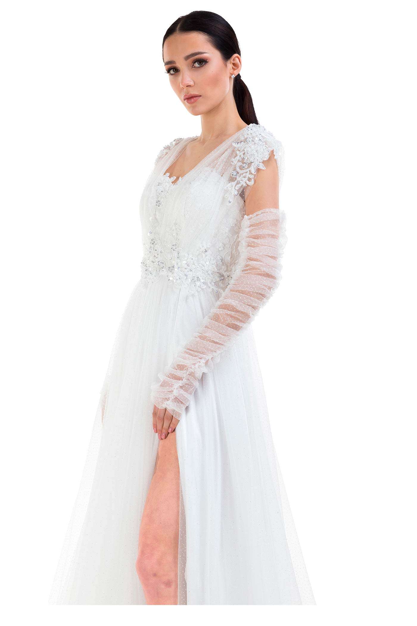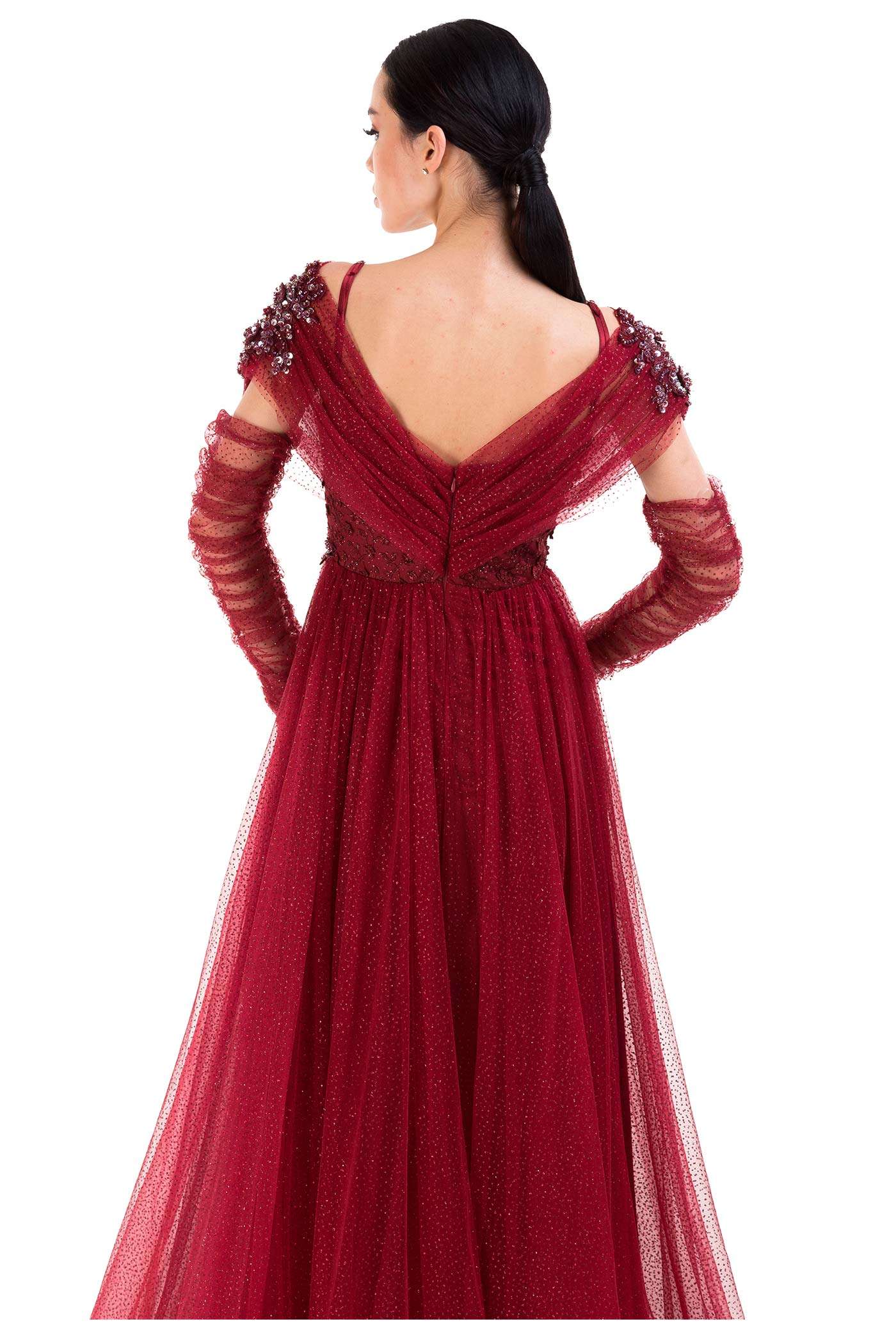 Abito da cerimonia in tulle glitter. Questo modello leggero e molto romantico ha un corpetto con scollo a cuore che fuoriesce da due bande in tulle che terminano nello scollo a V del dietro. Il ricamo floreale ricoperto di paillettes, le maniche in tulle arricciato e la voluminosa gonna completano questo look glamour.