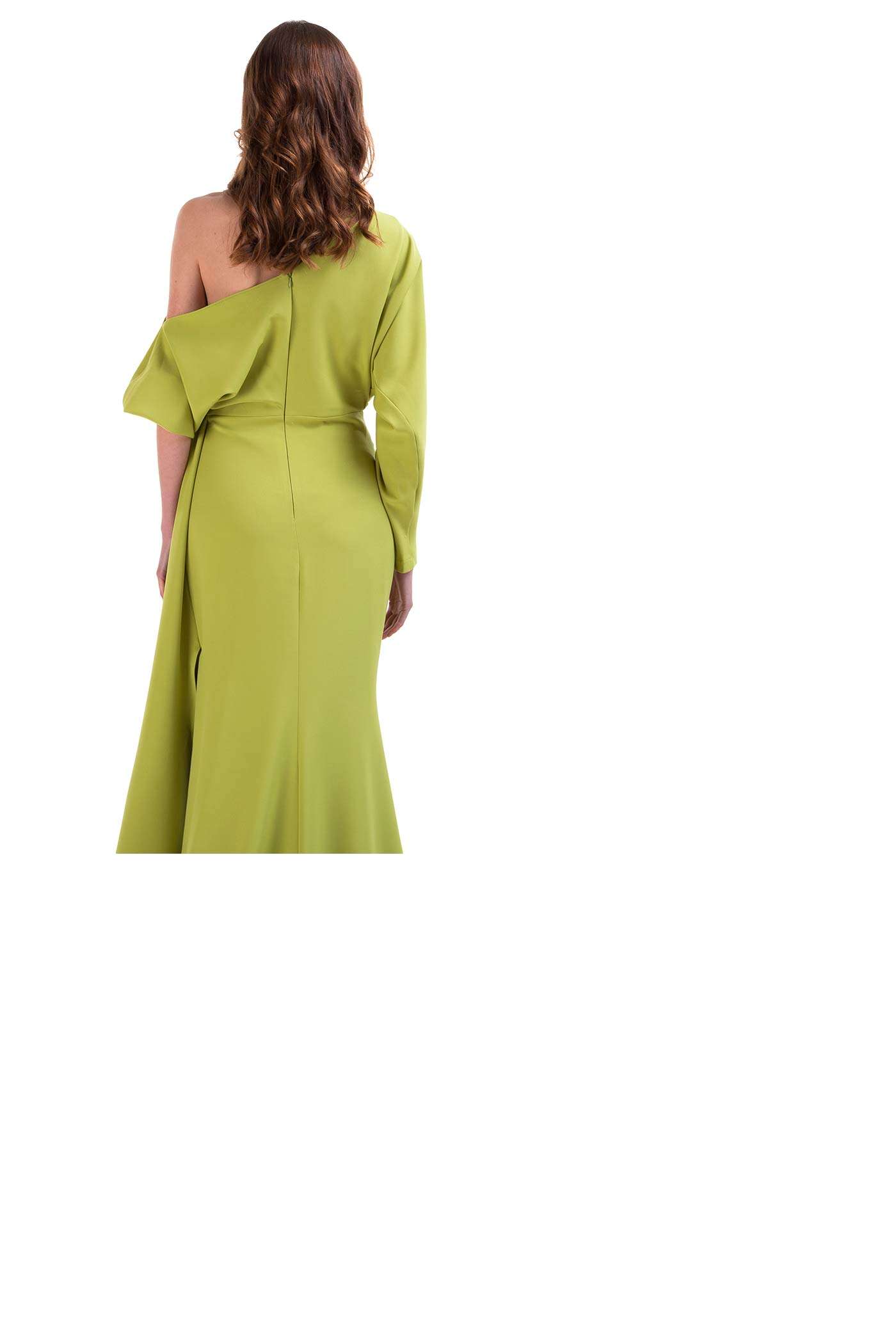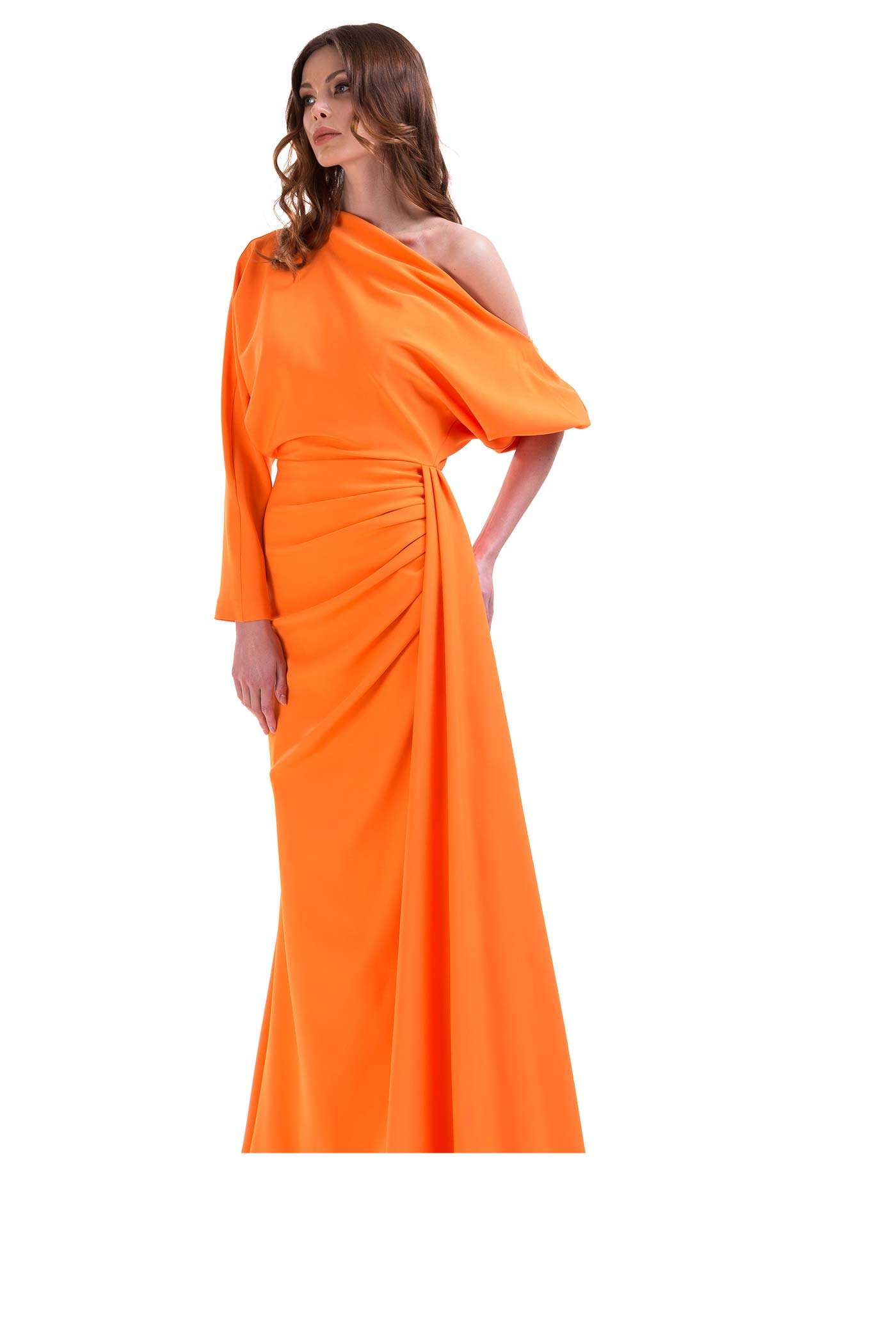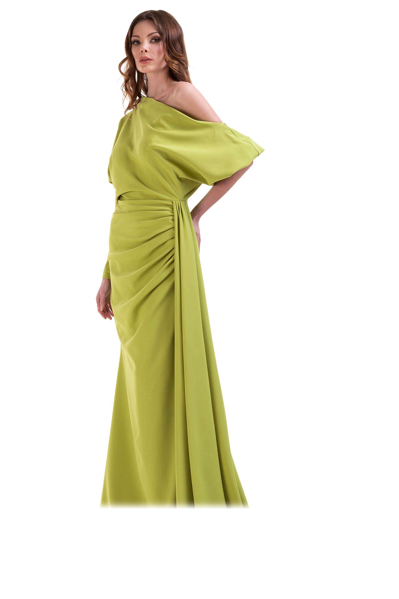 Asimmetrico abito da cerimonia in avvolgente crepe. Un morbido drappeggio in vita e un'importante manica completano questo modello pulito ed essenziale. - Additional Information