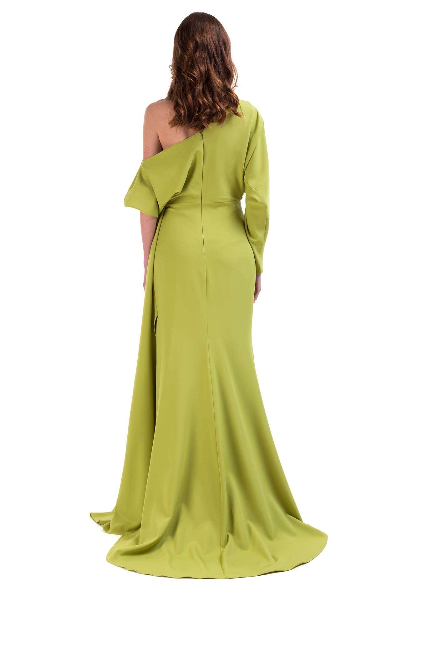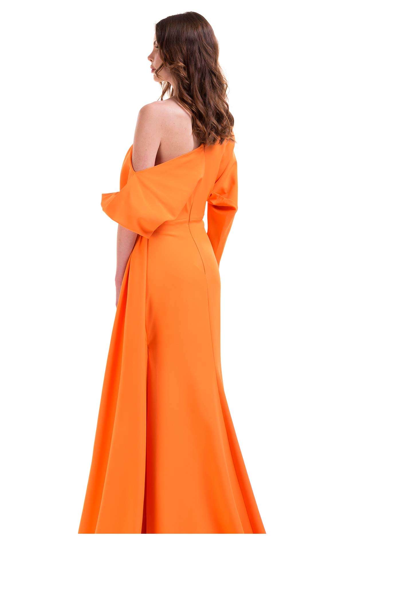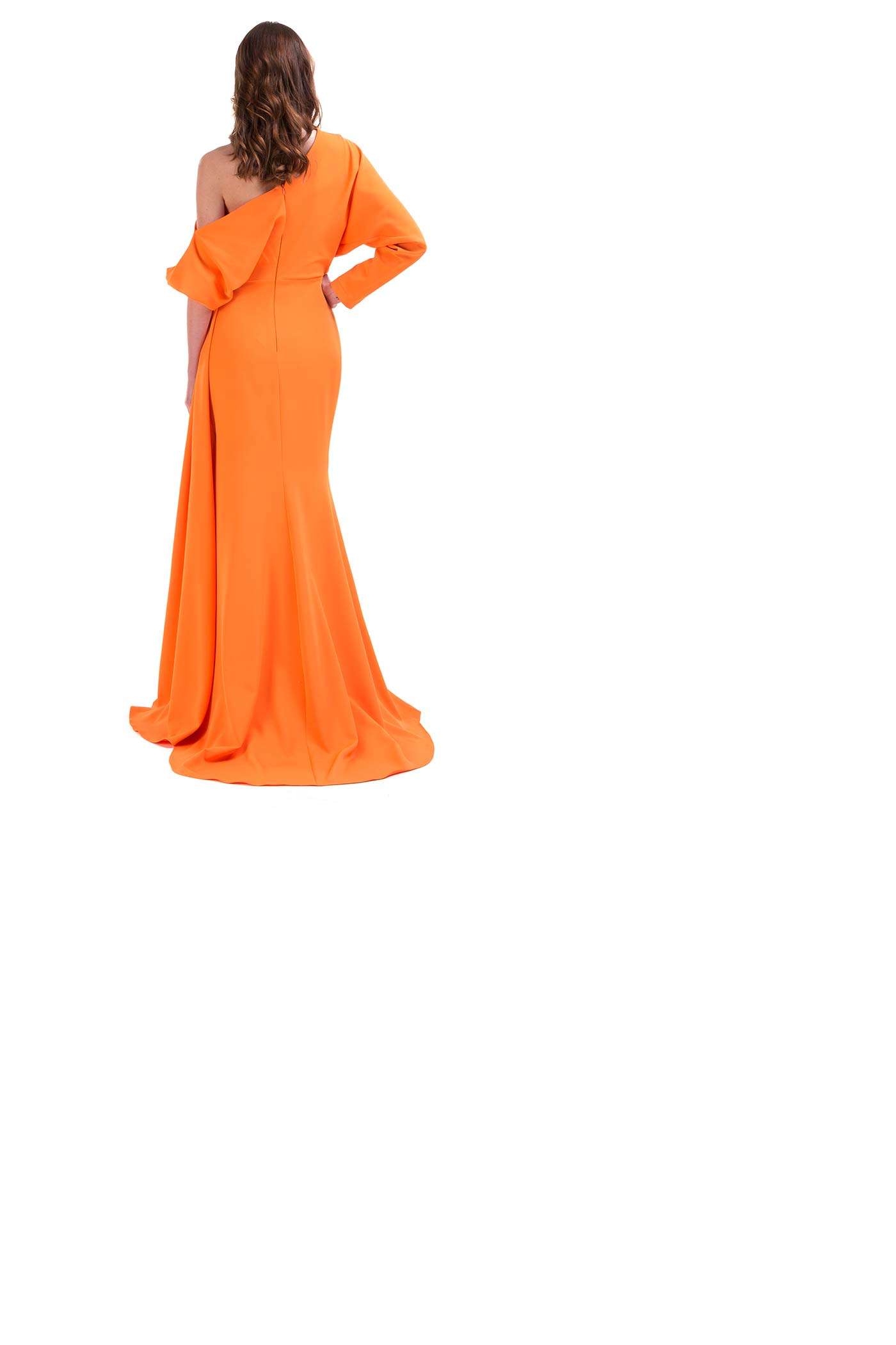 Asimmetrico abito da cerimonia in avvolgente crepe. Un morbido drappeggio in vita e un'importante manica completano questo modello pulito ed essenziale. - Additional Information