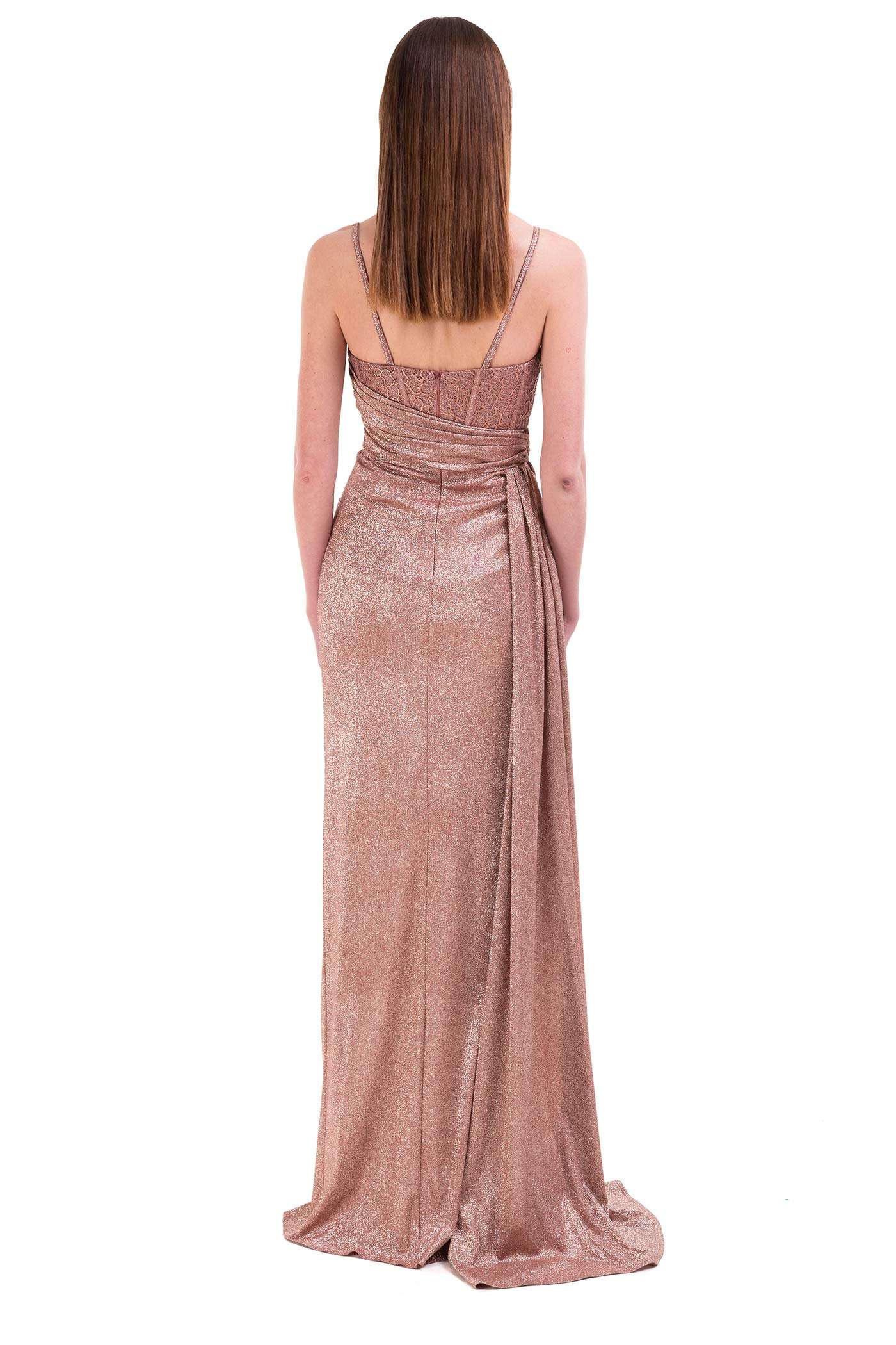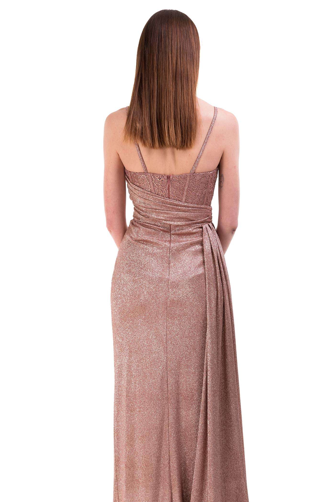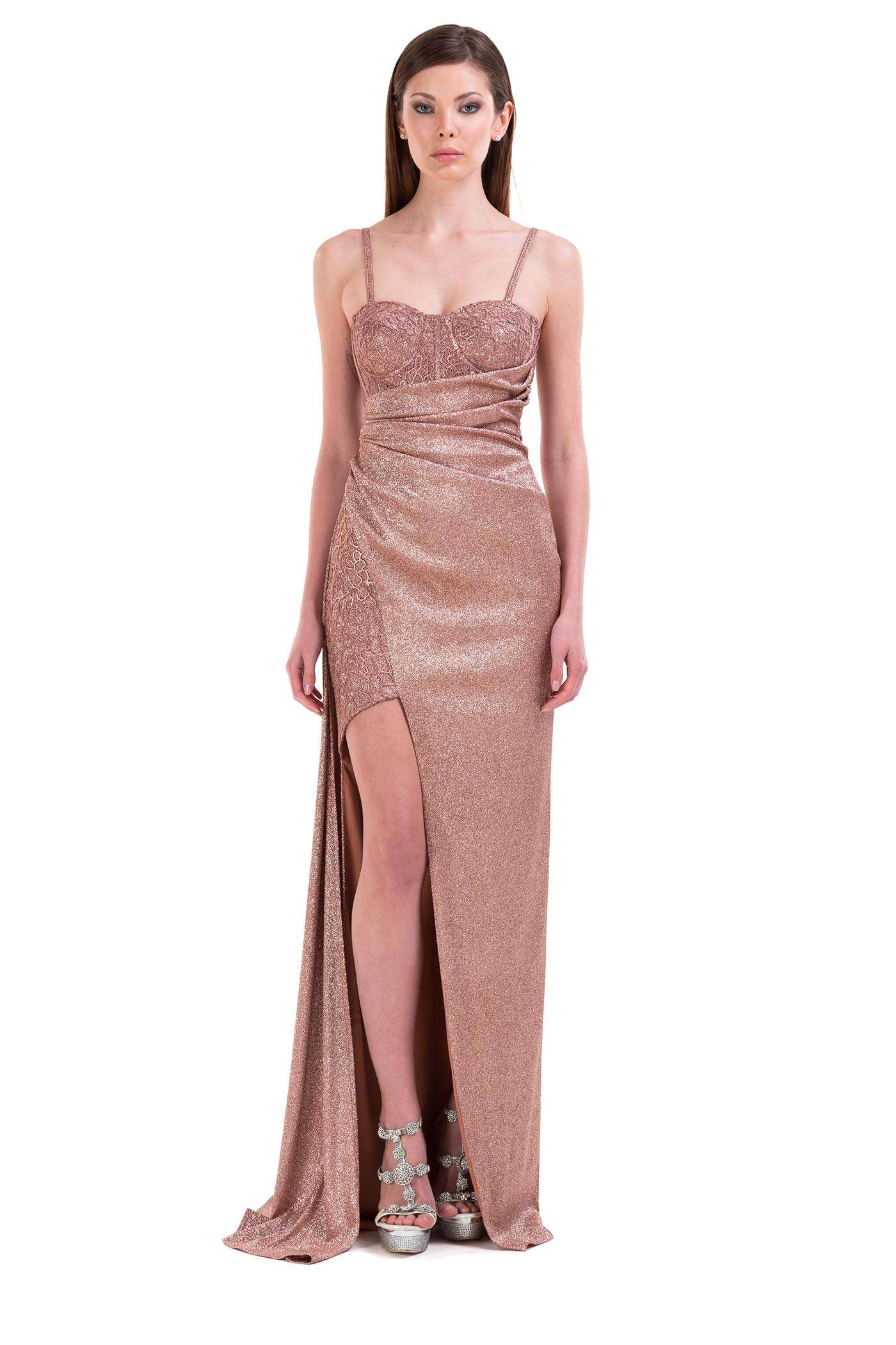 Un abito lungo dalla linea scivolata che mette in risalto la femminilità adattandosi al corpo e ai fianchi. Un modello sensuale e molto elegante realizzato in pizzo e lurex, con scollatura a cuore. - Additional Information