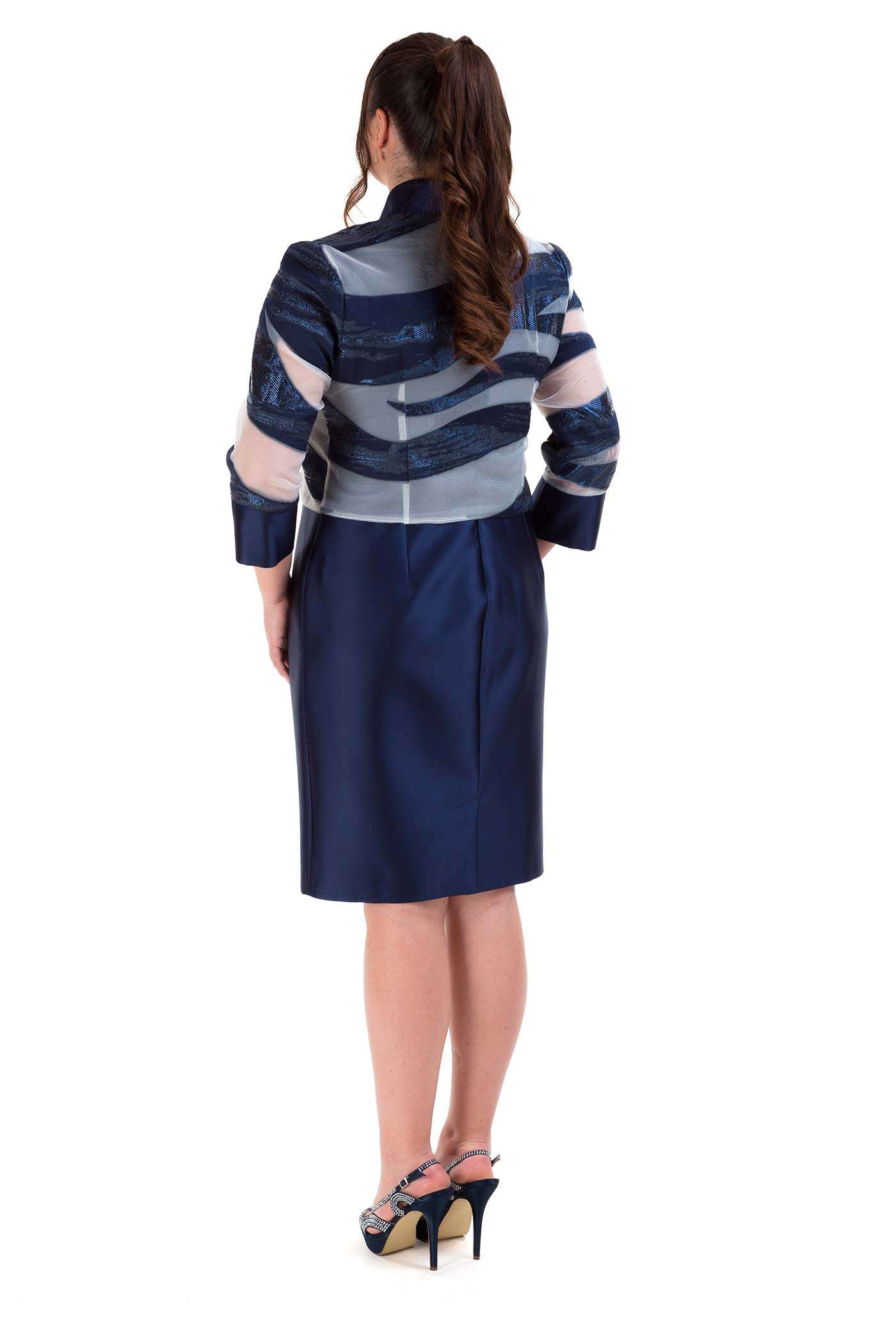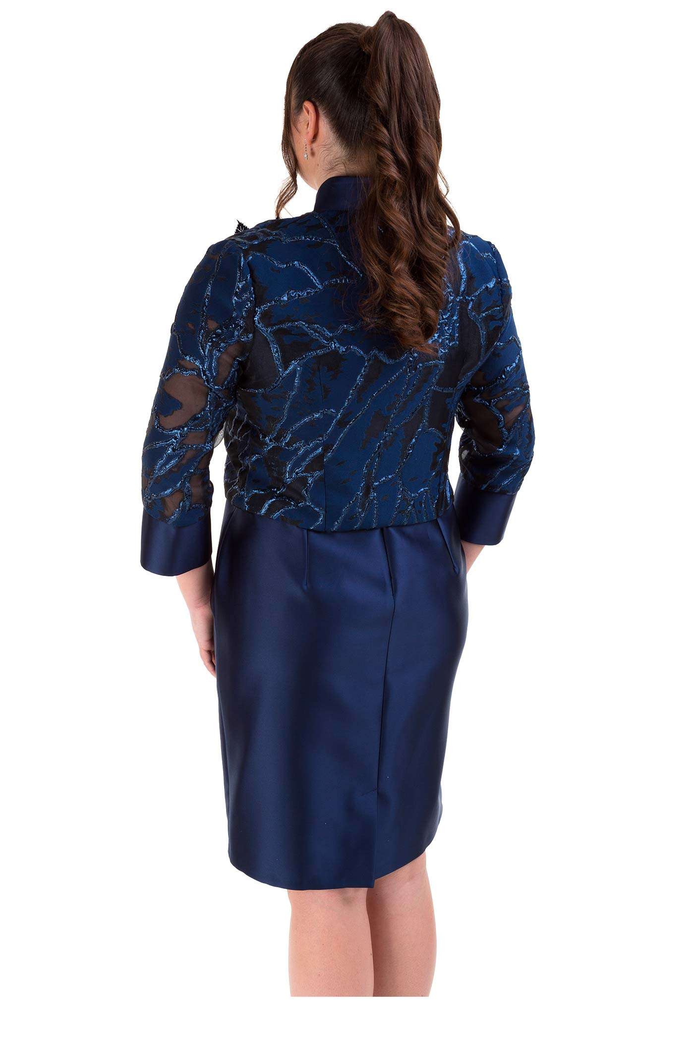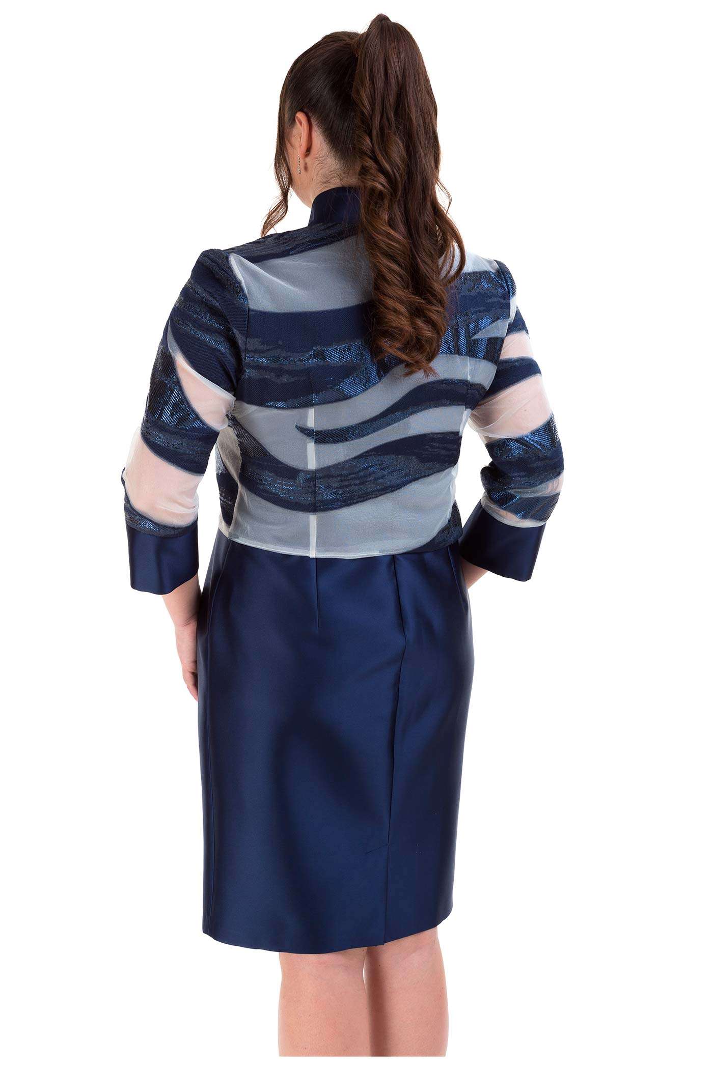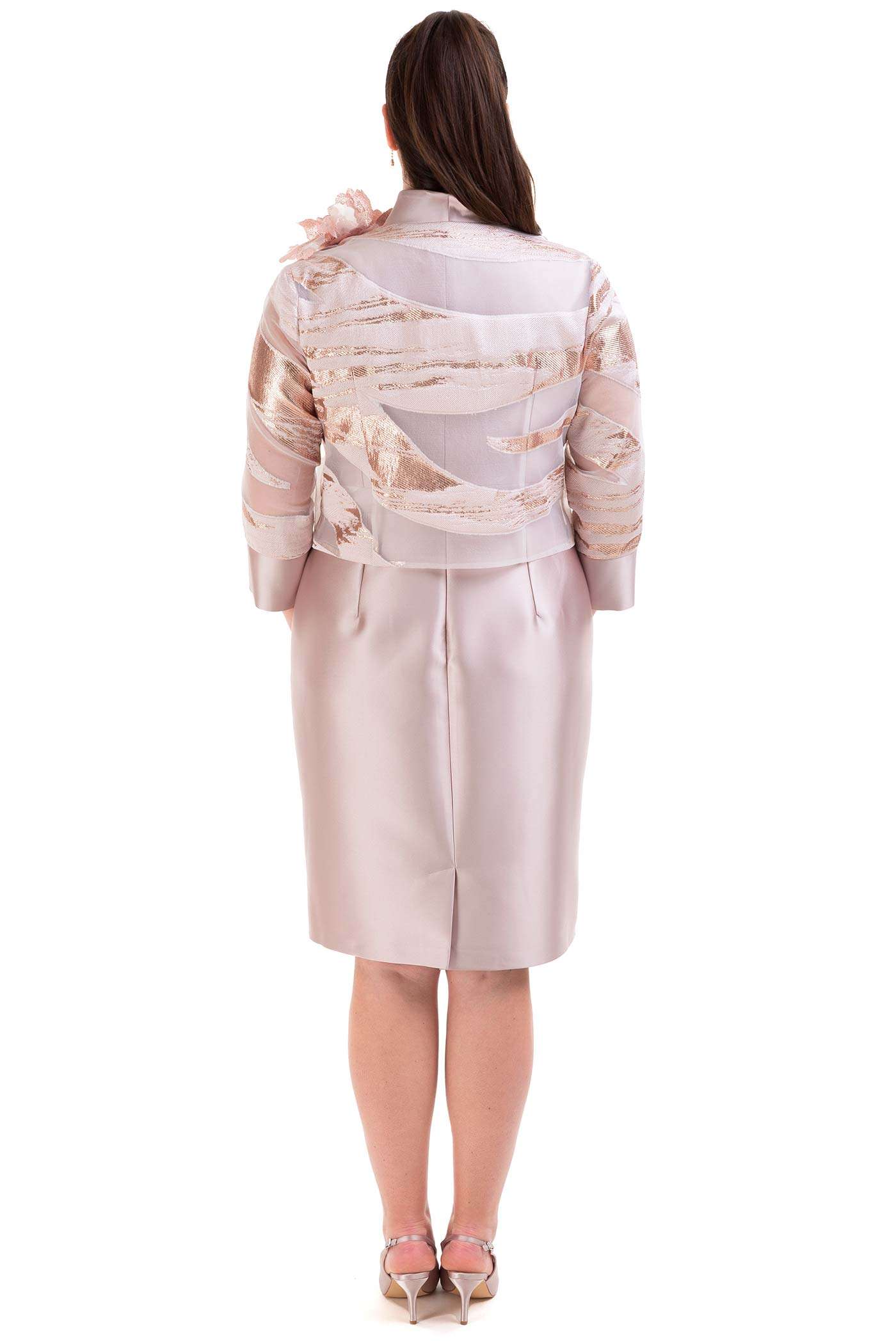 Completo con abito corto e giacca. Un abito corto a tubino realizzato in raso con una leggera scollatura ed un dettaglio in vita. La giacca fantasia è corta mixa in modo armonioso tessuti come il lurex, il raso e la georgette.