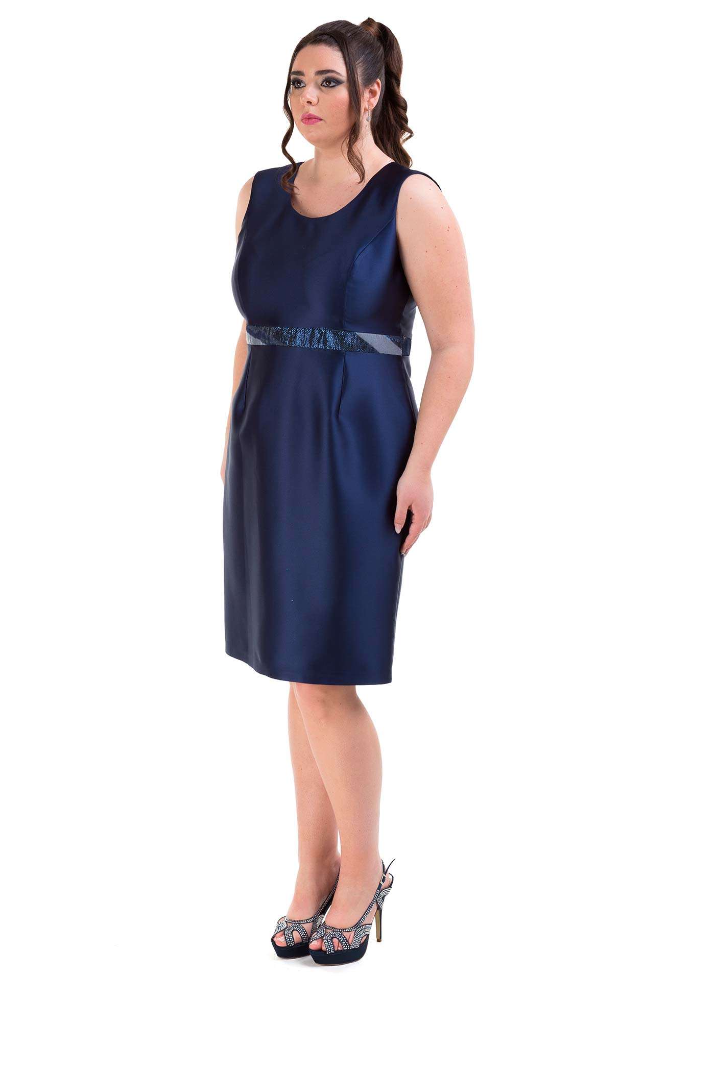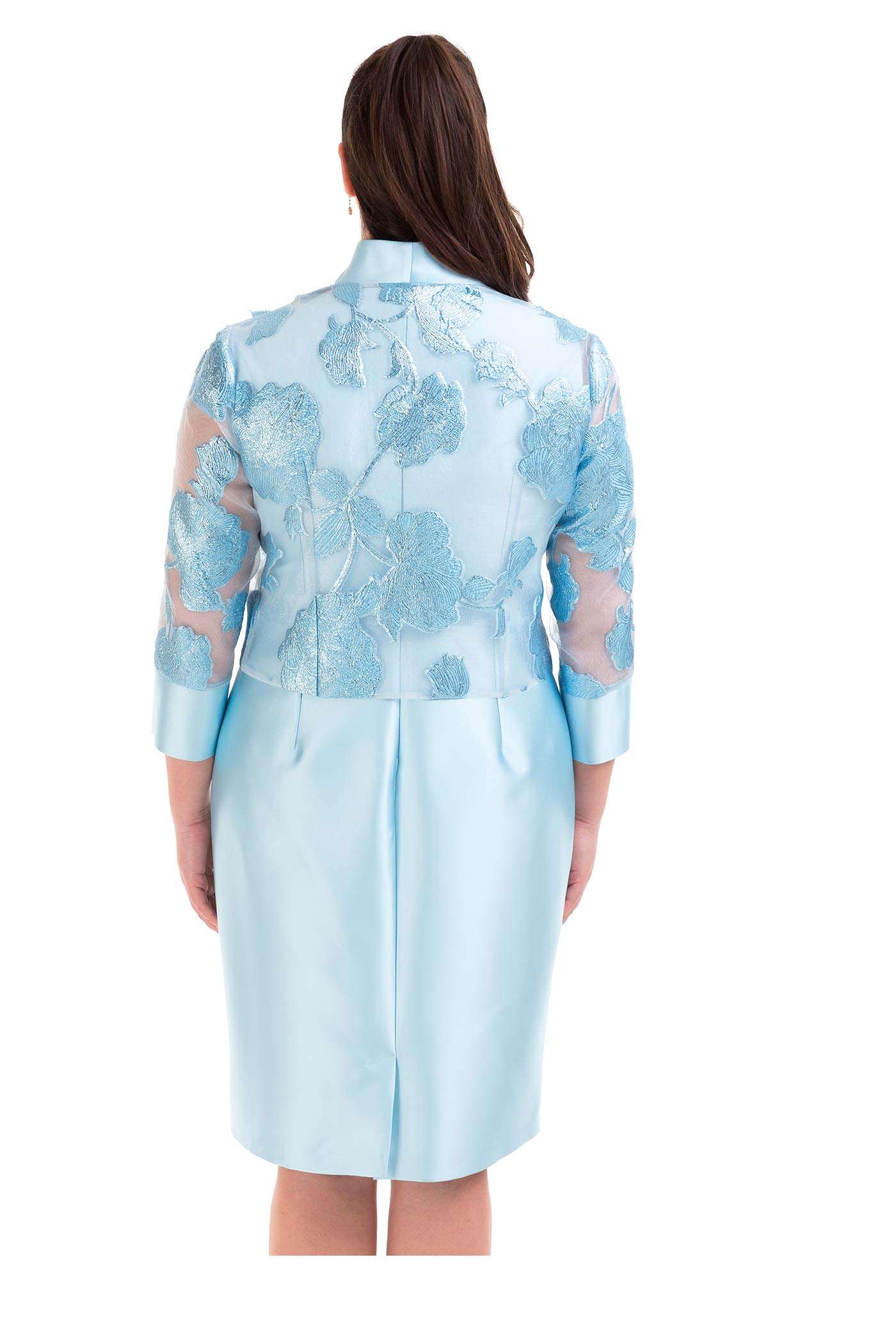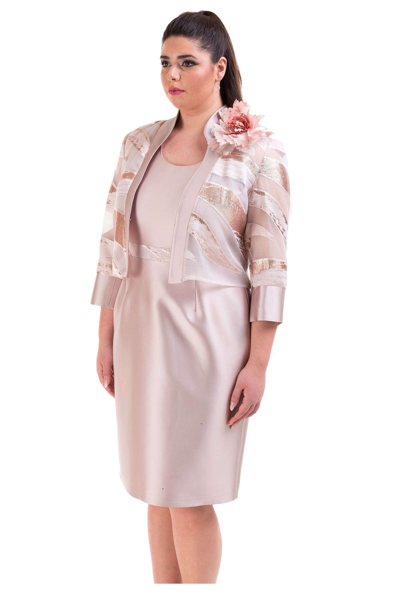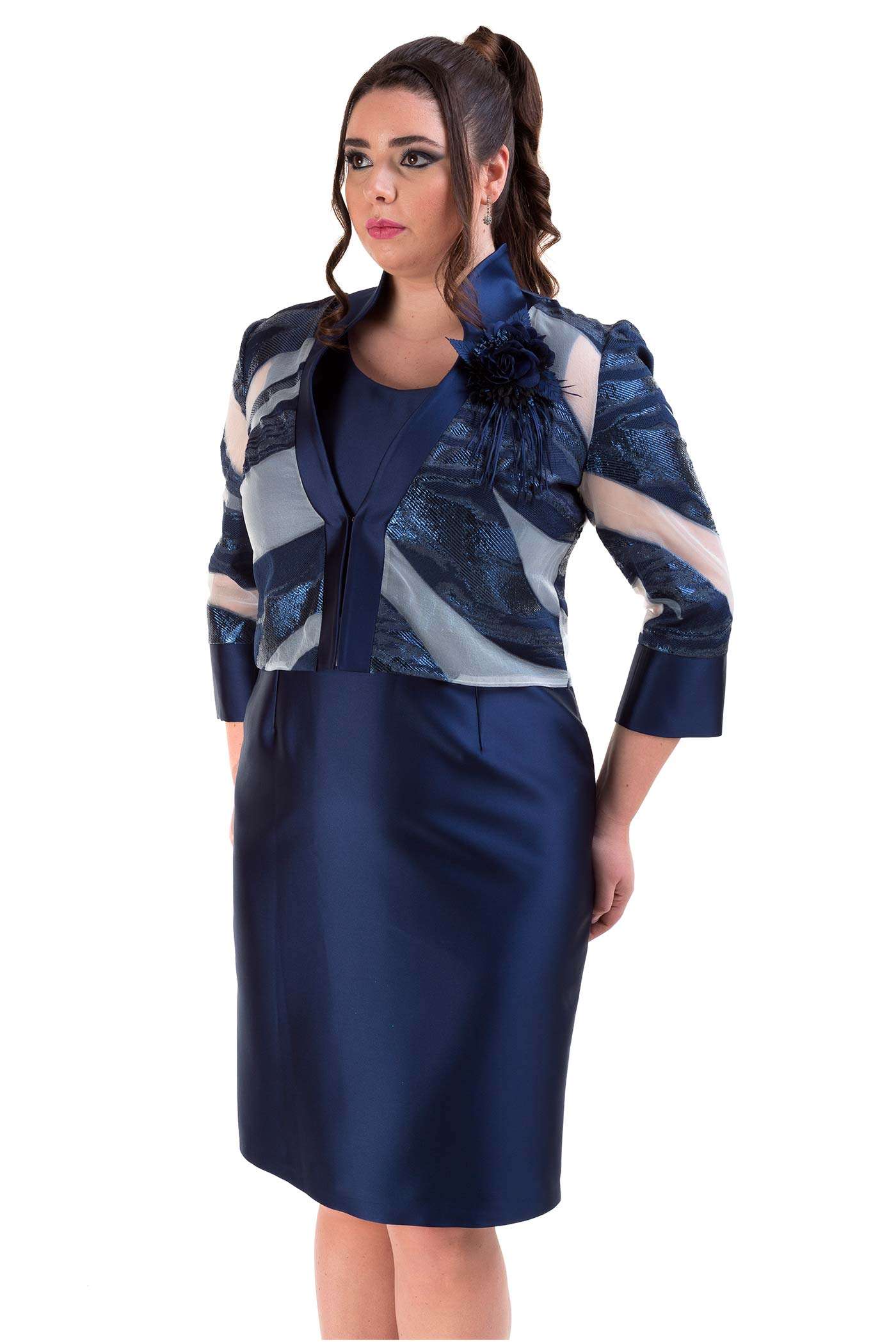Completo con abito corto e giacca. Un abito corto a tubino realizzato in raso con una leggera scollatura ed un dettaglio in vita. La giacca fantasia è corta mixa in modo armonioso tessuti come il lurex, il raso e la georgette.