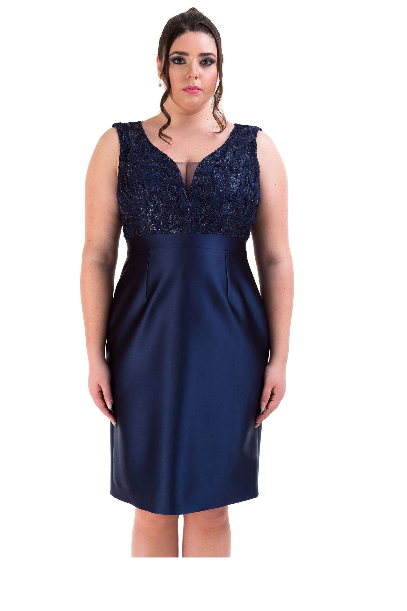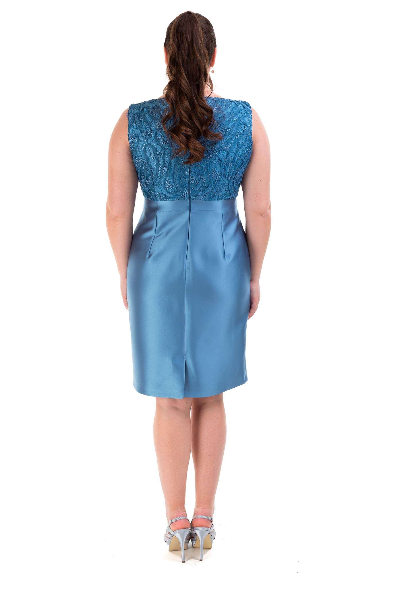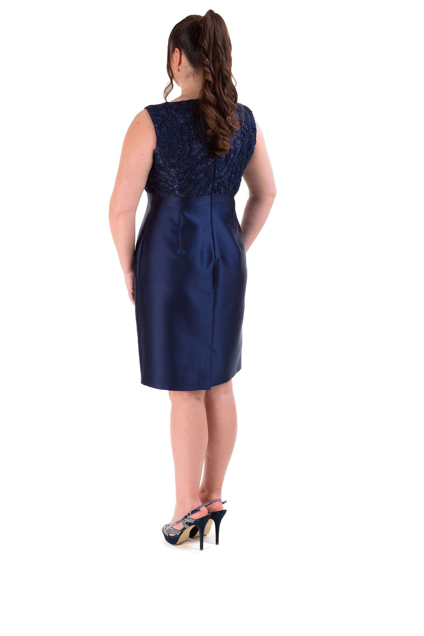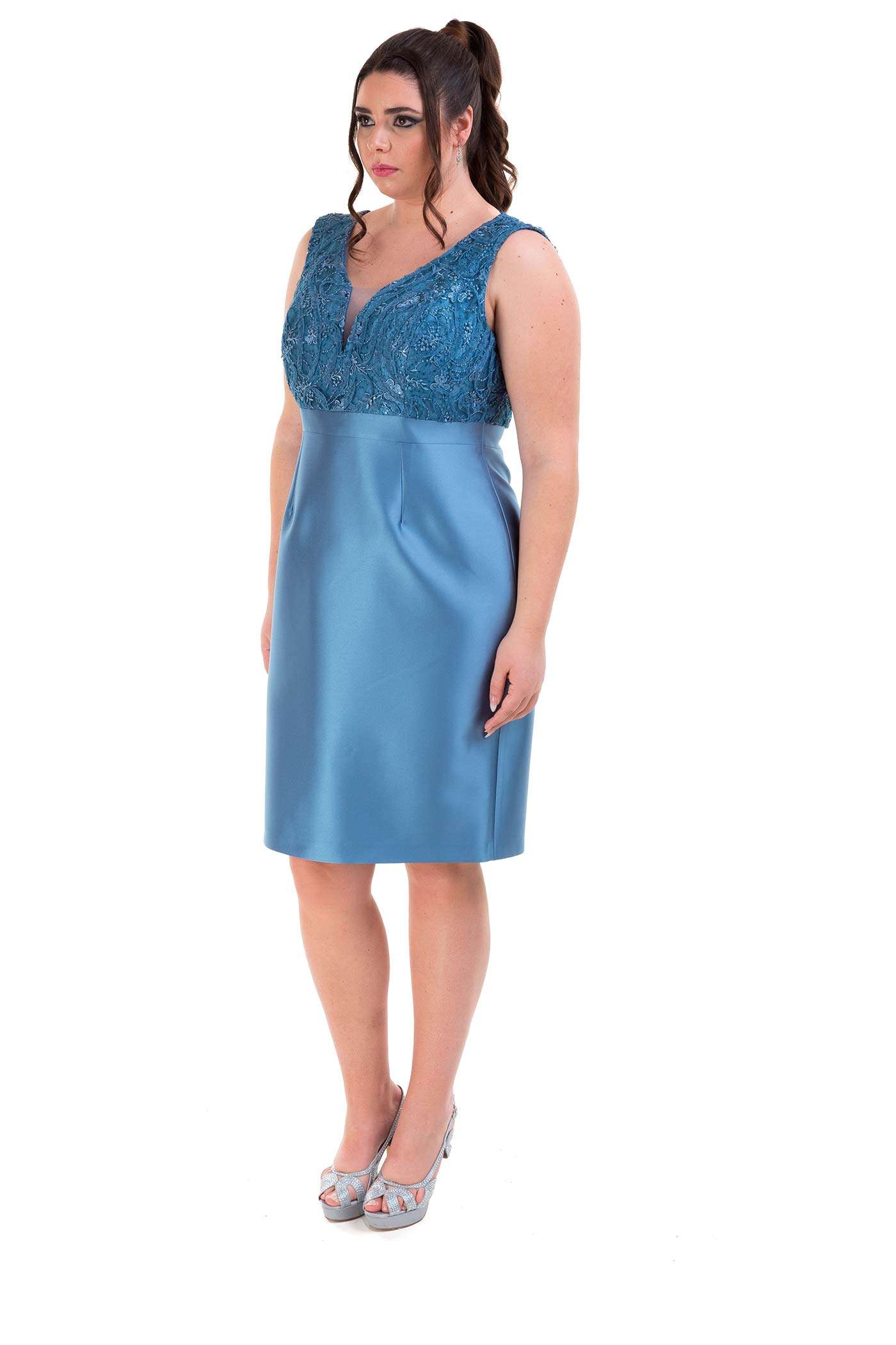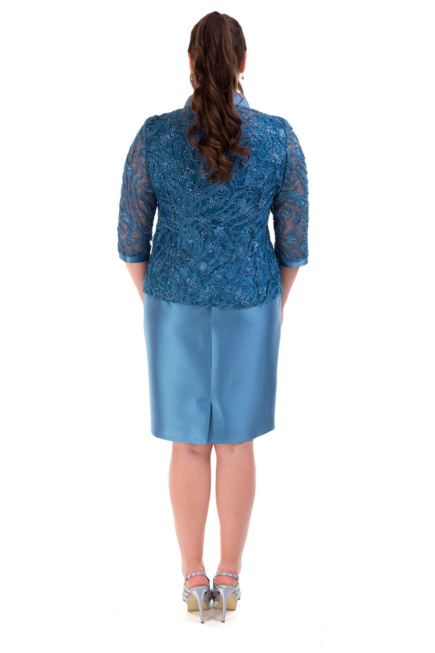 Completo con abito corto e giacca. Un abito a tubino realizzato in raso con il corpetto con scollo a V in pizzo. La giacca con maniche tre quarti realizzata in pizzo, riprende il dettaglio romantico dell'abito.