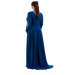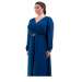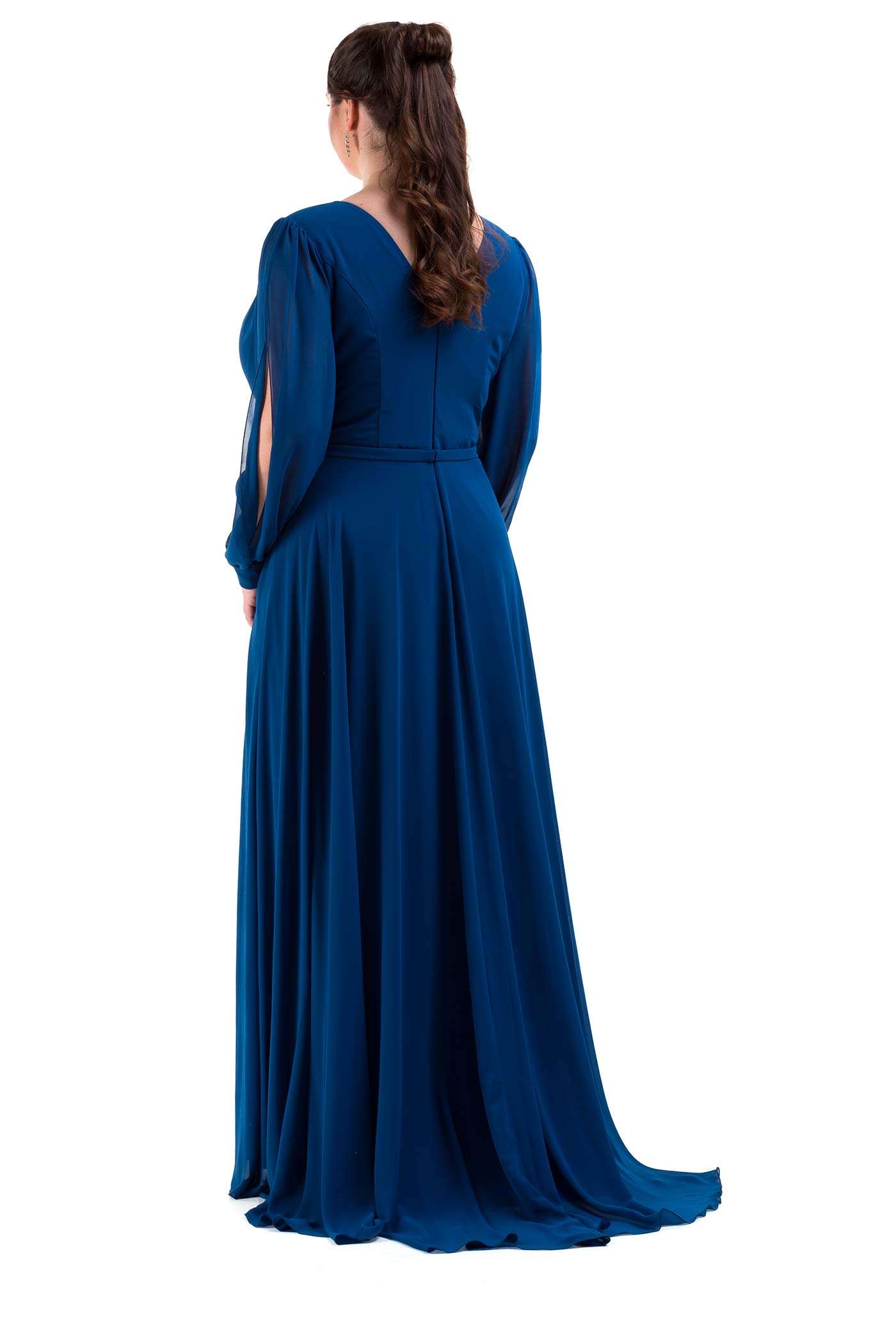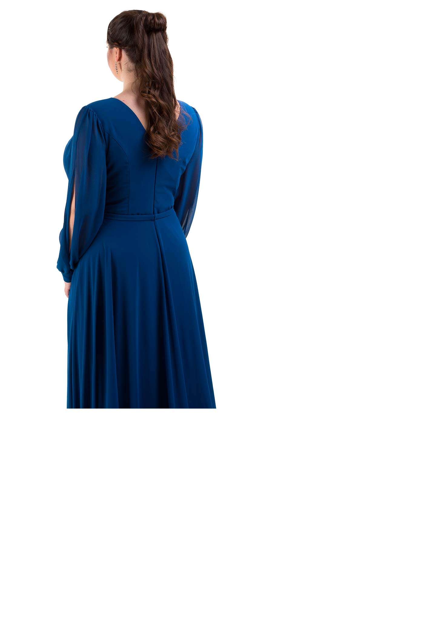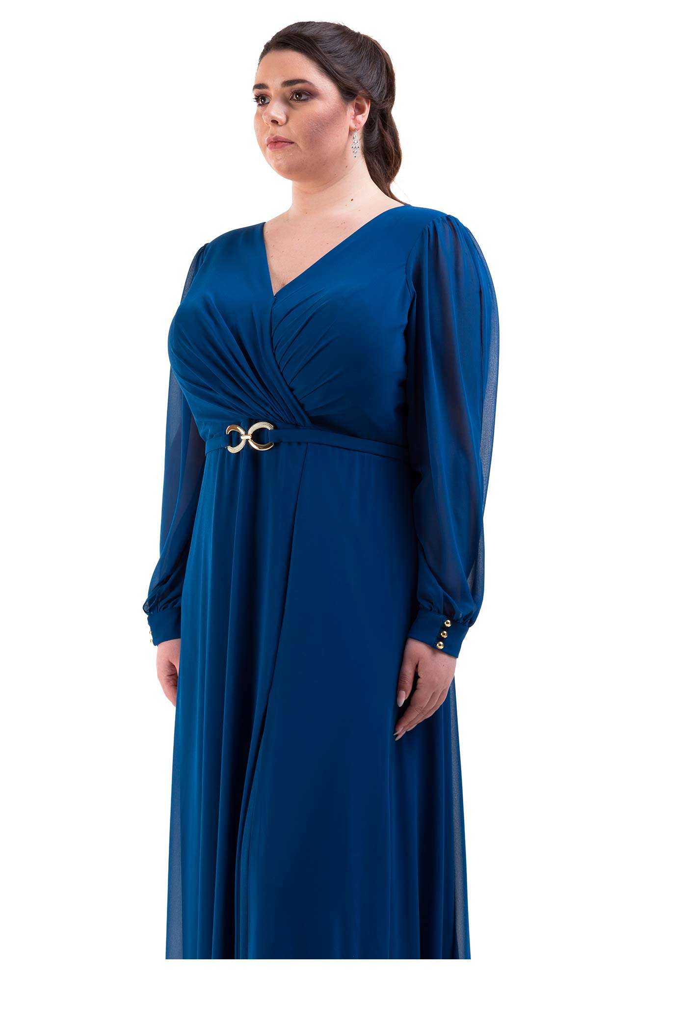 Abito elegante in chiffon. Un modello con scollo a V e maniche lunghe con apertura centrale. Una delicata cinta con dettaglio oro evidenzia il punto vita.