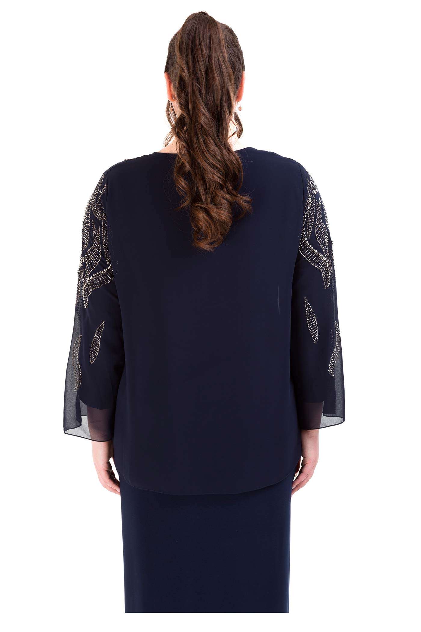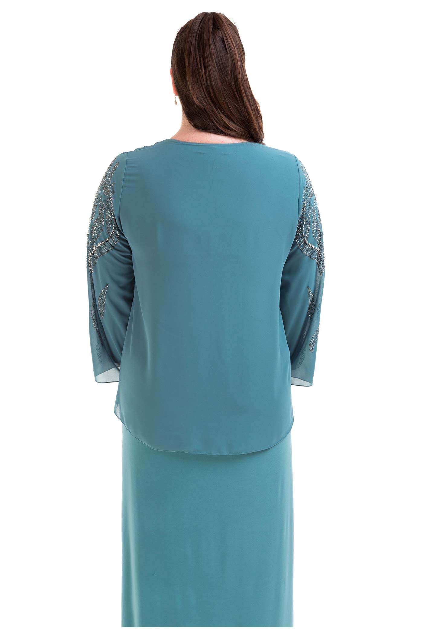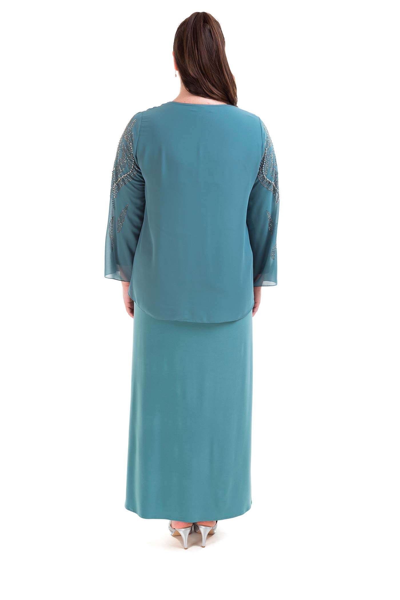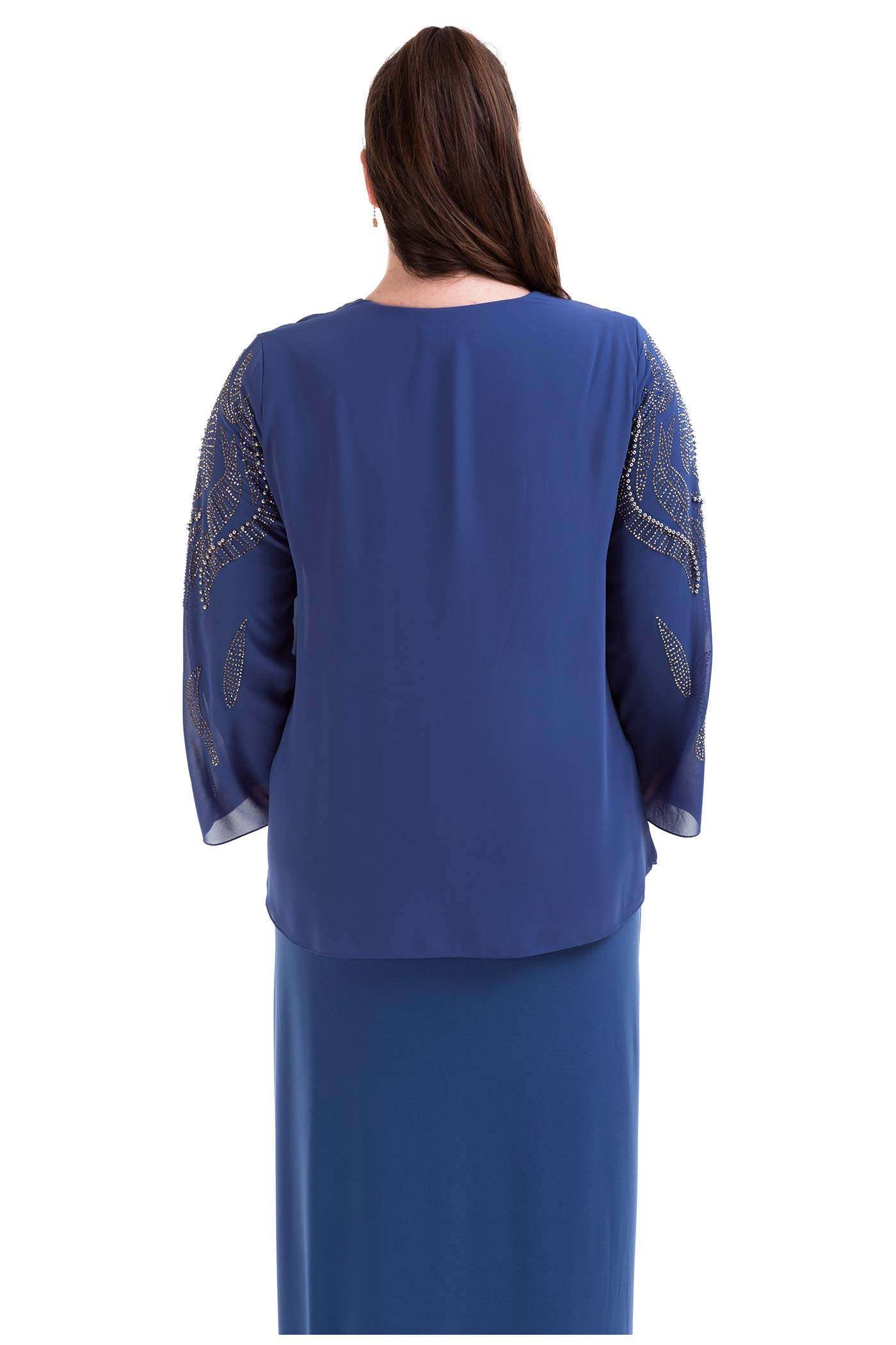 Abito elegante in Jersey e Chiffon. Un modello dalle linee semplici con mantellina con maniche lunghe e ricamo luminoso. - Additional Information