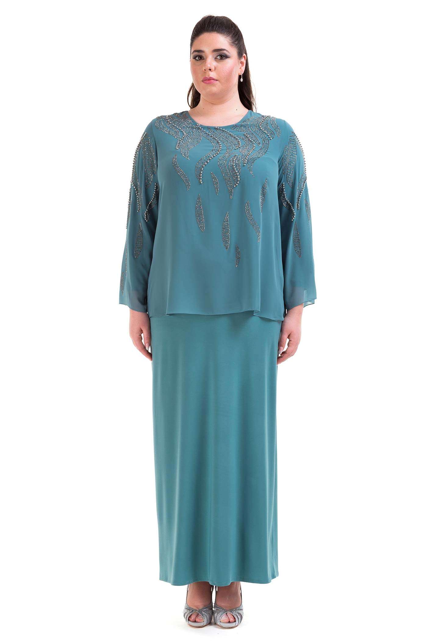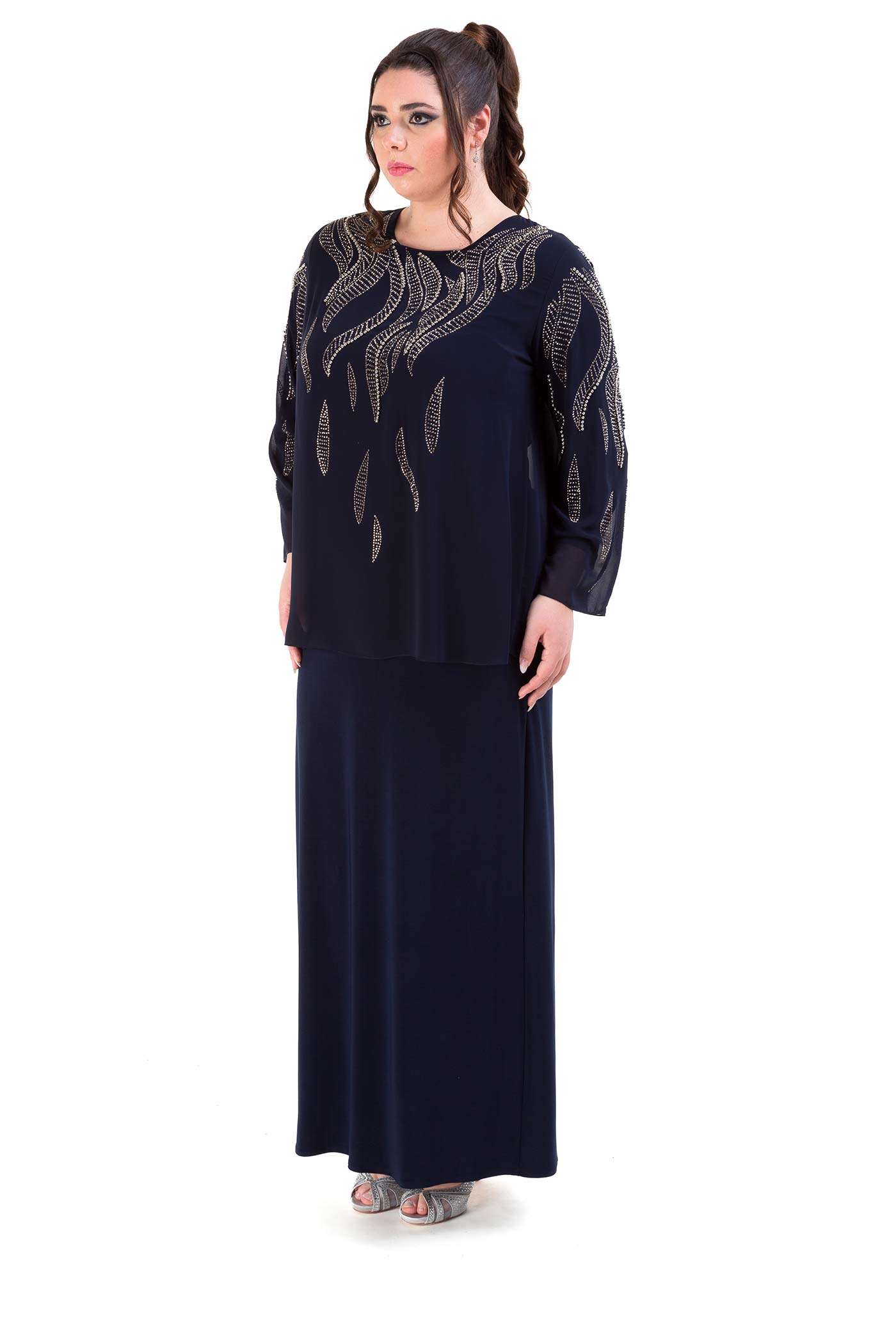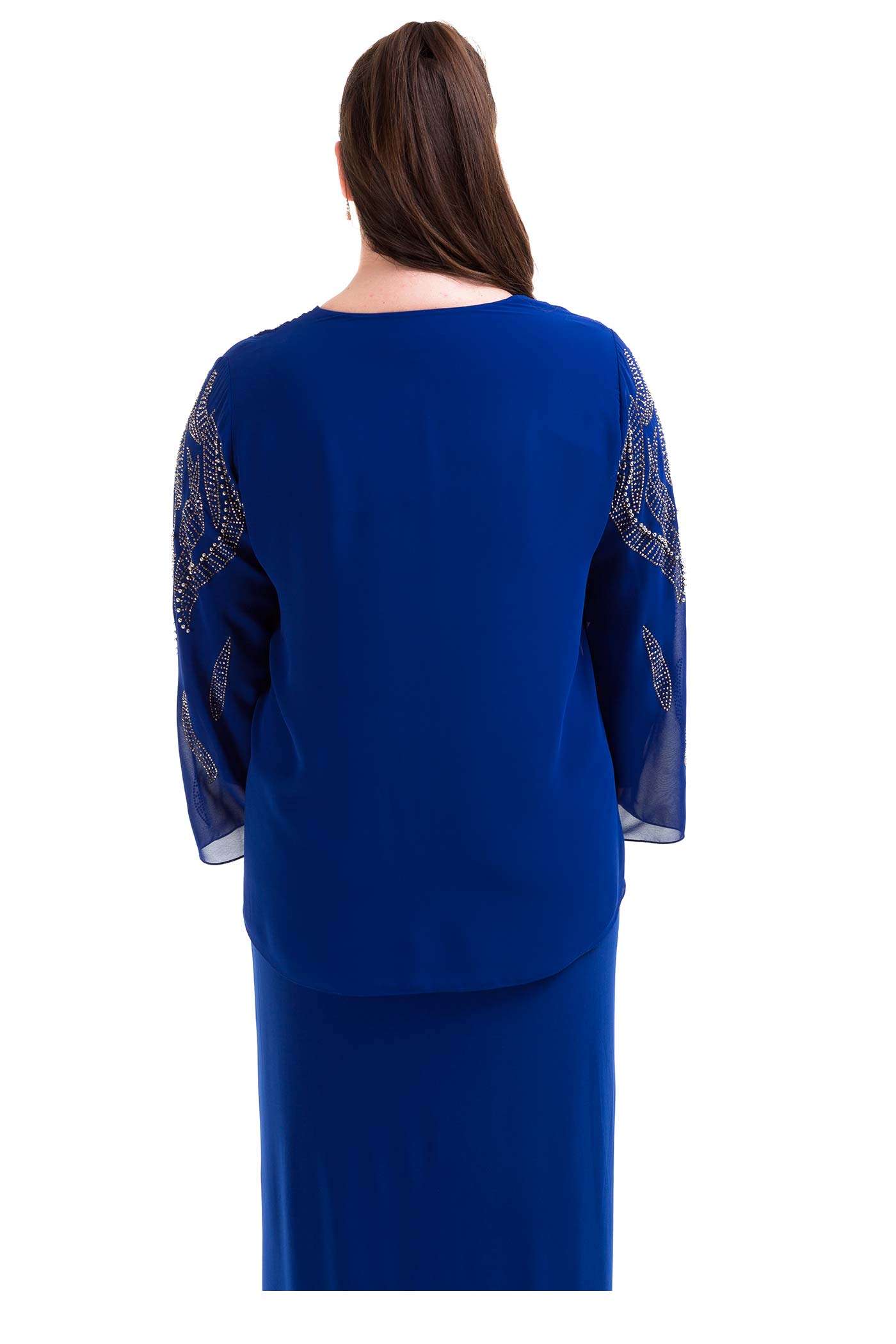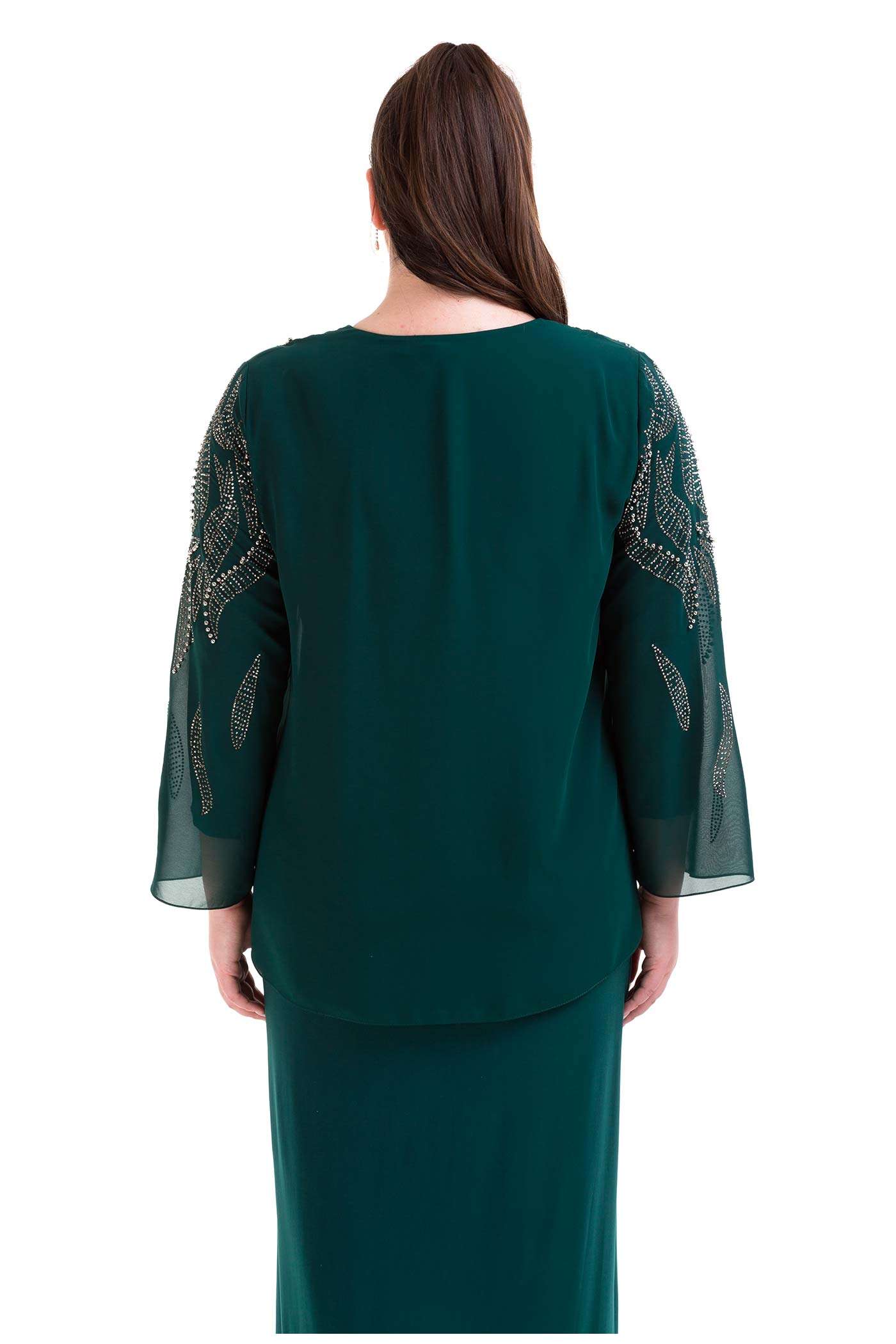 Abito elegante in Jersey e Chiffon. Un modello dalle linee semplici con mantellina con maniche lunghe e ricamo luminoso. - Additional Information