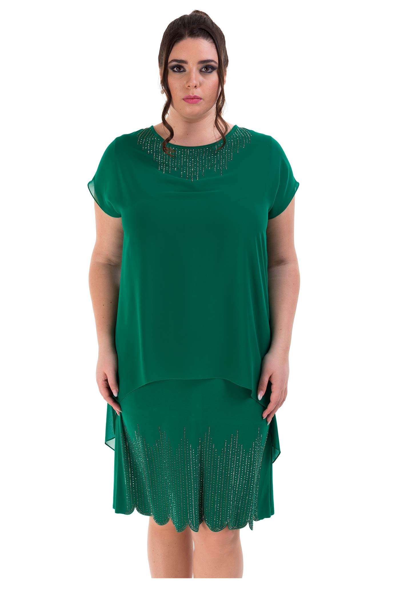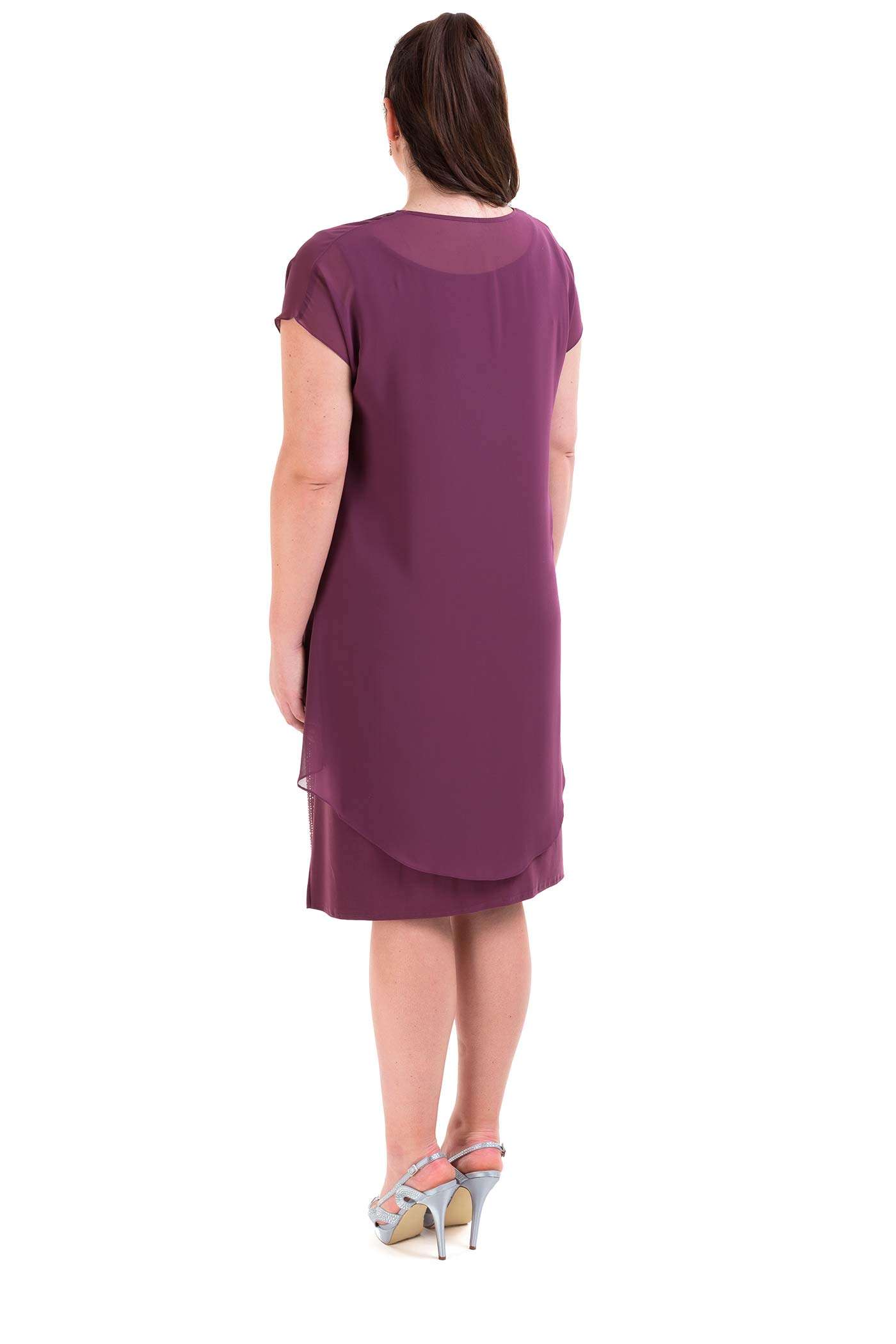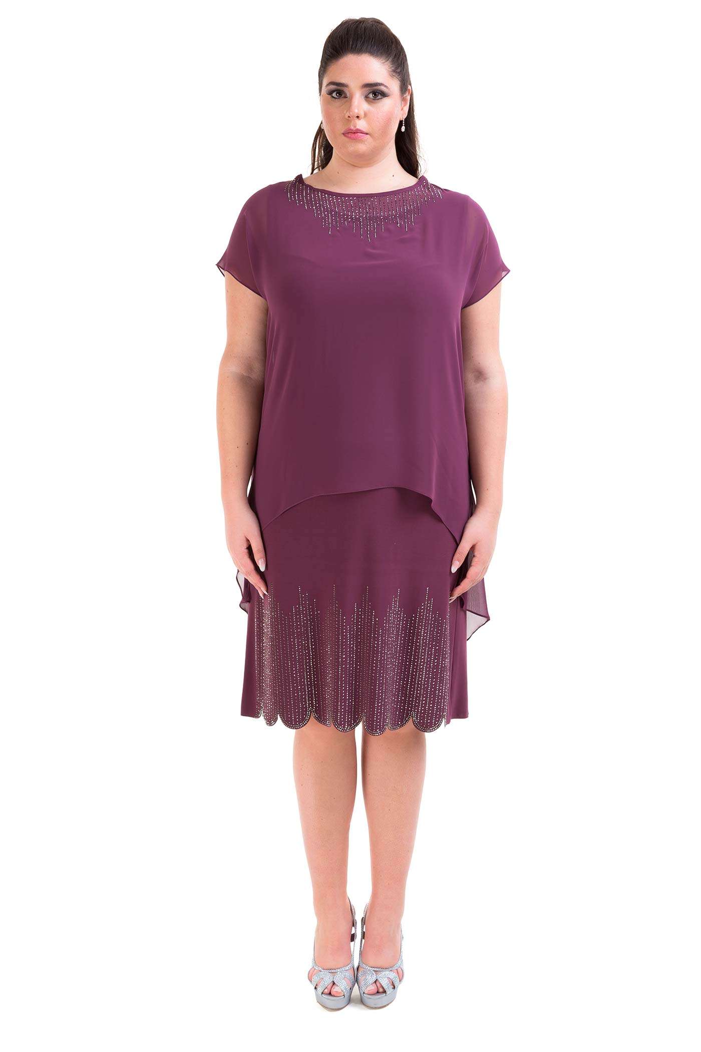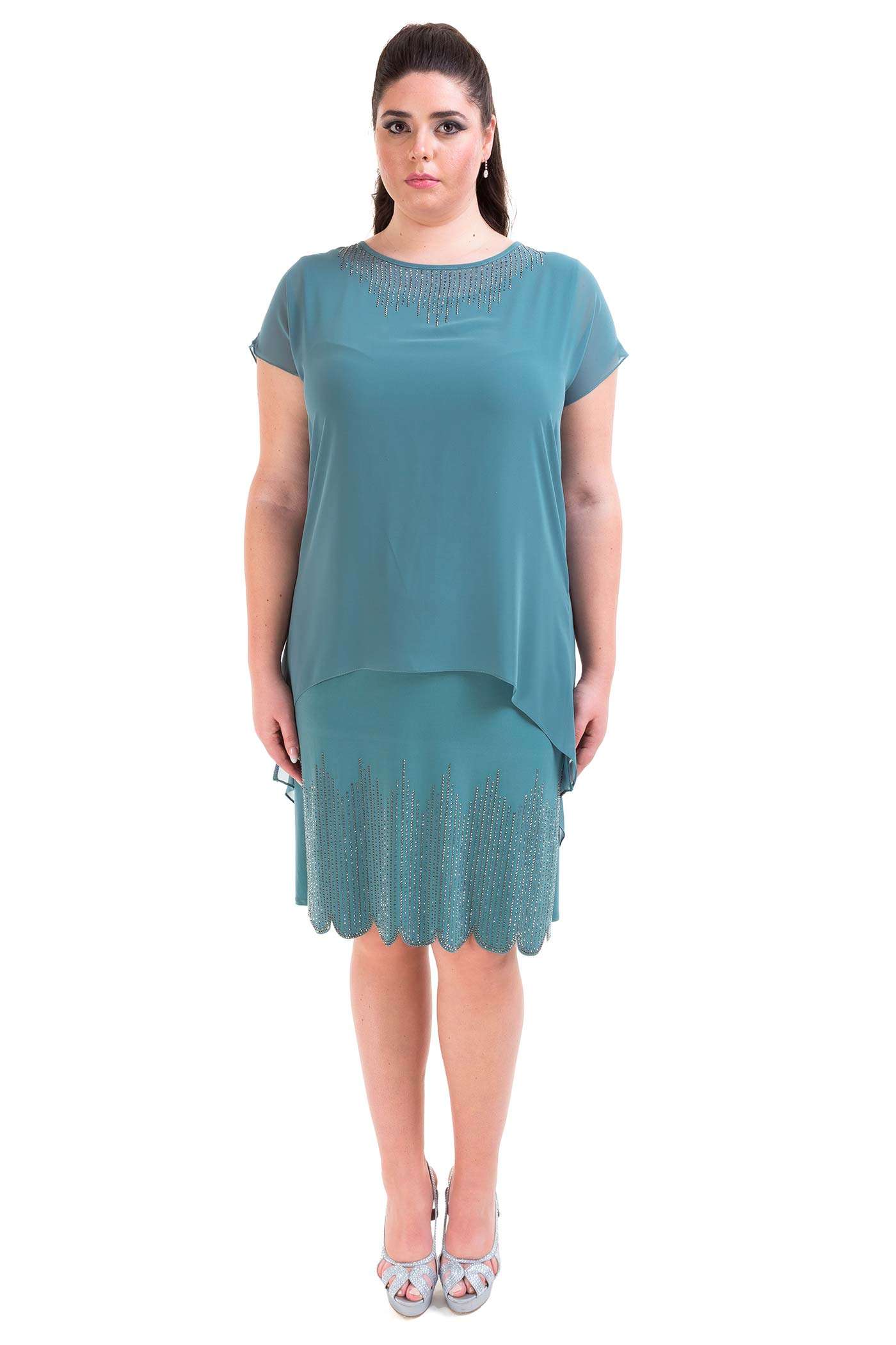 Abito corto in Jersey e Chiffon. Un modello impreziosita da strass che ornano il girocollo e l'orlo della gonna creando luce e movimento.