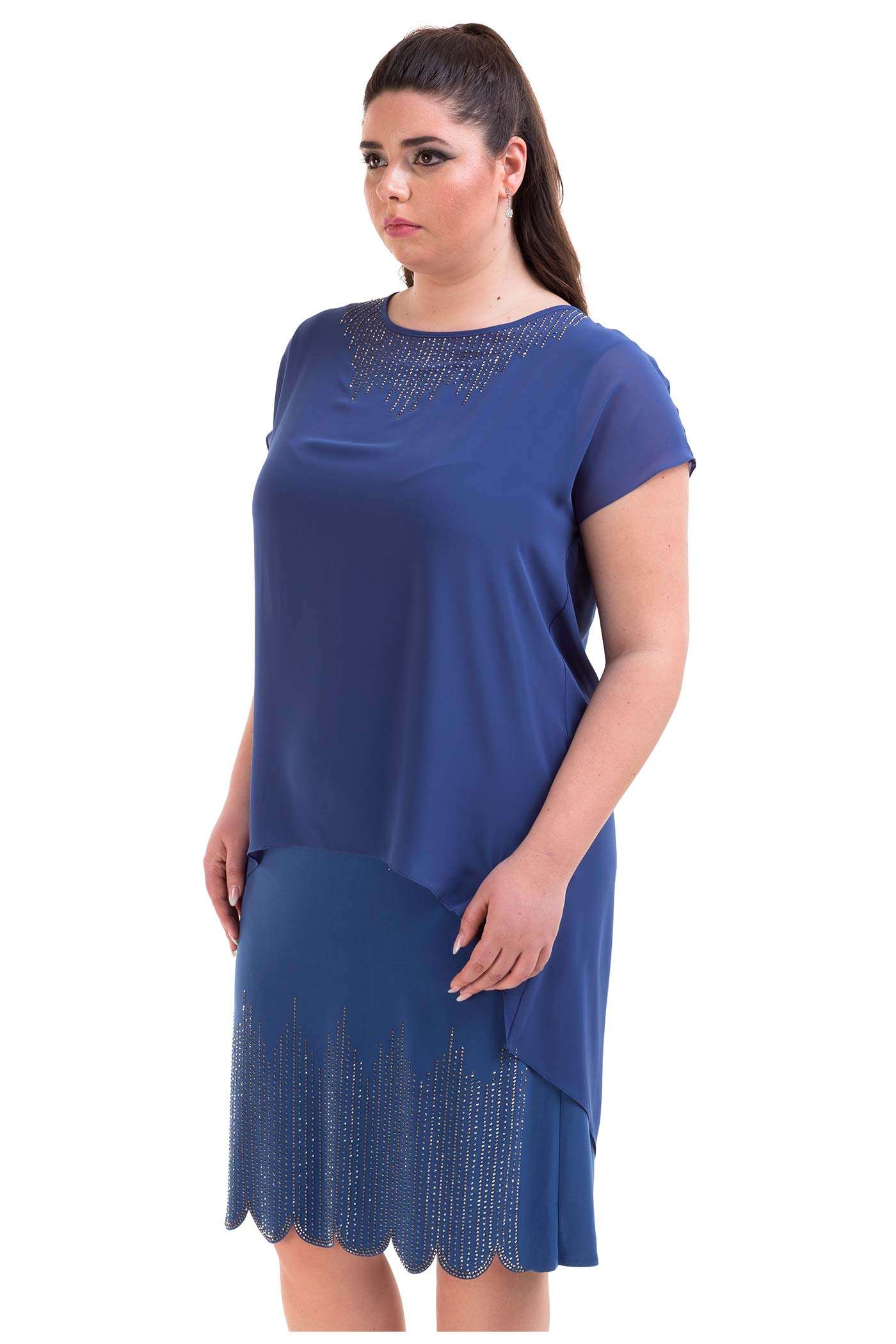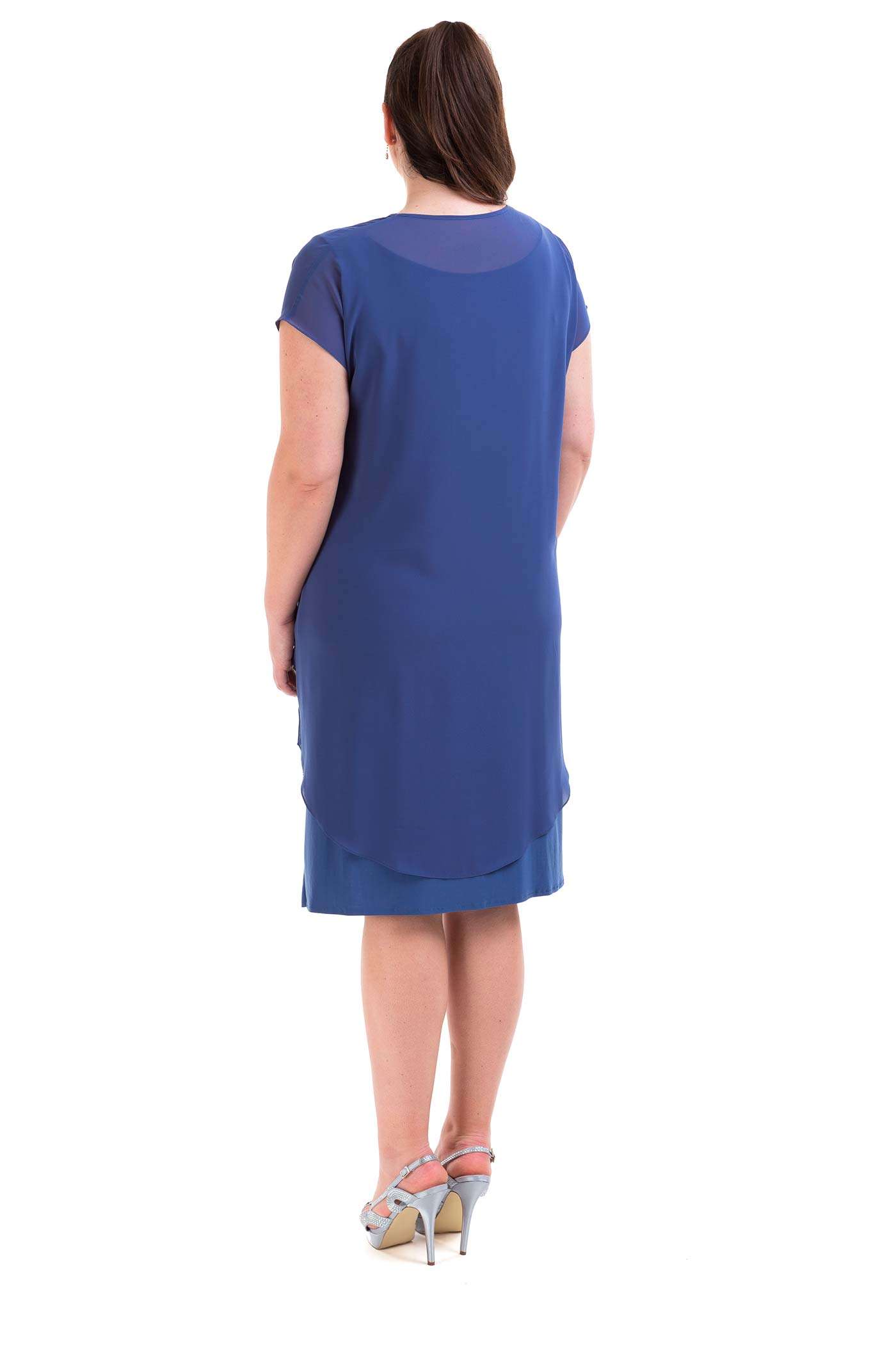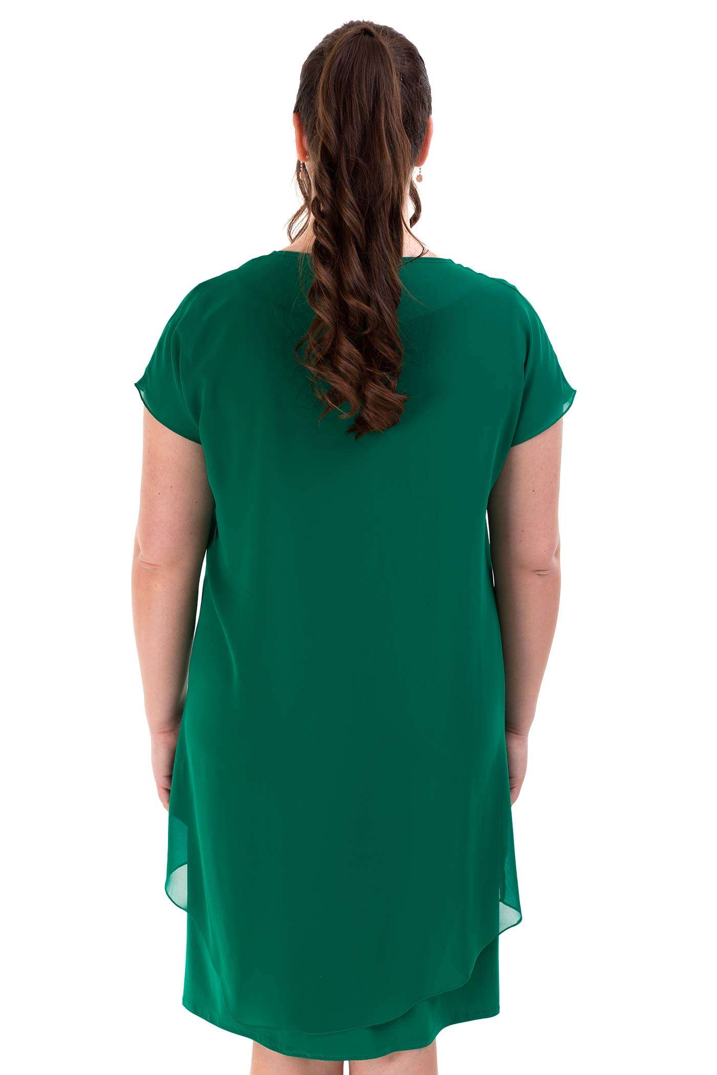 Abito corto in Jersey e Chiffon. Un modello impreziosita da strass che ornano il girocollo e l'orlo della gonna creando luce e movimento.