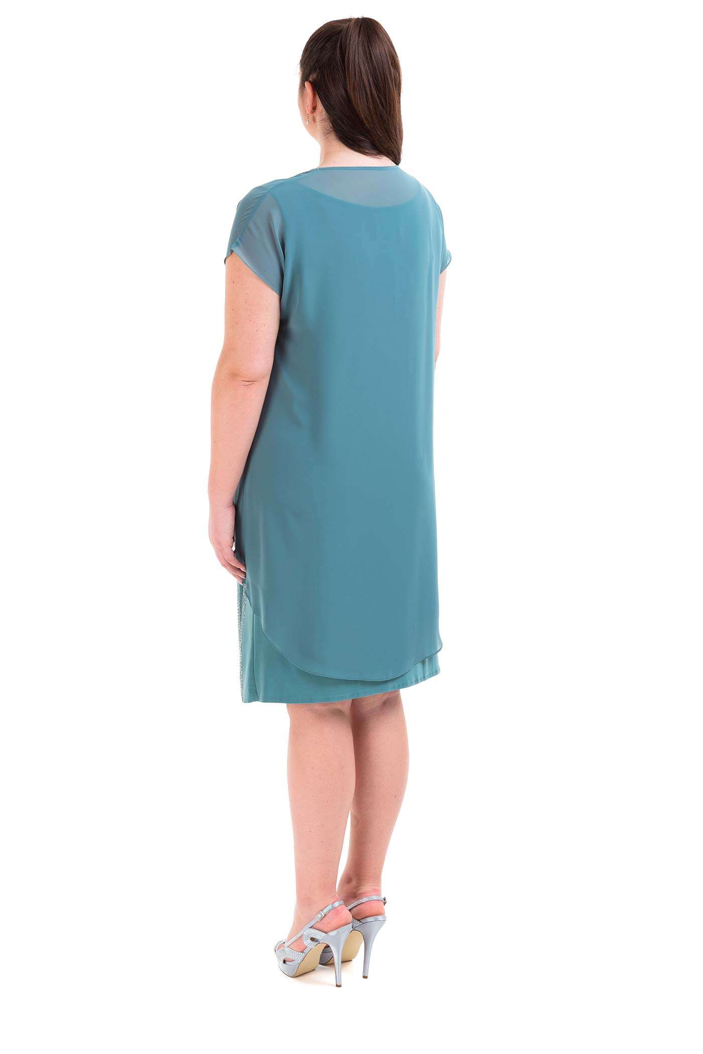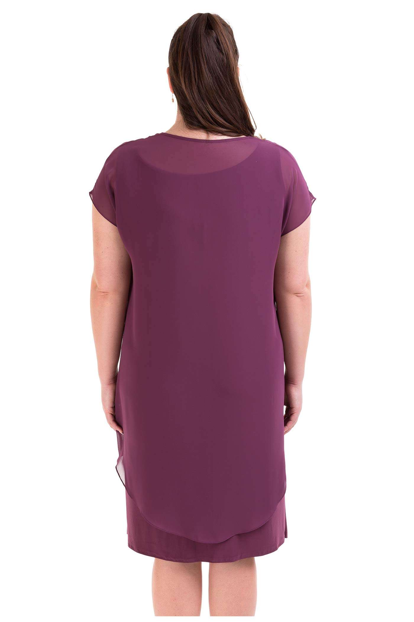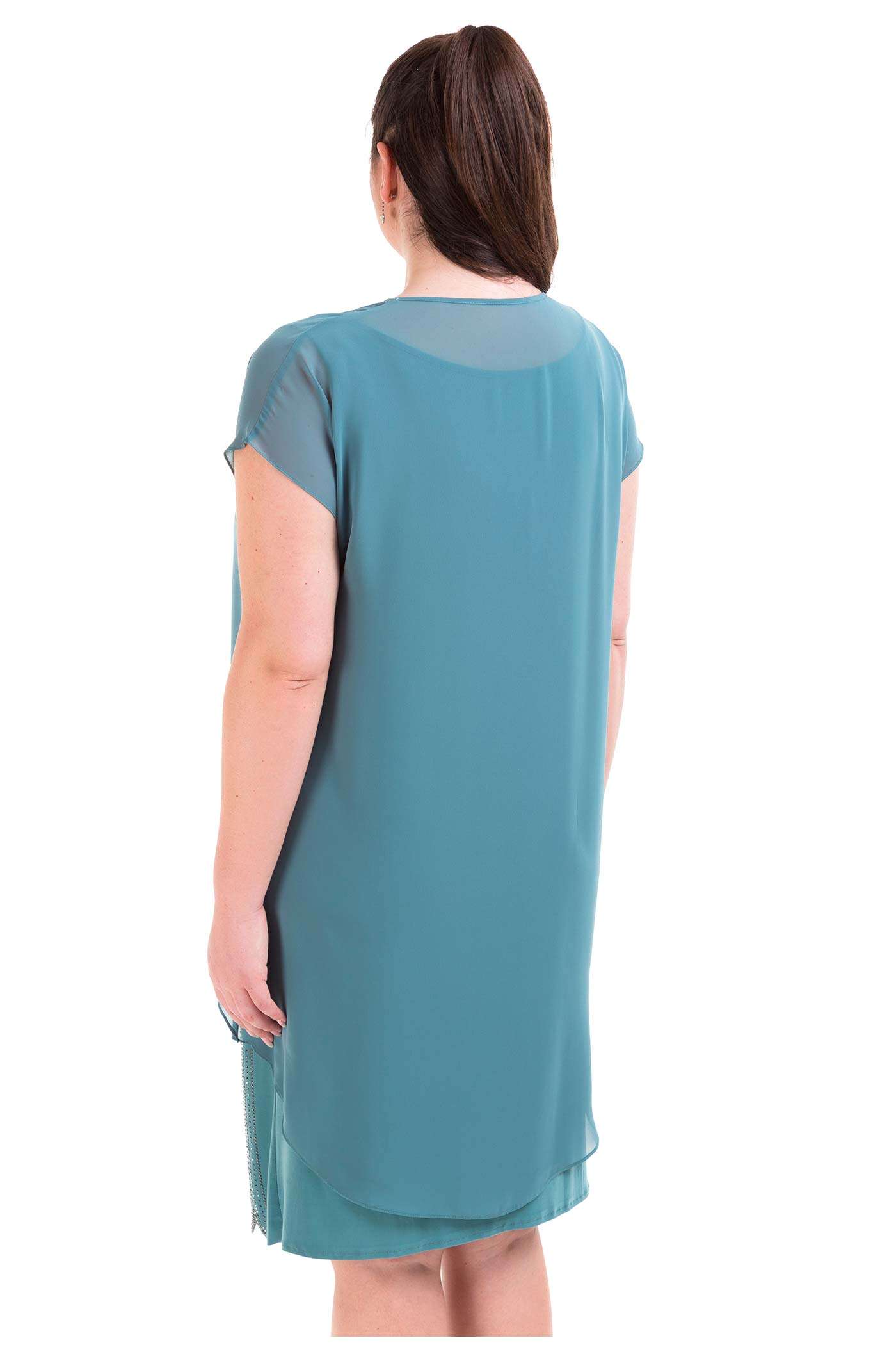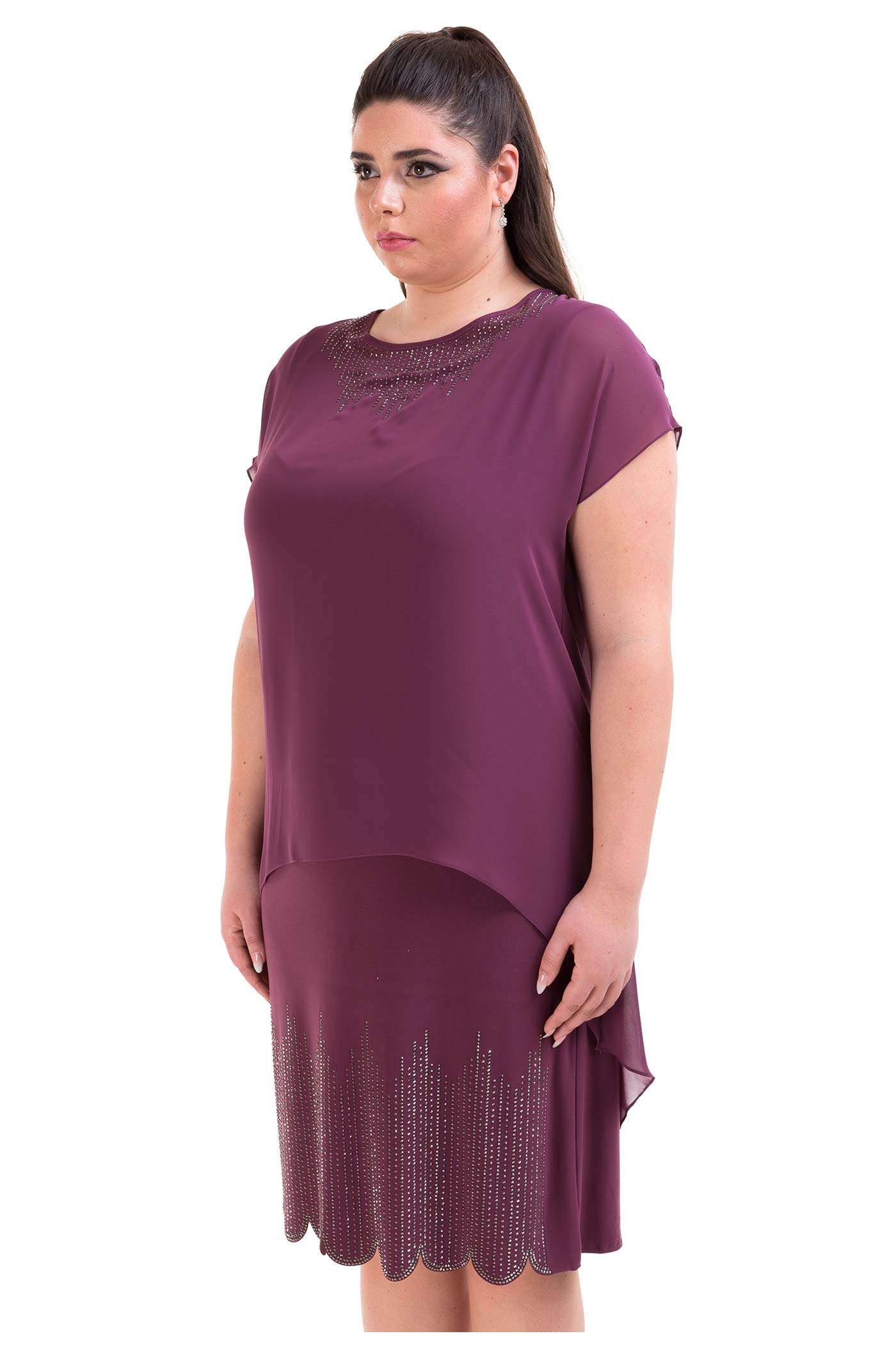 Abito corto in Jersey e Chiffon. Un modello impreziosita da strass che ornano il girocollo e l'orlo della gonna creando luce e movimento.